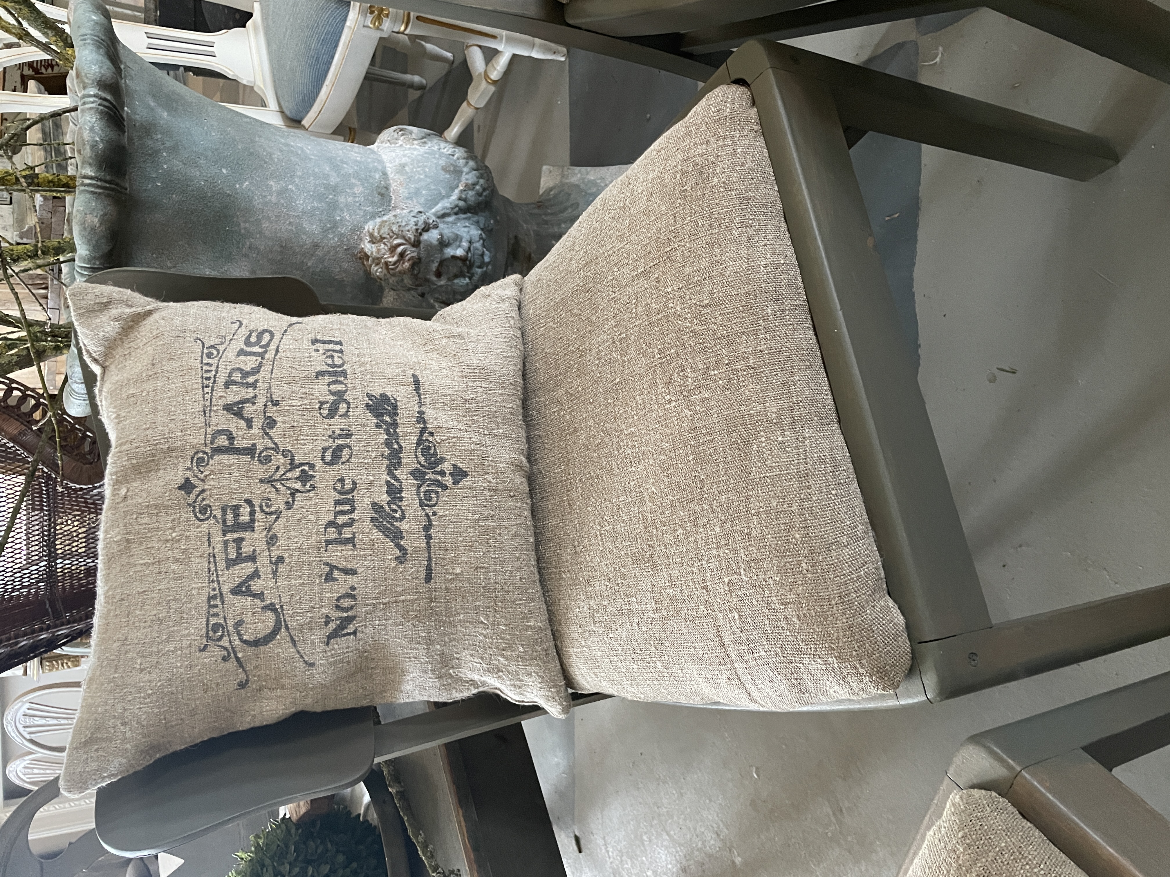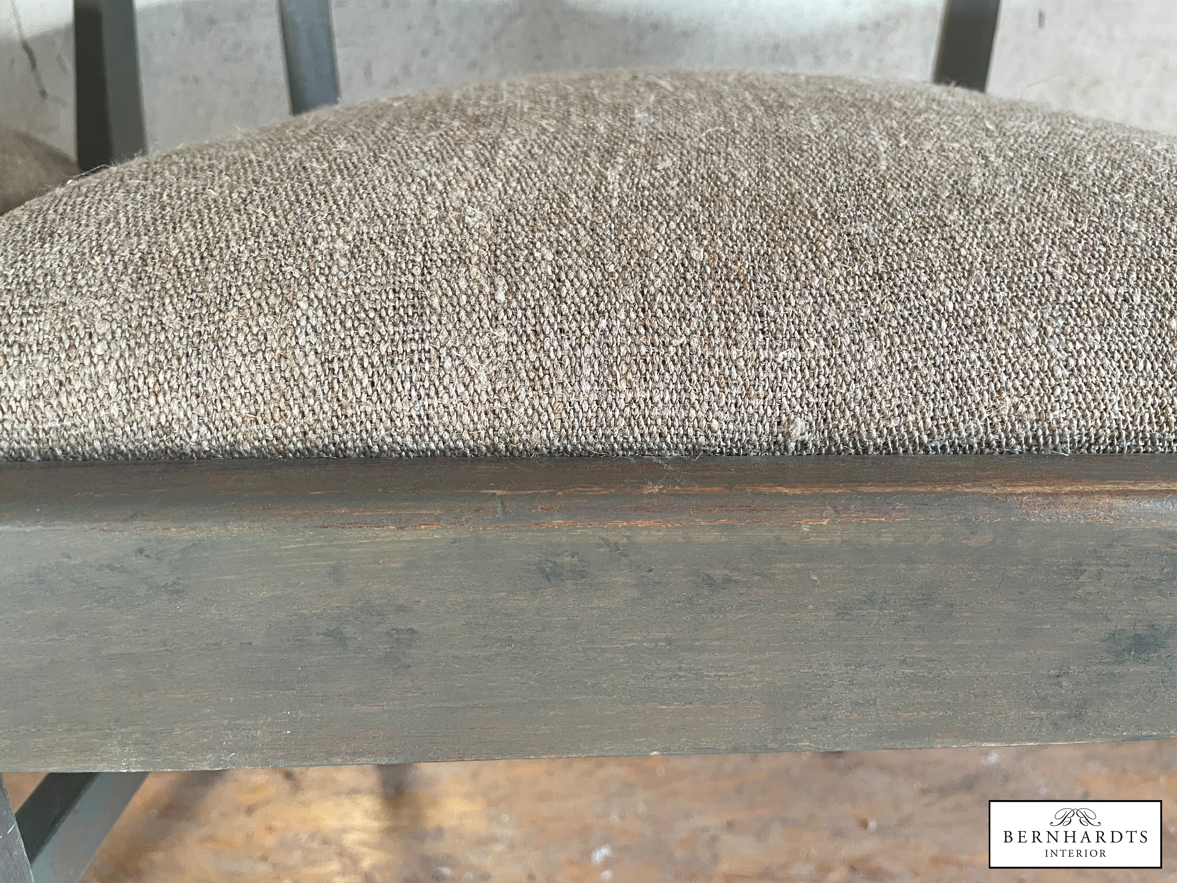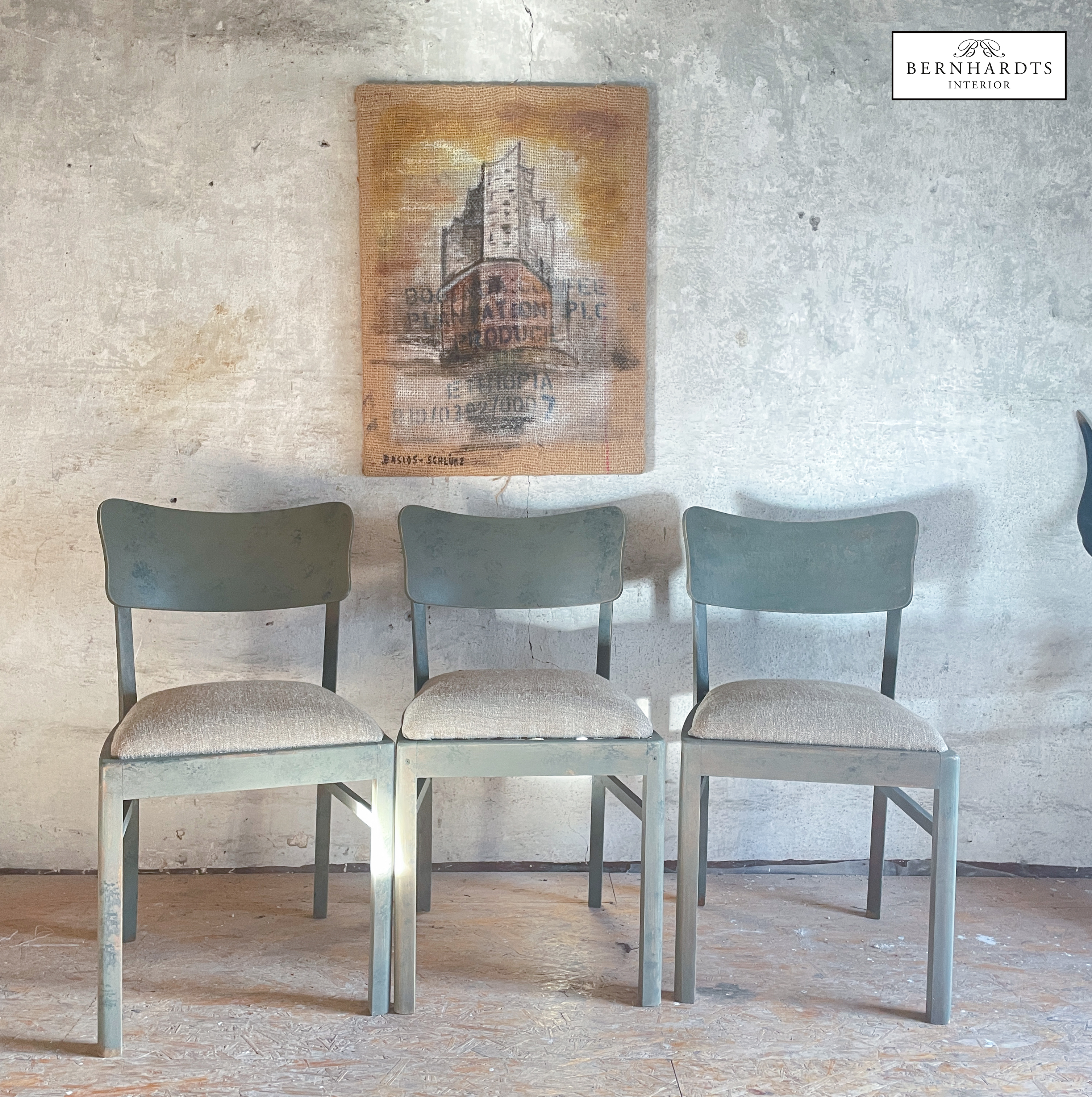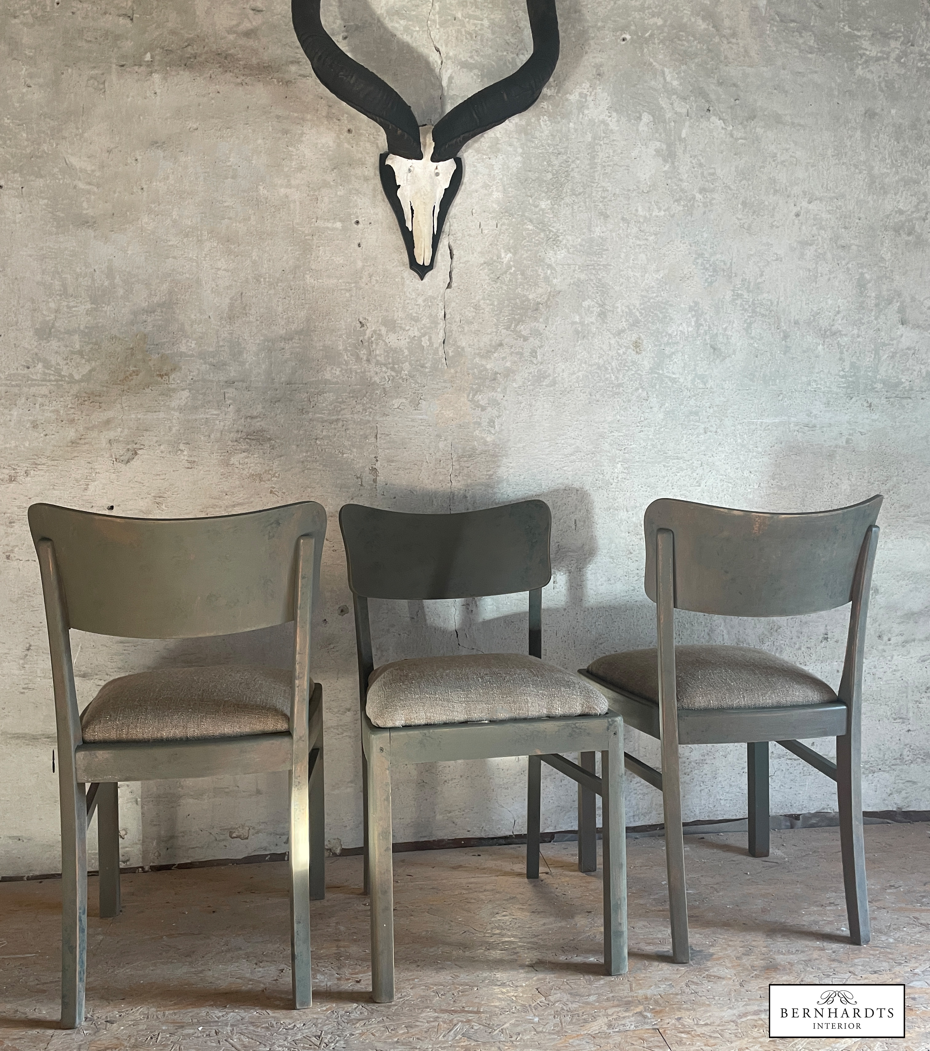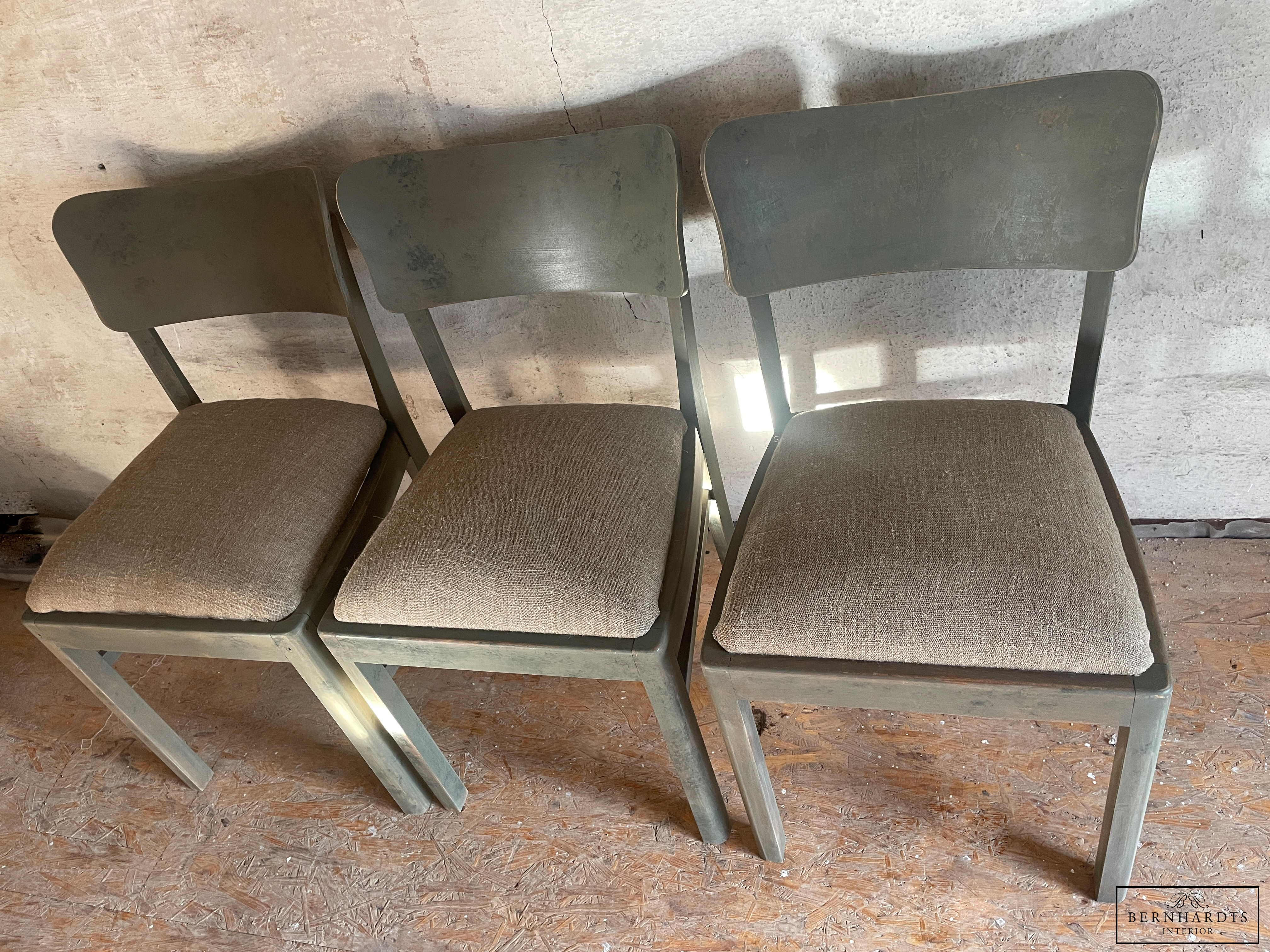 3 norddeutsche Stühle aus den 20er Jahren im Industrial Stil restauriert und in unserer hauseigenen Werkstatt mit Farrow and Ball Mouseback & Olive gefasst. Der Leinenbezug wurde aus altem Leinen erneuert. Die Stühle haben einen Sprungfederkern in der Polsterung und sind sehr bequem. Ein Stuhl hat eine Schaumstoffpolsterung , die aber ebenso bequem ist und keinen merklichen Unterschied ergibt.
