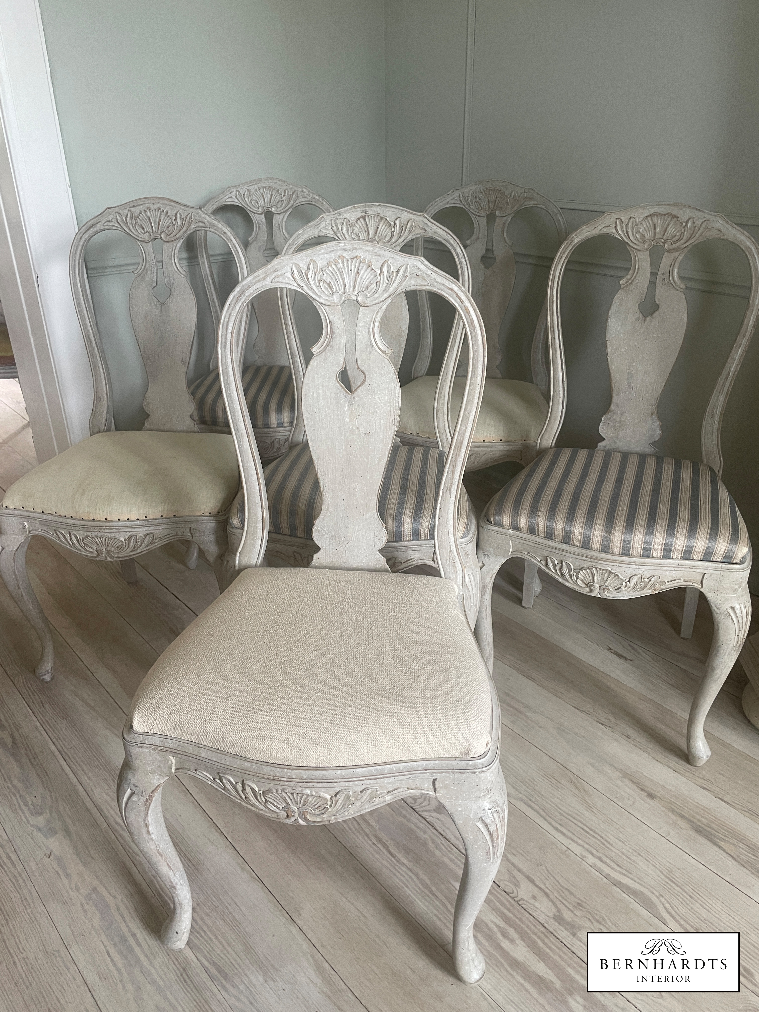 6 Schwedische Stühle im Rokokostil/Barockstil. Die Stühle wurden in unserer hauseigenen werkstatt restauriert und nach historischer Vorlage neu Gefasst und Patiniert. Der Bezugsstoff kann gegen Aufpreis frei gewählt werden, der helle Leinen Bezug ist im Preis mit inbegriffen.