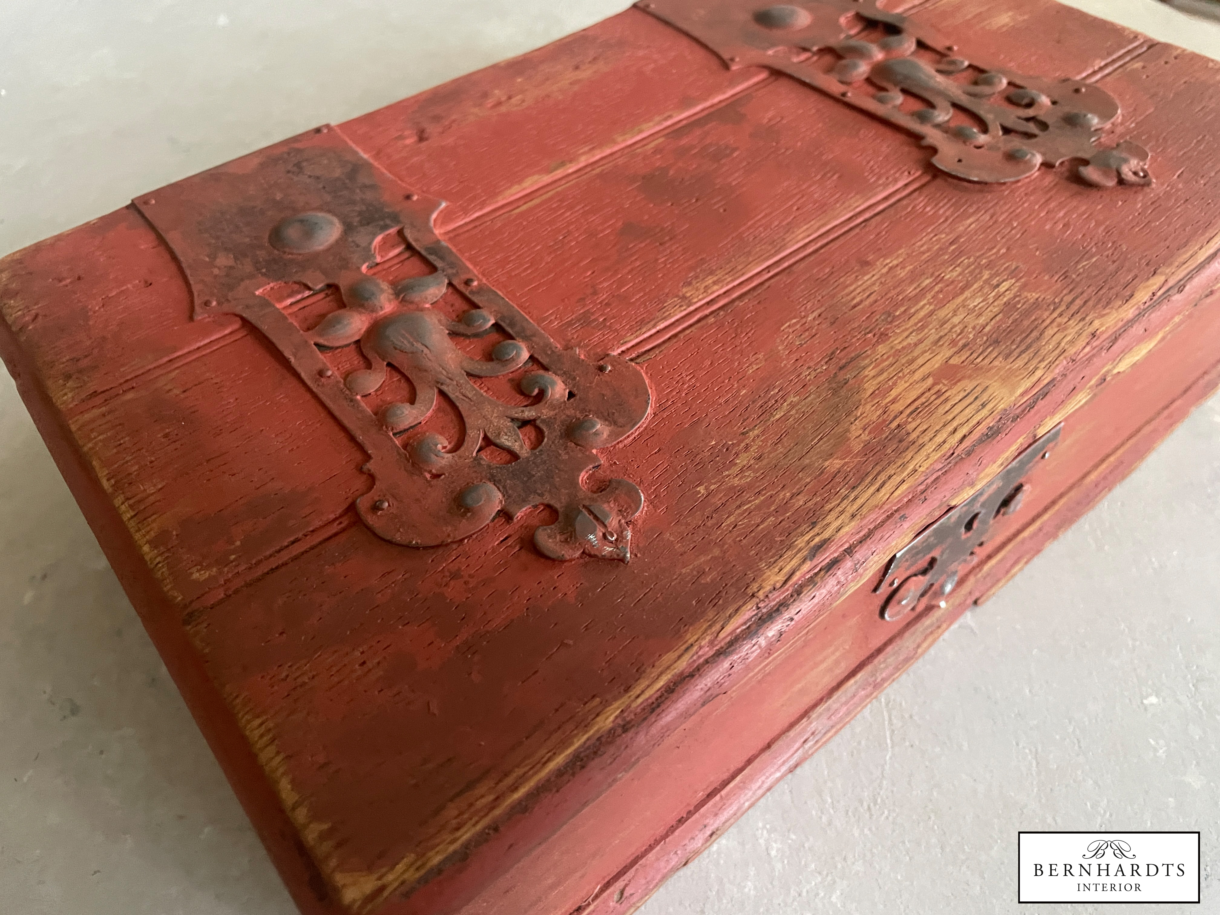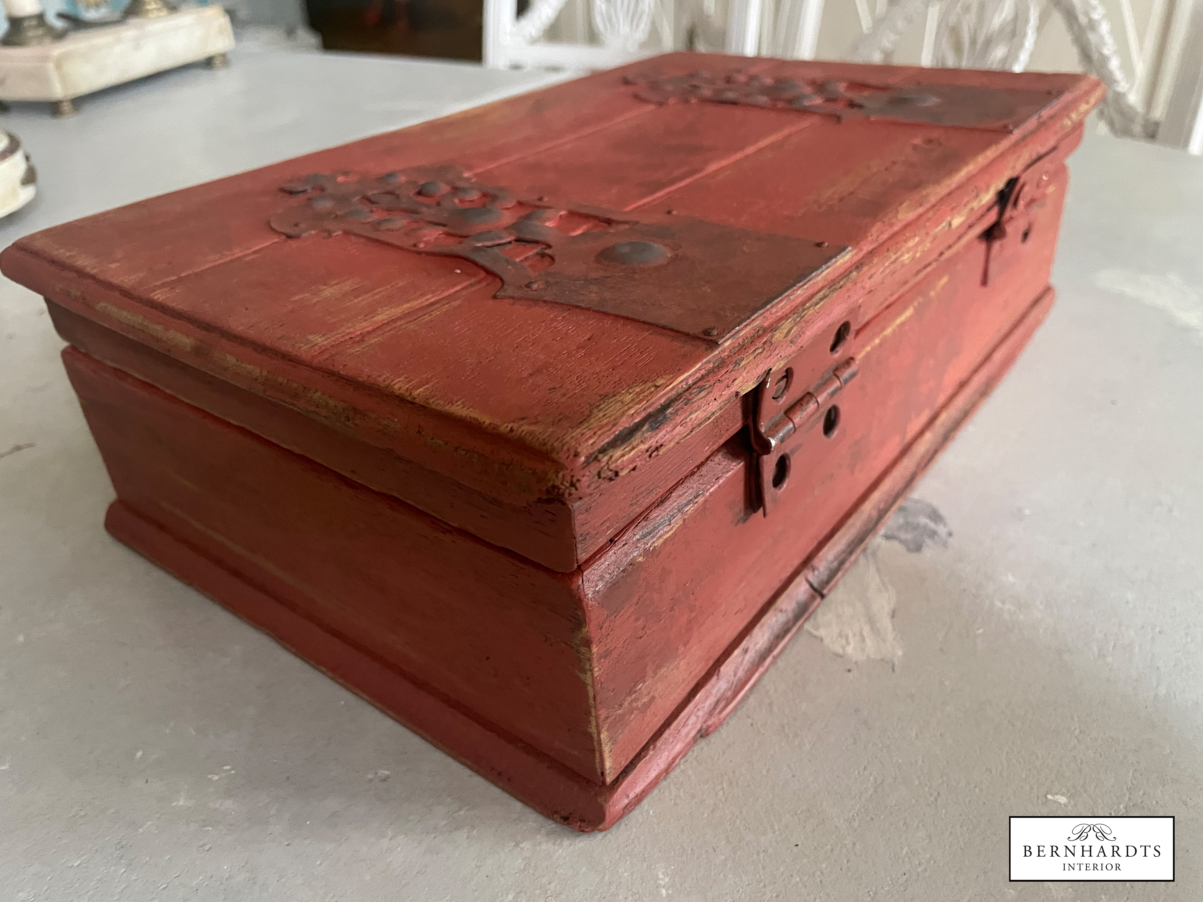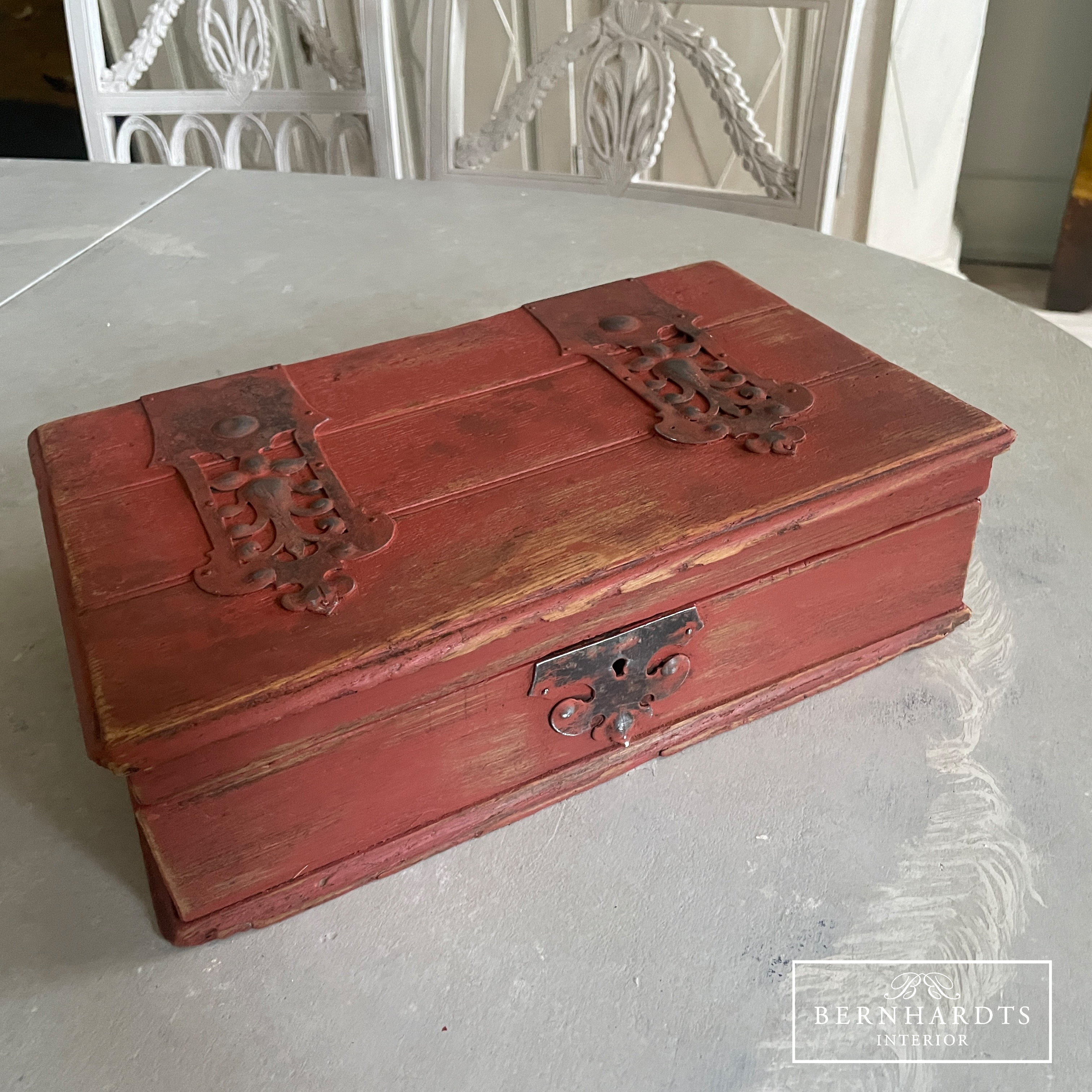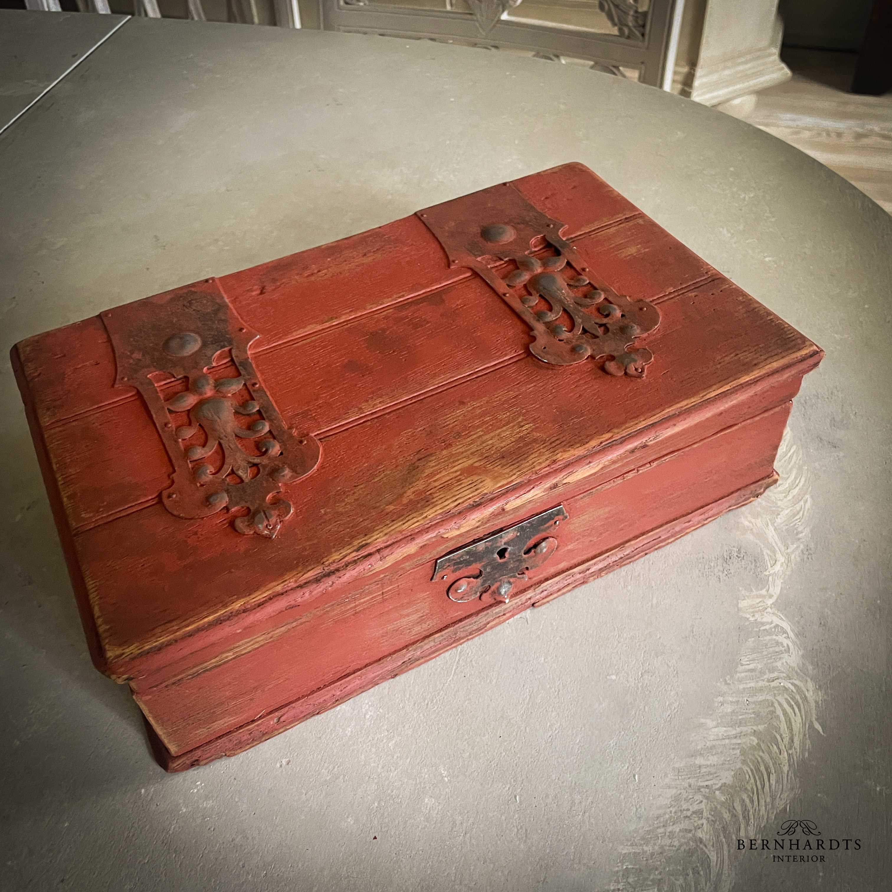 Farblich gefasste Barockschatulle um 1800. Die Schatulle befindet sich im Originalzustand und wurde in unserer Werkastatt farblich gefasst. Schlüssel ist nicht vorhanden. Beschläge sind original. Diese dekorative Schatulle ist vielseitig einsetzbar und dekoriert jeden Wohnraum.