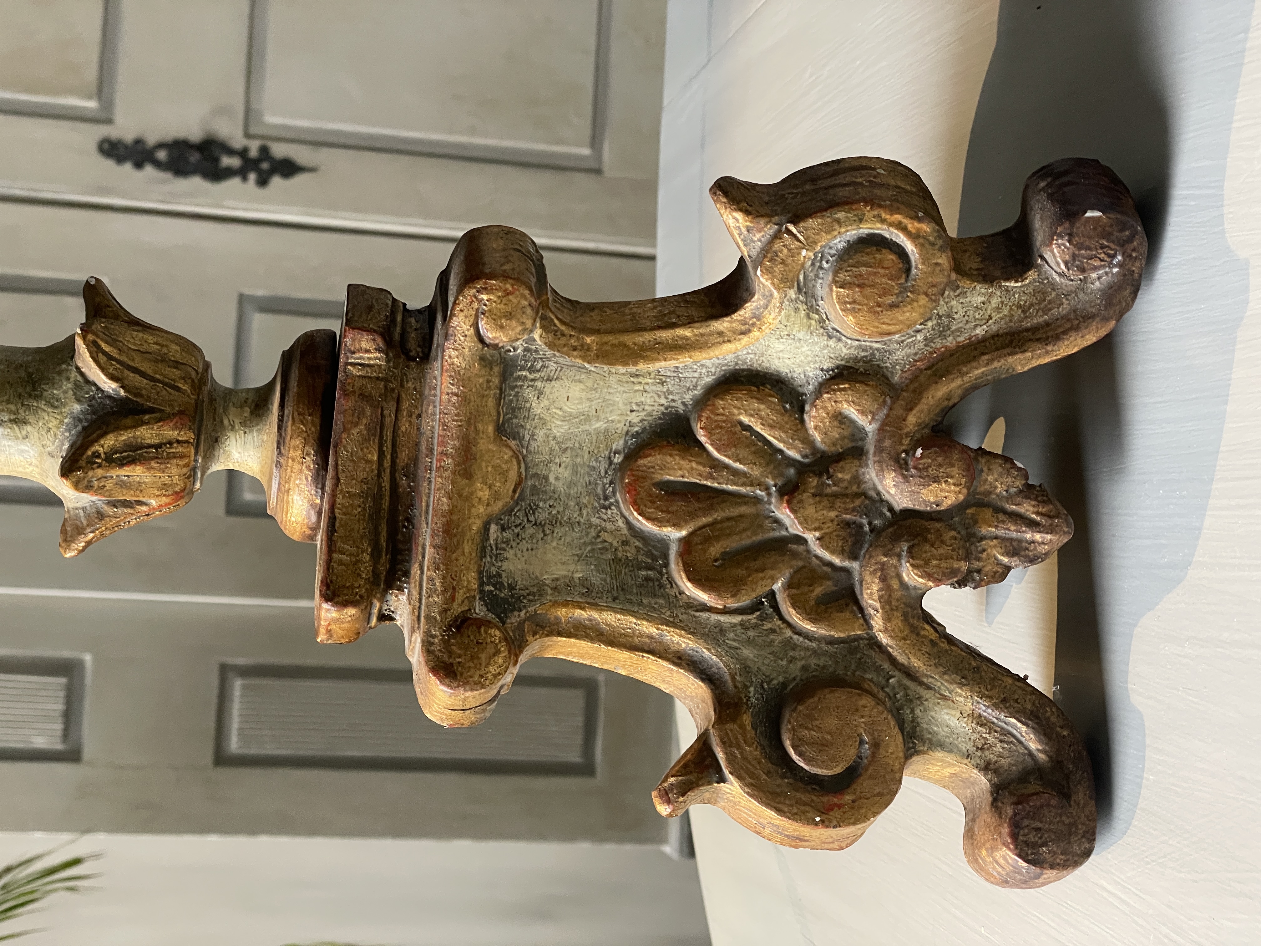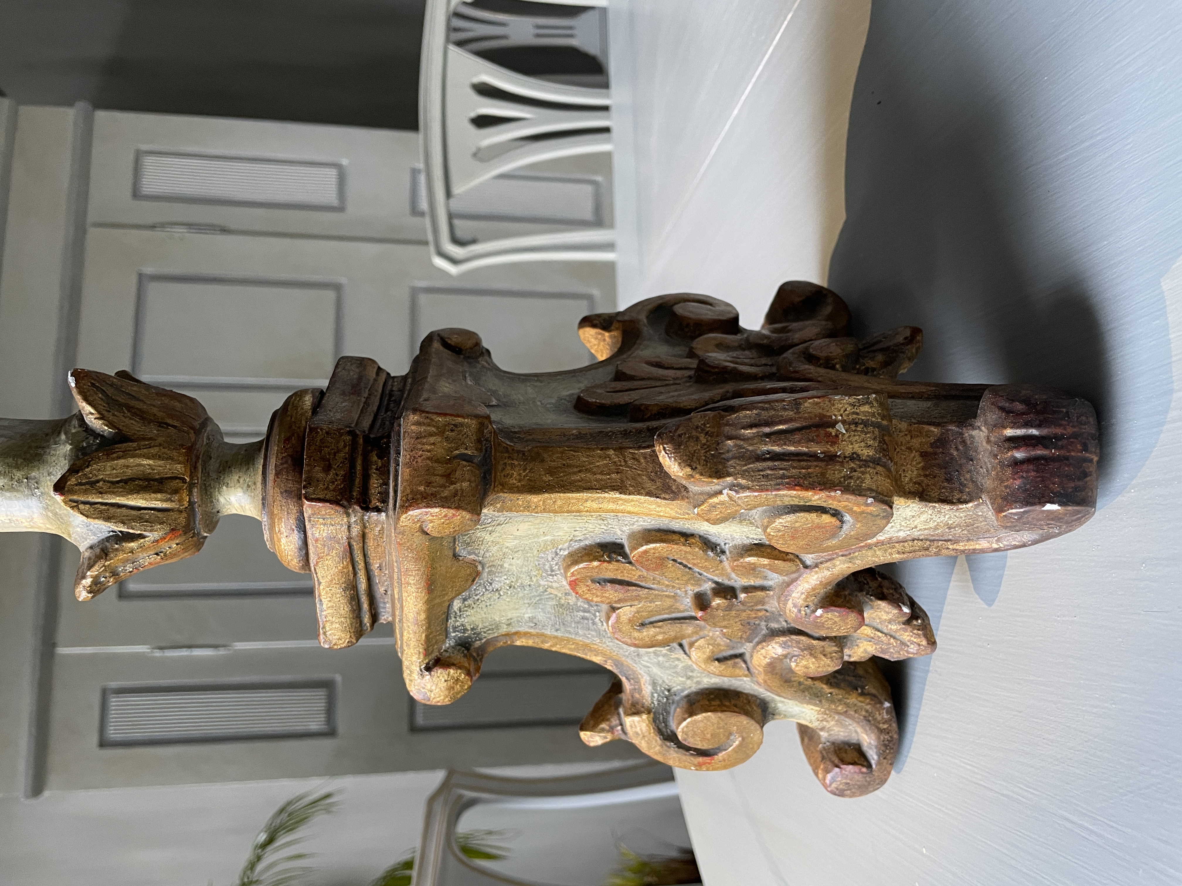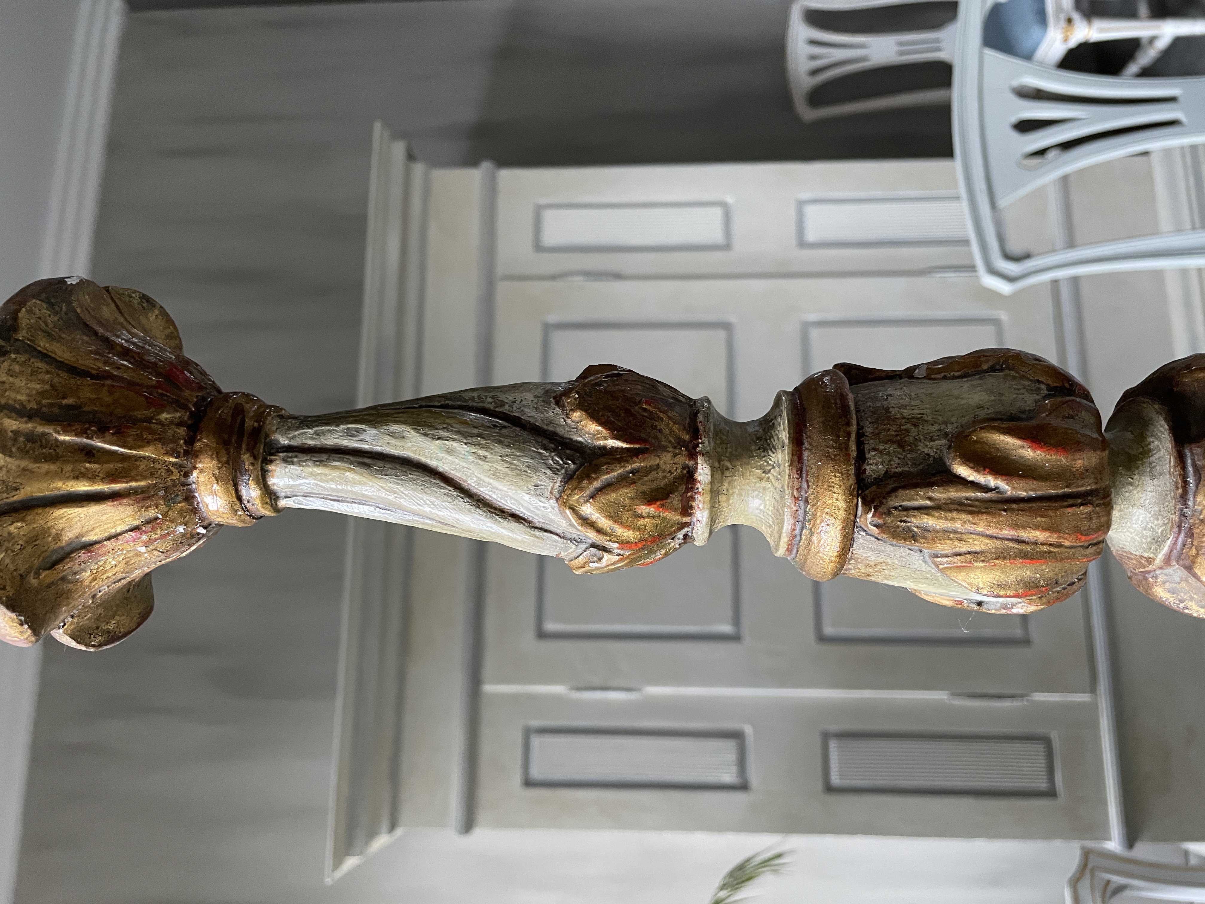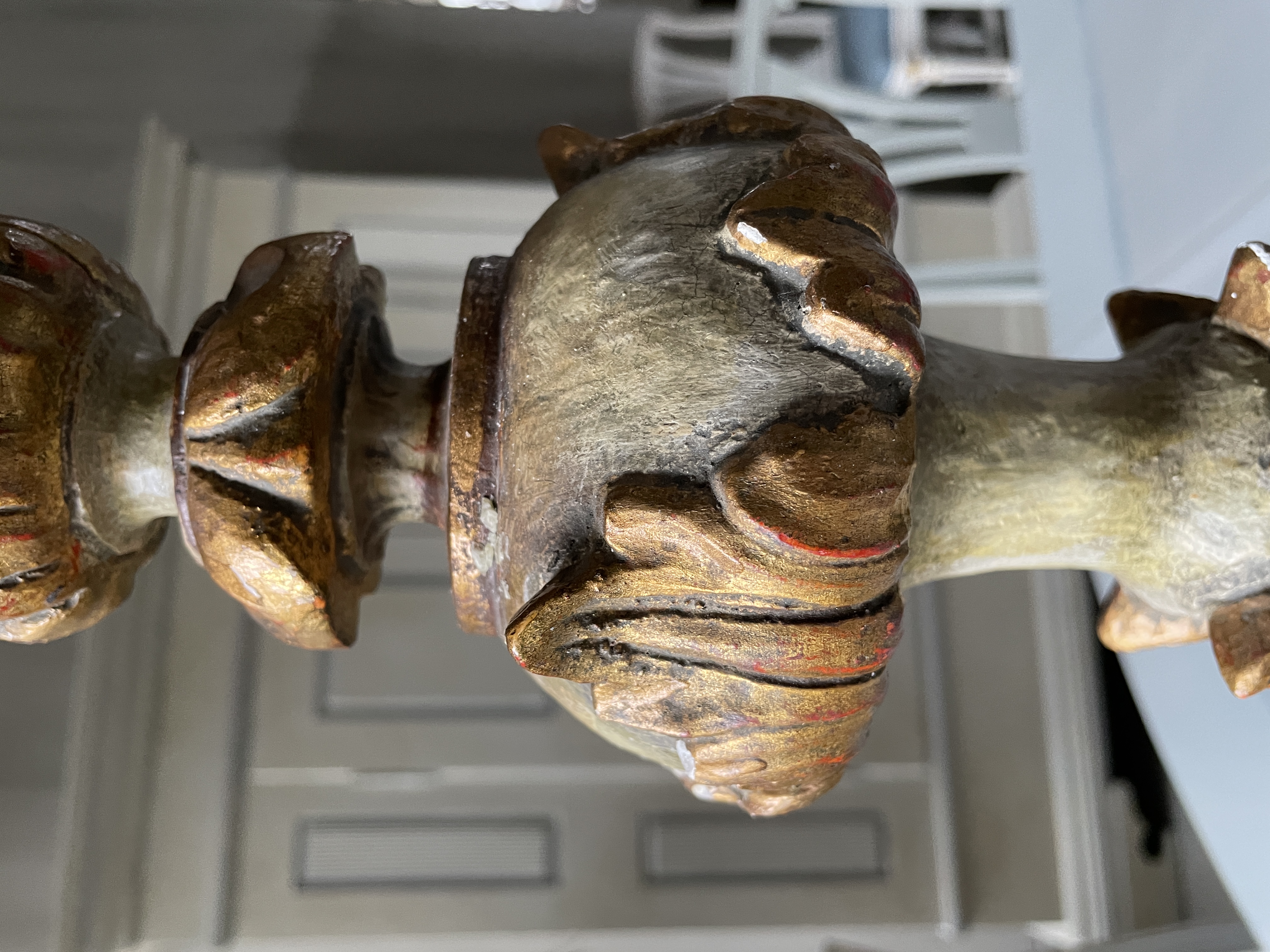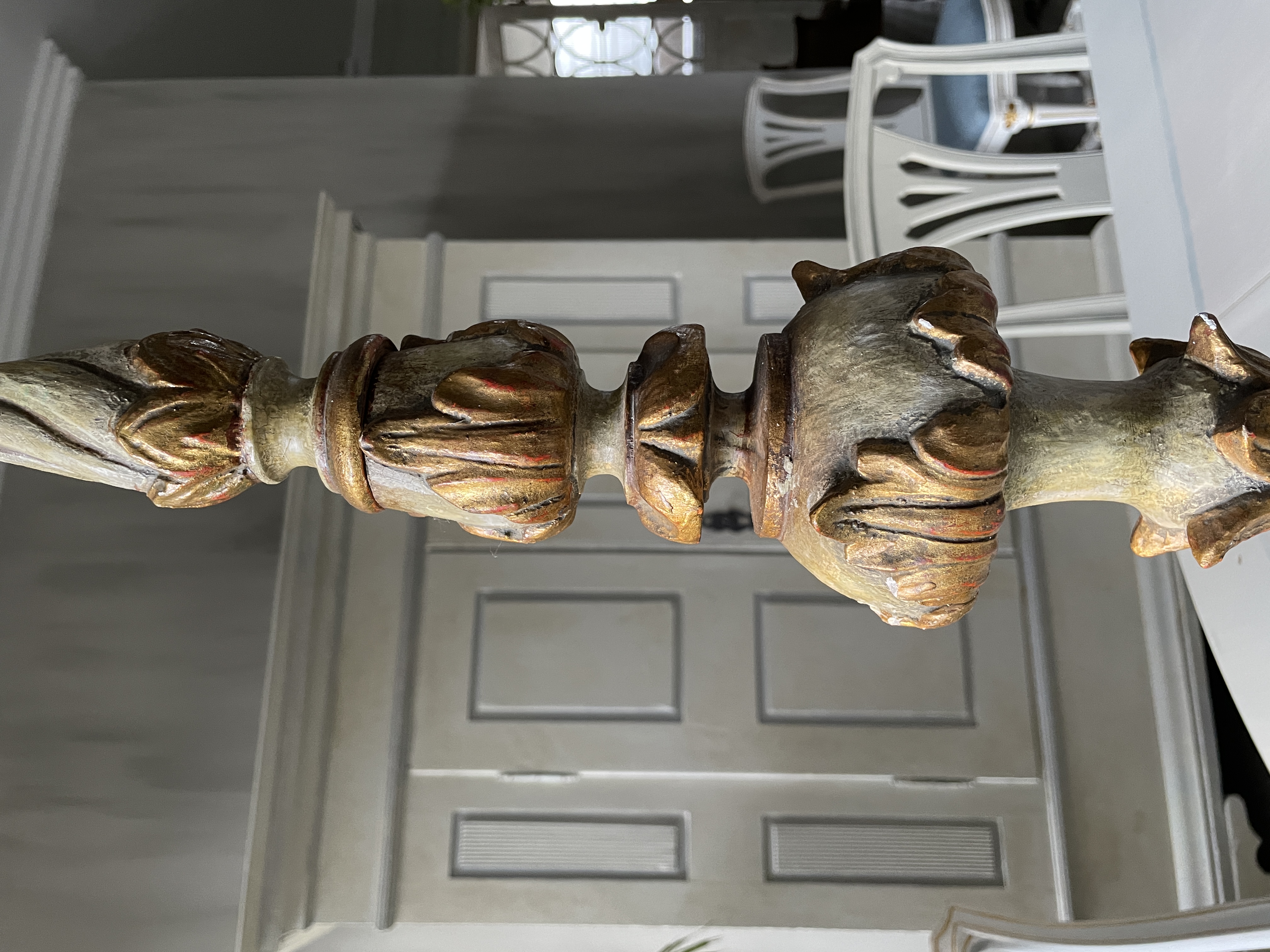 Barocker Altarleuchter. Holz allseitig geschnitzt, gefasst, teilvergoldet, dreiseitiger Volutensockel, Balusterschaft, Fassung überarbeitet, Eisendorn fehlt, Gesamthöhe ca. 100 cm, beschädigt, Tropftasse fehlt. Höhe ca. 70cm