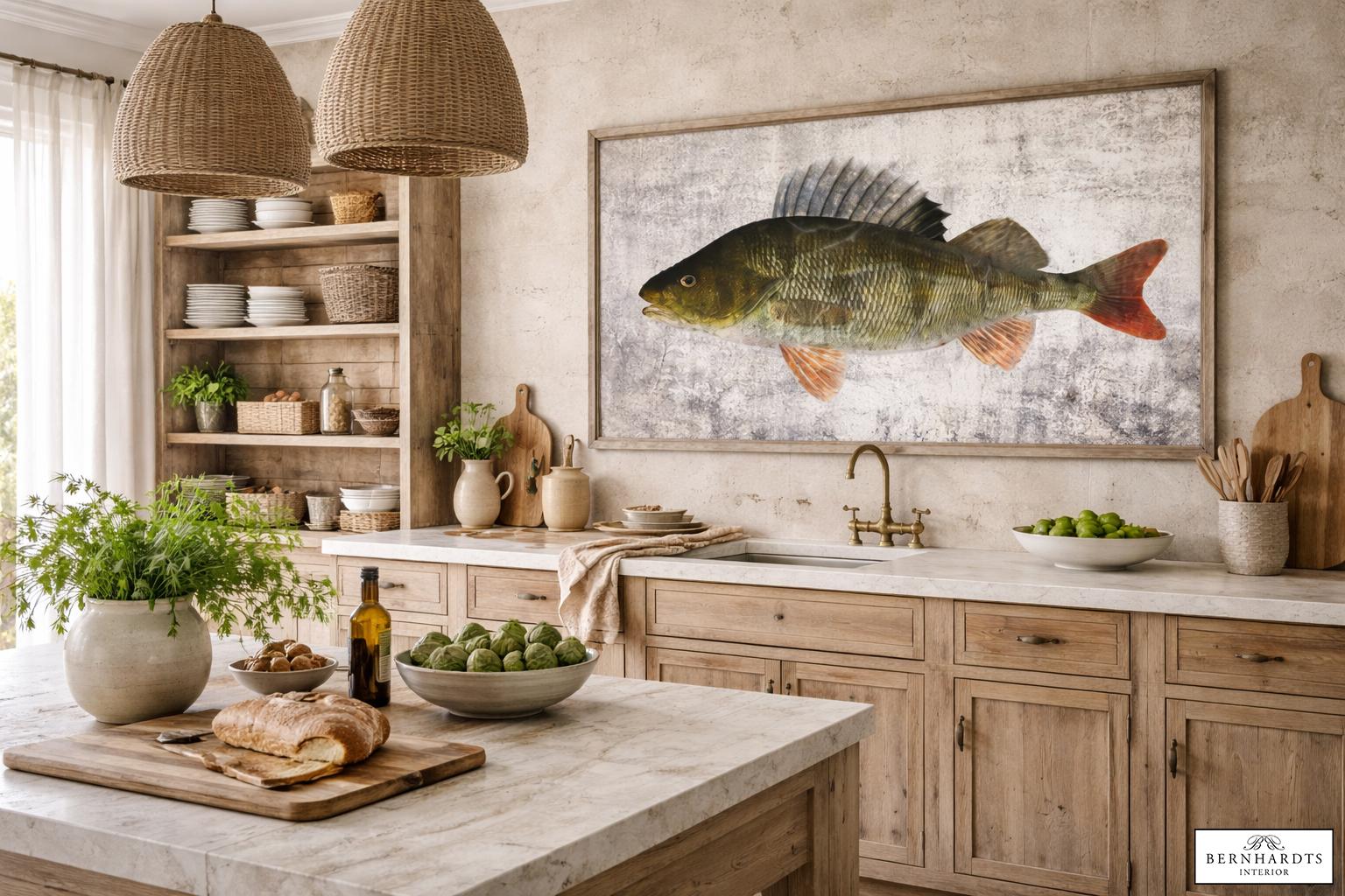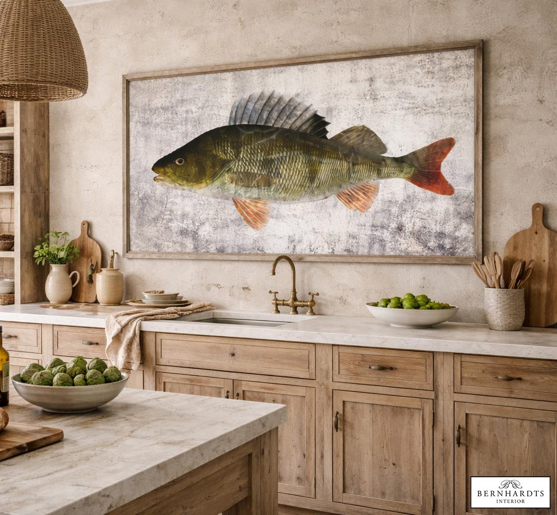Das Motiv des Barsches überzeugt durch seine markante Silhouette und die lebendige Struktur seiner natürlichen Farbnuancen, die in der künstlerischen Bearbeitung eine besondere Tiefe und Ausdruckskraft entfalten. Inspiriert von klaren Seen und nordischen Wasserlandschaften entsteht ein Werk mit ruhiger Präsenz – zugleich kraftvoll und elegant. Ideal für stilvolle Naturinterieurs, Seehäuser oder hochwertige Küchen- und Wohnkonzepte.