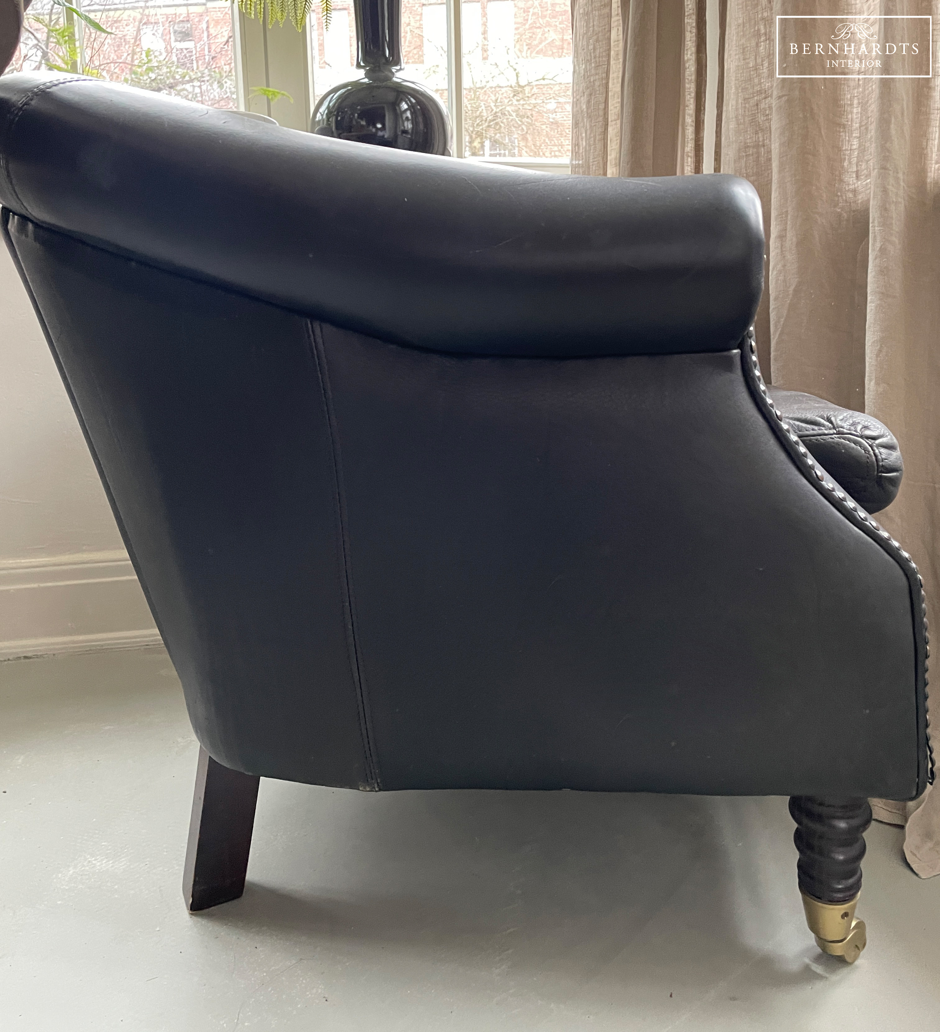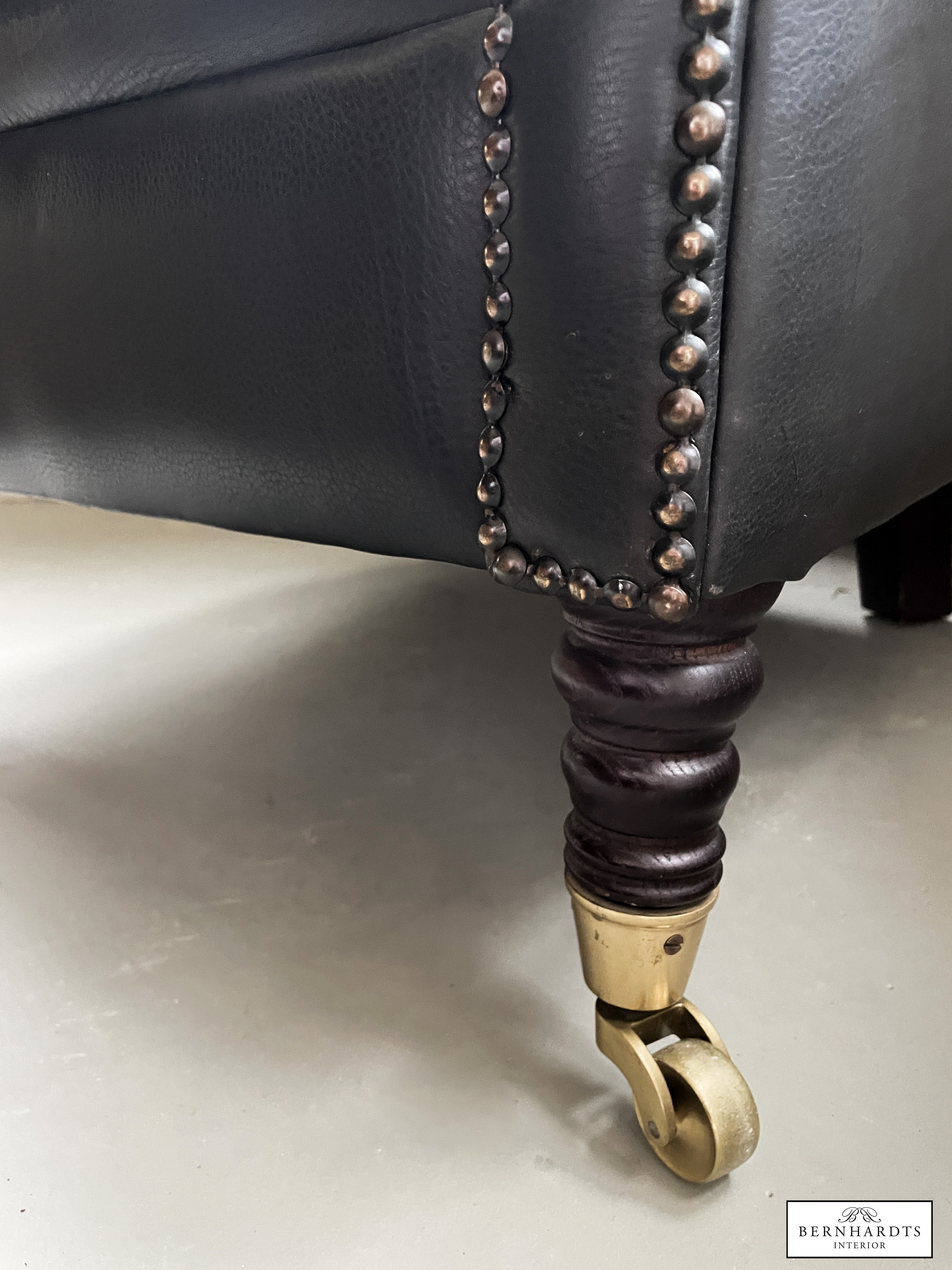 Der Sessel besticht durch seine harmonisch geschwungenen Linien, die charakteristischen Ziernagelabschlüsse sowie das hochwertige schwarze Echtleder, das über die Jahre eine edle, authentische Patina entwickelt hat. Diese natürliche Alterung verleiht dem Möbel seine unverwechselbare Ausstrahlung und macht es zu einem Unikat. An der Rückenlehne aussen sind leichte Kratzspuren, diese fallen jedoch kaum auf. Die gedrechselten Holzfüße mit originalen Messingrollen unterstreichen den britischen Gentleman-Club-Charakter und verbinden klassische Ästhetik mit praktischer Funktionalität. Die Hinterbeine sind ohne Rollen gearbeitet, das erleichtert den Transport und Stansfestigkeit. Es schont den Fussboden. Die großzügige Sitzfläche und die weich gerundete Rückenform sorgen für außergewöhnlichen Komfort – ideal für entspannte Lesestunden oder stilvolle Empfangsbereiche. Stabil, gepflegt und sofort einsatzbereit.