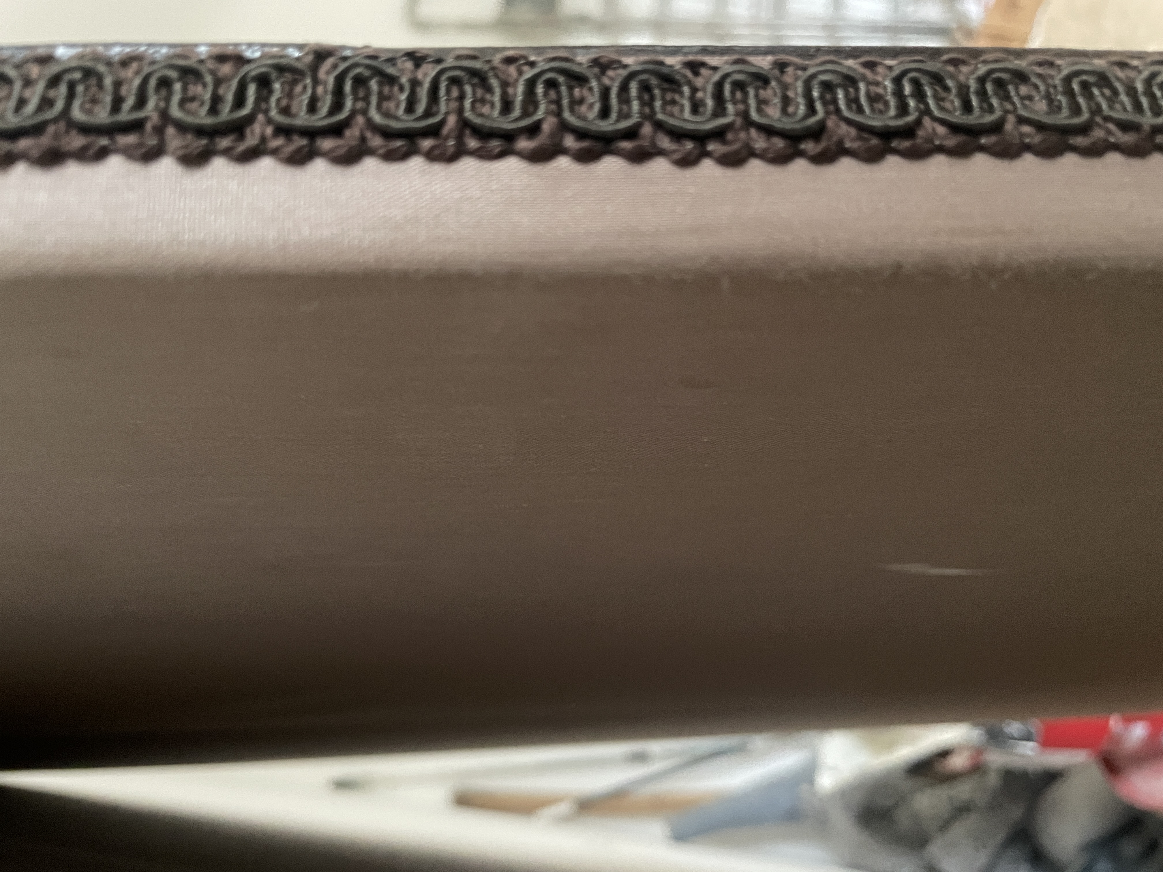 Die rückseitige textile Bespannung mit dekorativer Posamentenborte sowie die eleganten Metallscharniere unterstreichen die französische Provenienz und den gehobenen Anspruch des Stückes.