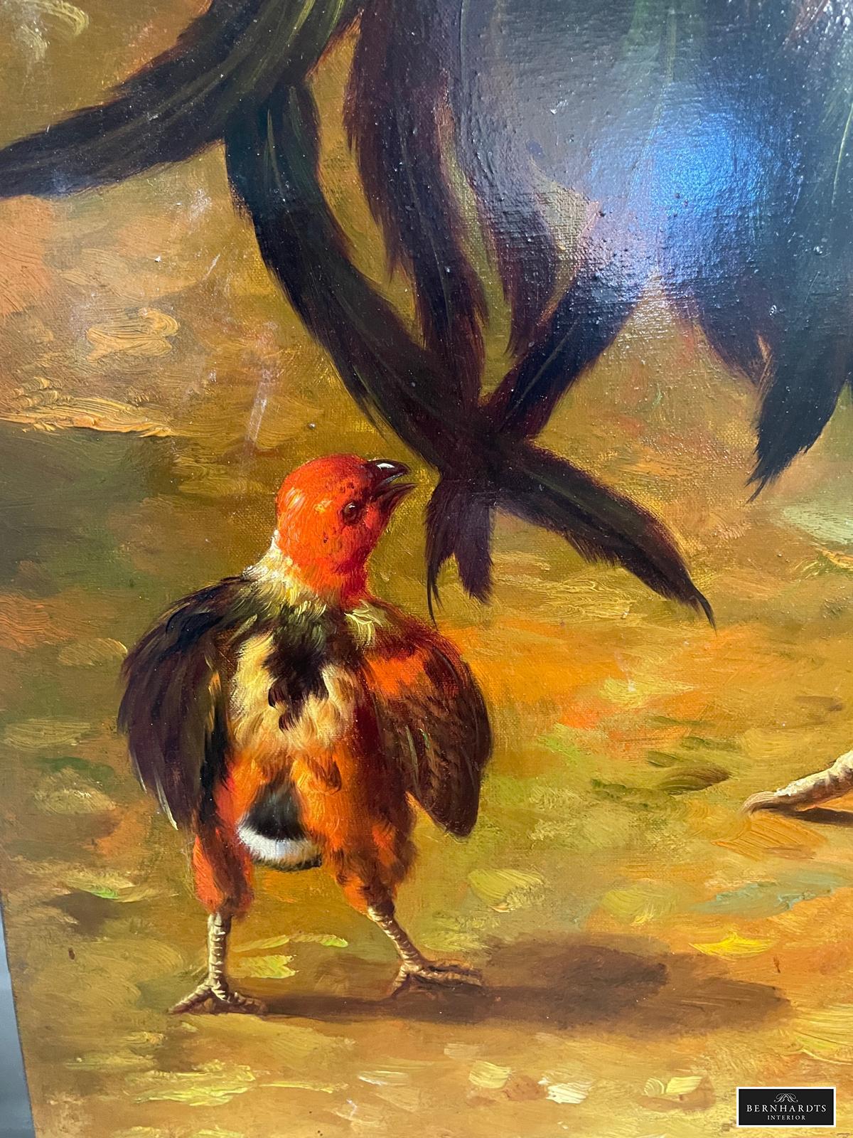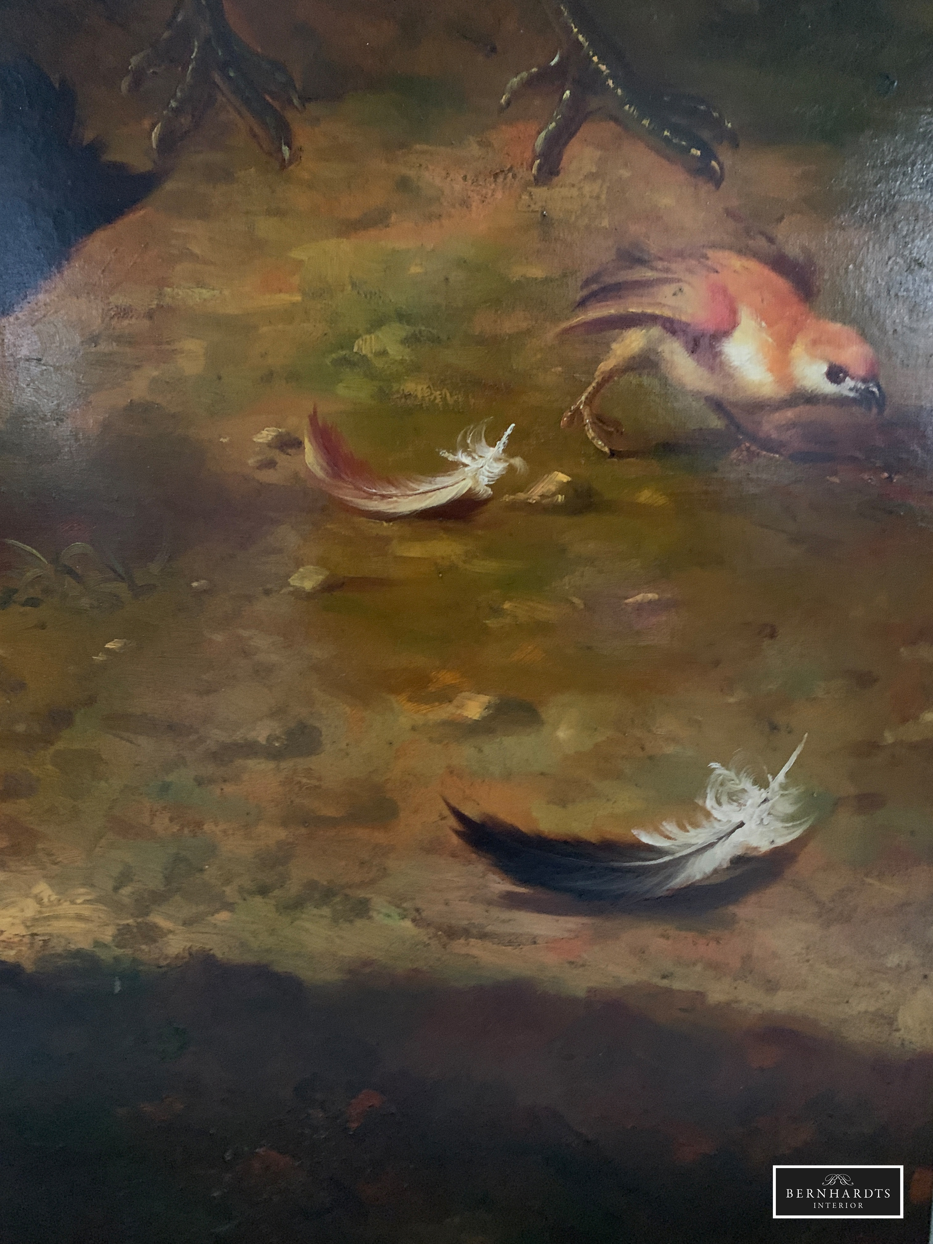 Die fein modellierten Tierdarstellungen entfalten vor architektonischer Kulisse eine atmosphärische, beinahe theatralische Wirkung. Die sichere Pinselführung, das differenzierte Spiel von Licht und Schatten sowie die detailreiche Ausarbeitung des Gefieders verweisen auf die Pariser Salon- und Dekorationsmalerei des mittleren 19. Jahrhunderts.