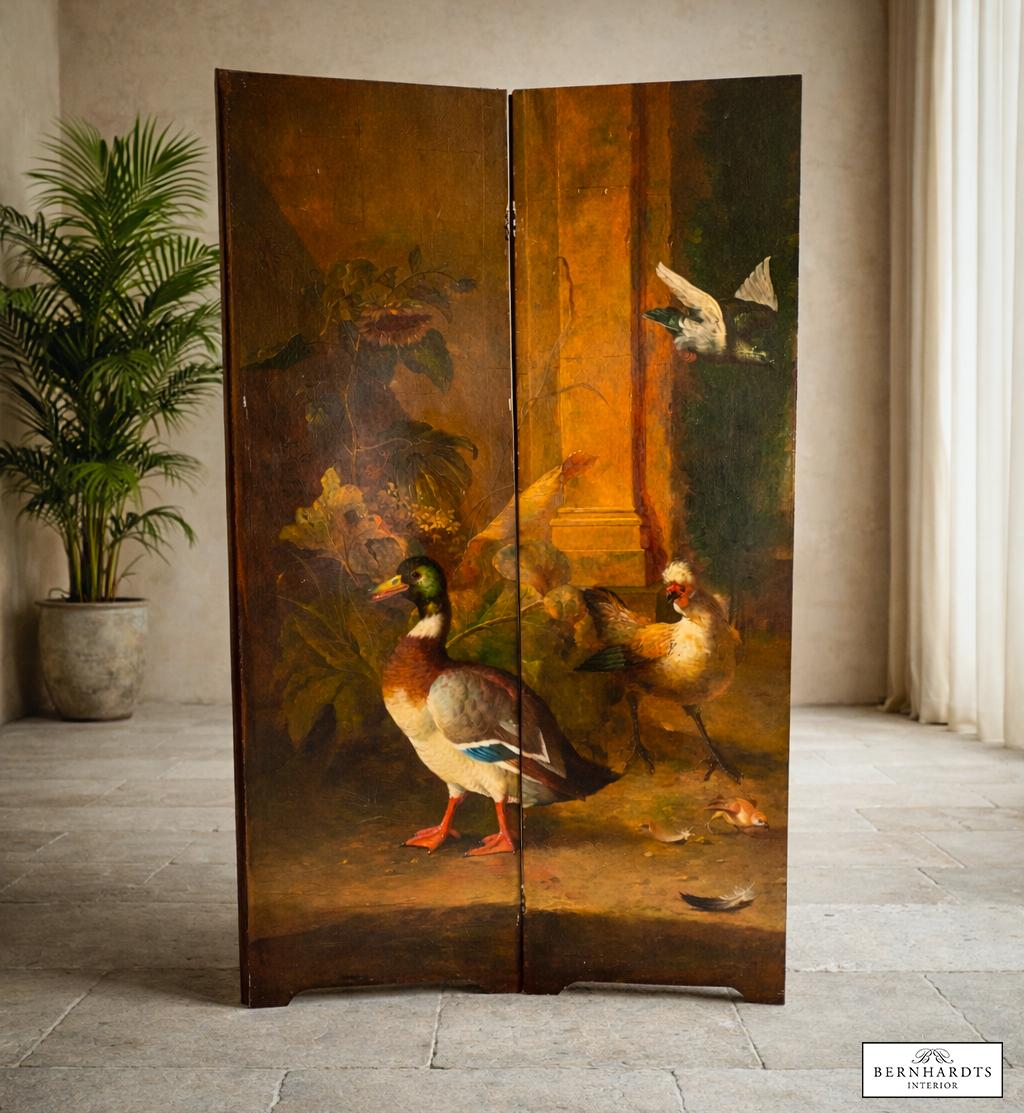 Mit ca. 200 cm Höhe und 100 cm Breite besitzt der zweiteilige Paravent eine eindrucksvolle Präsenz – ein repräsentatives Statement-Objekt für anspruchsvolle Interieurs, klassisch wie modern.