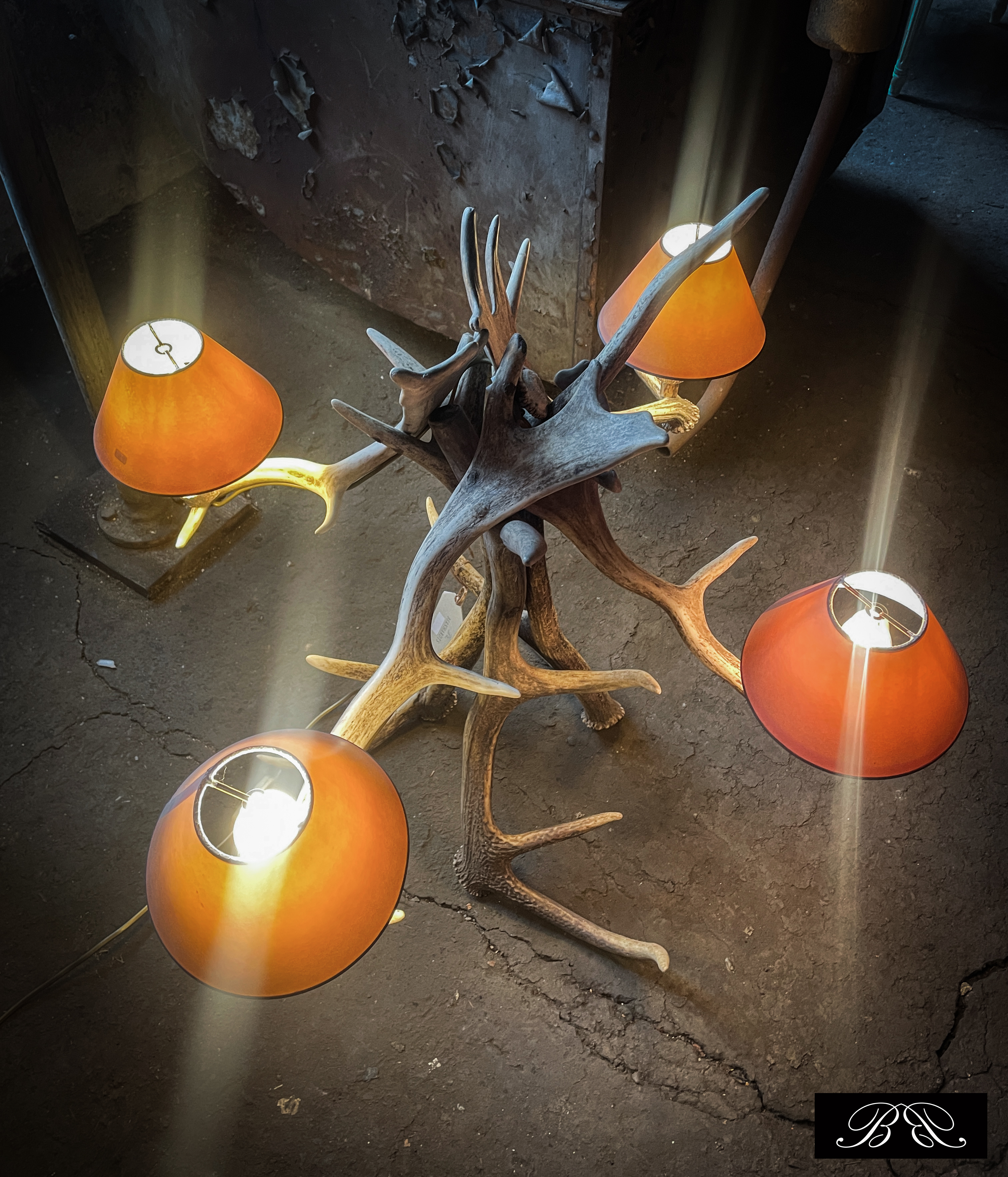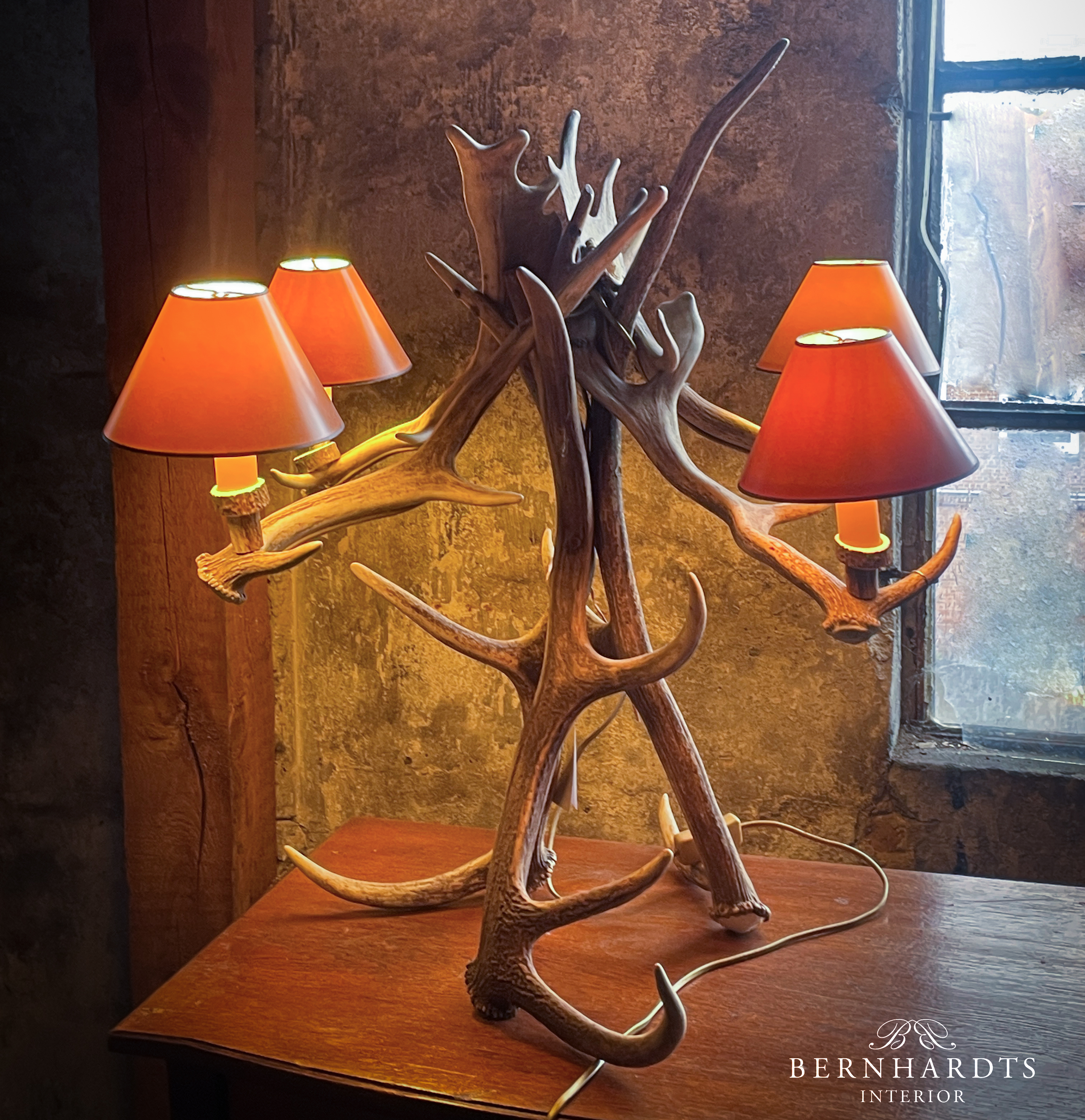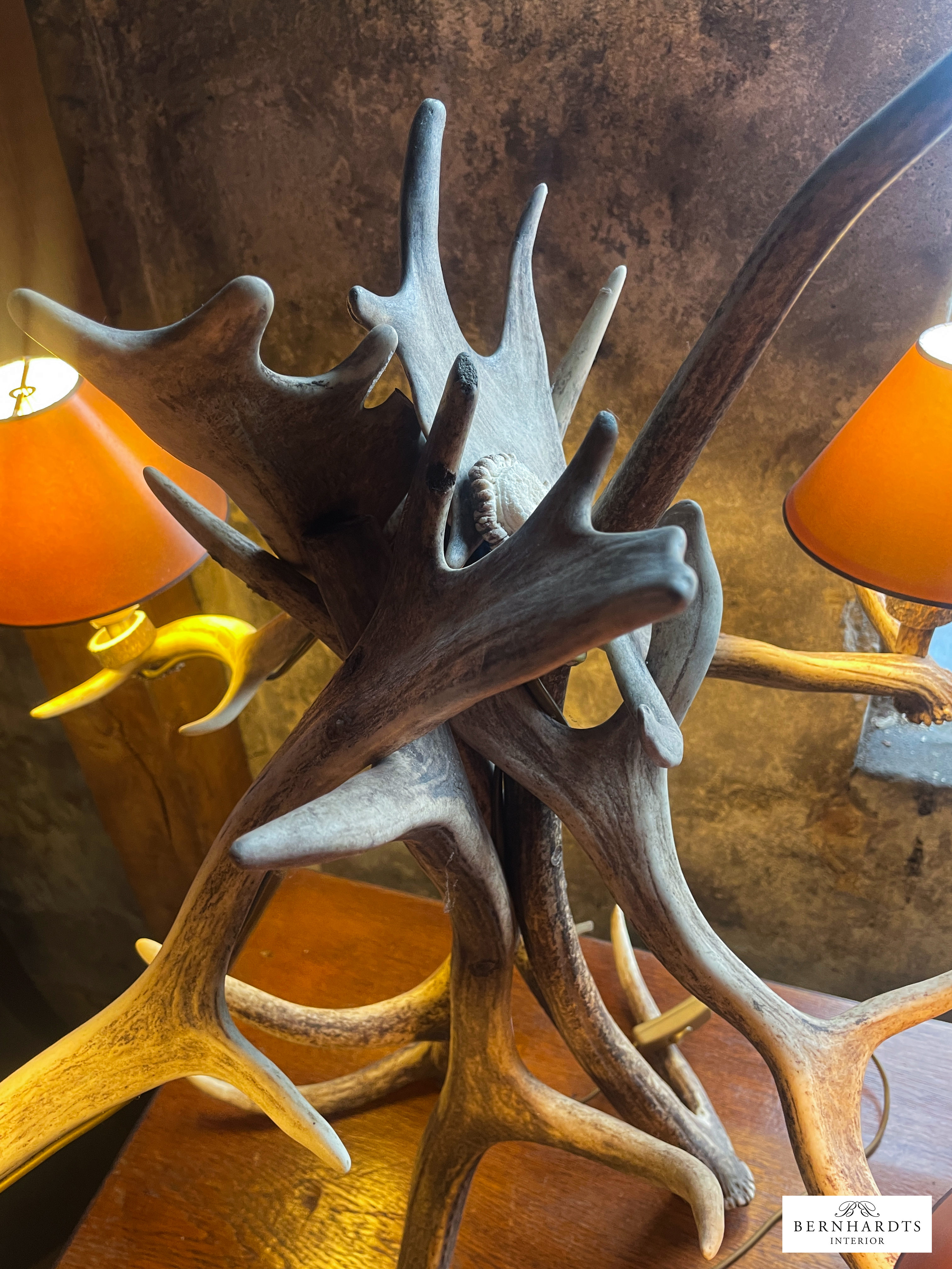 Geweihleuchte, Chaletleuchte, Standleuchte. Diese Geweihleuchte hat 4 Kerzen, ist elektrifiziert und funktioniert. Ideal geeignet für Alpenhütten, Berghütten, Jagthütten, Landhäuser, Bauernhäuser, Hotels im rustikalem Stil. Die authentische, rustikale, warme und einladene Atmosphäre passt zu den Kaminfeuern und traditionellen Möbelstücken. Hier setzt sie ein markantes und imposantes Statement und versprüht ein natürlichen Charme. Die Schirme sind hochwertig gearbeitet.