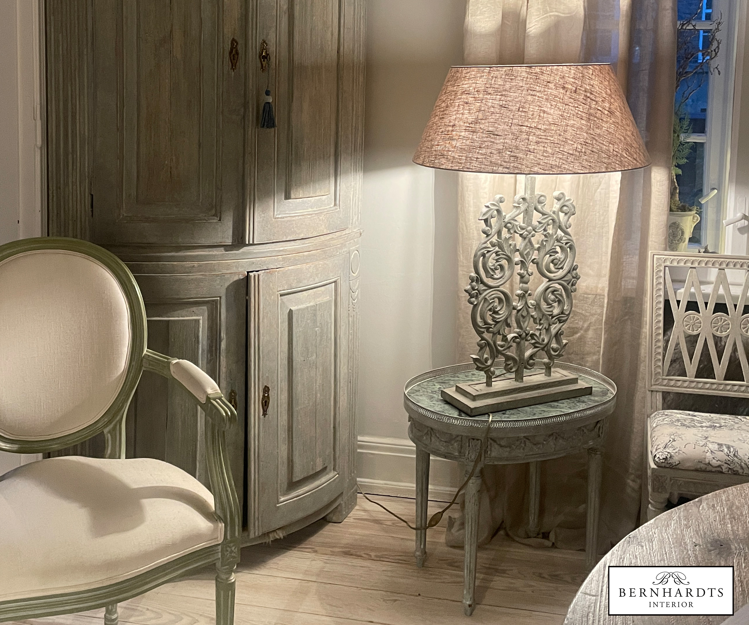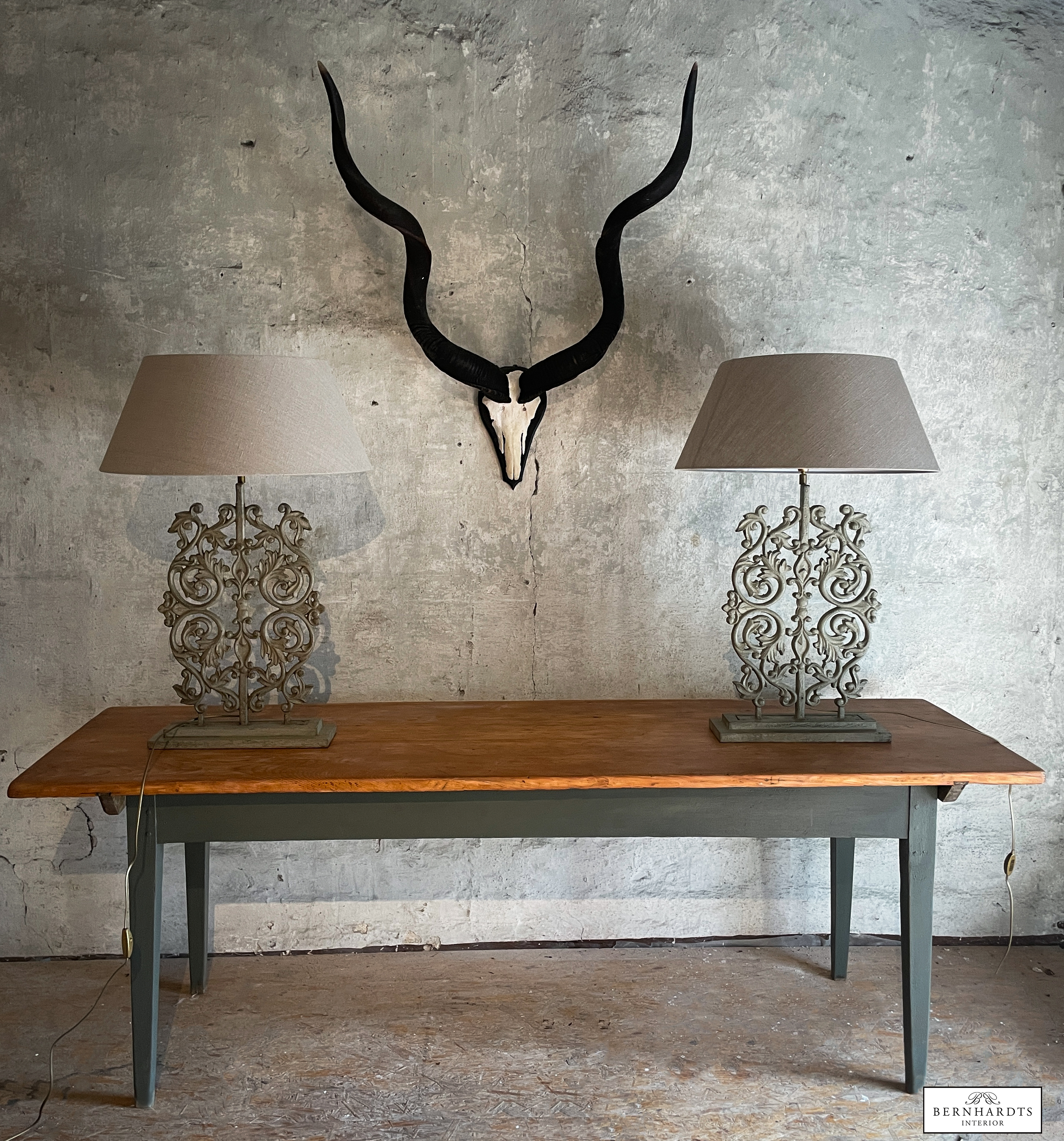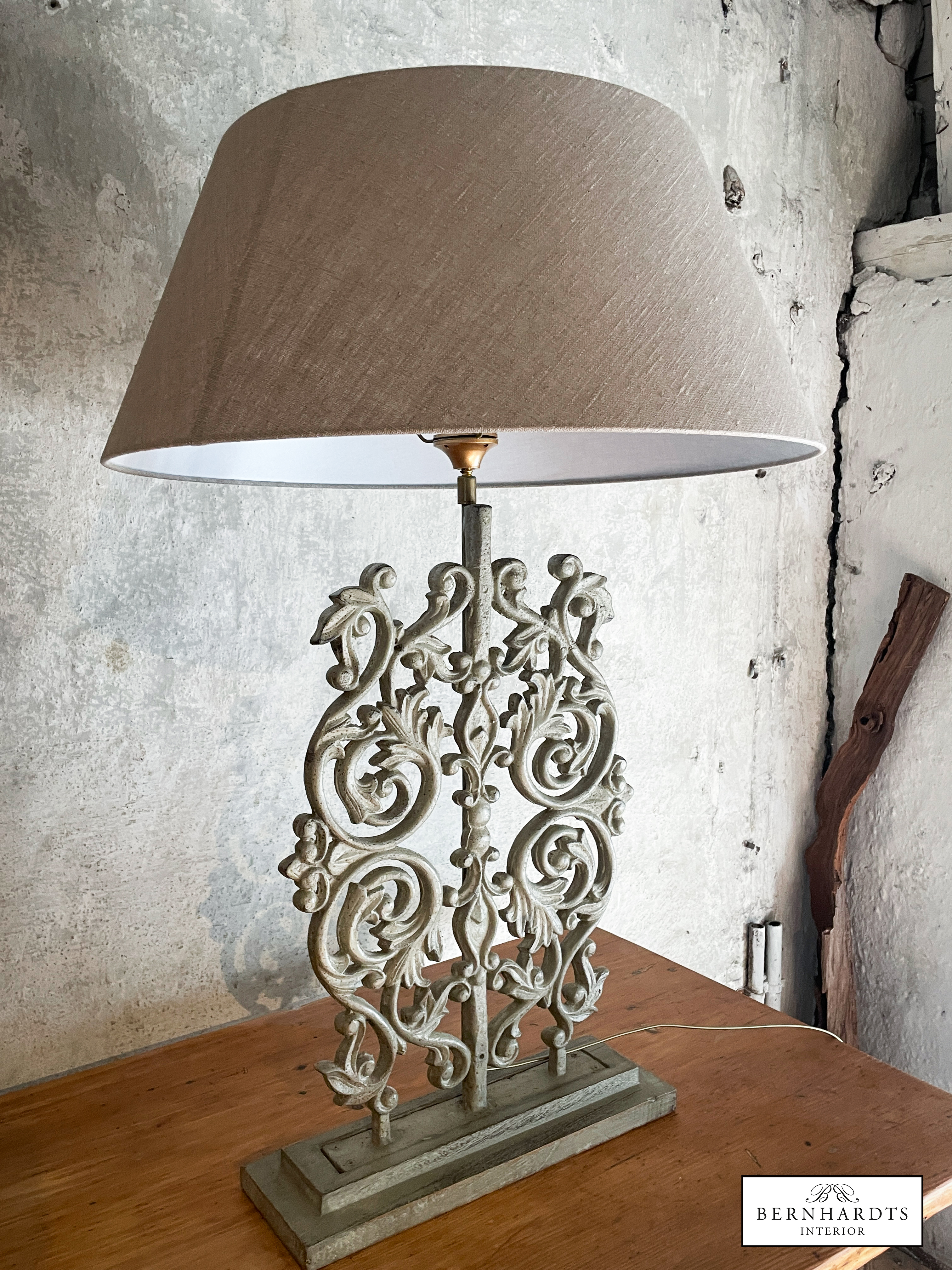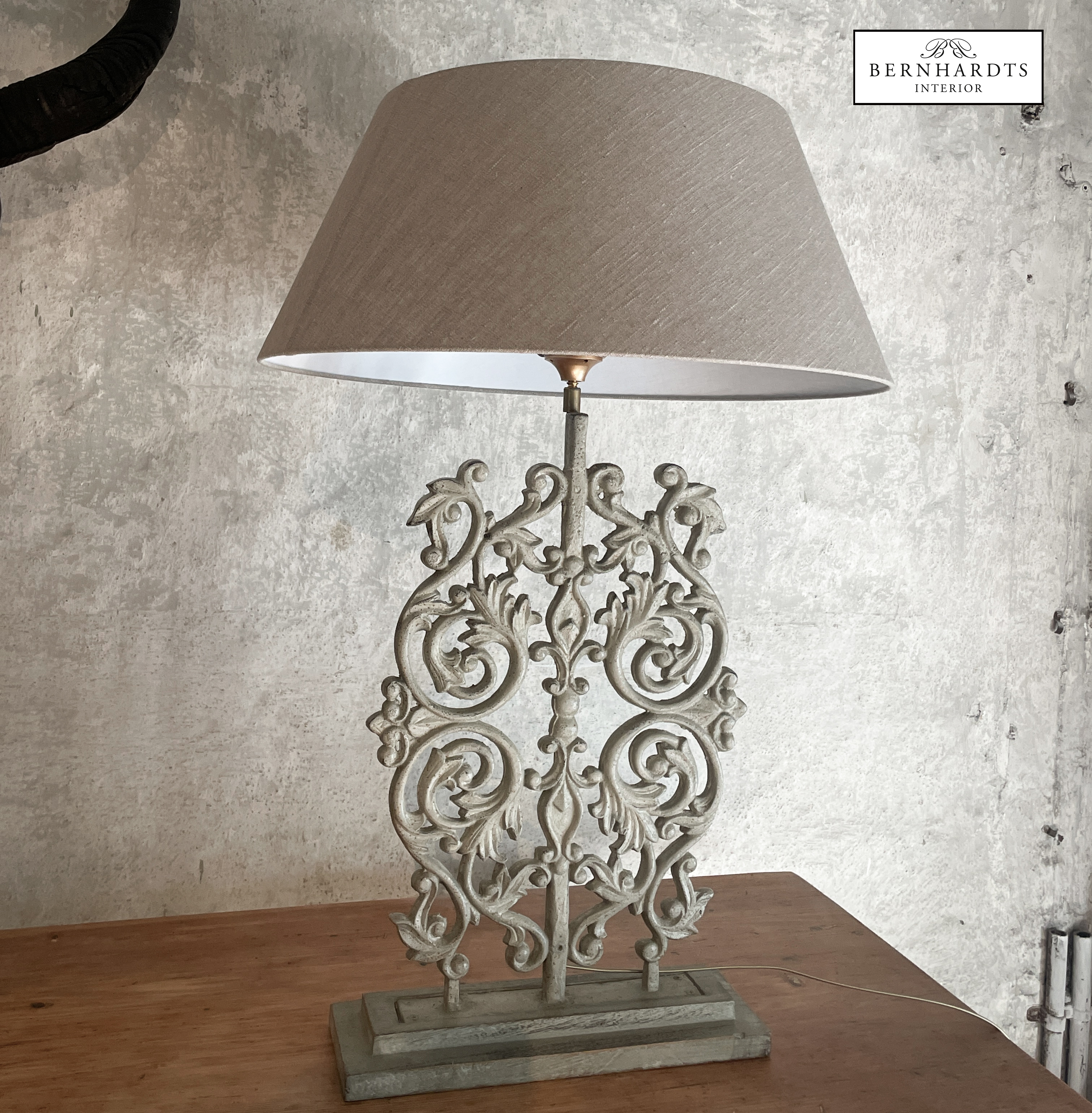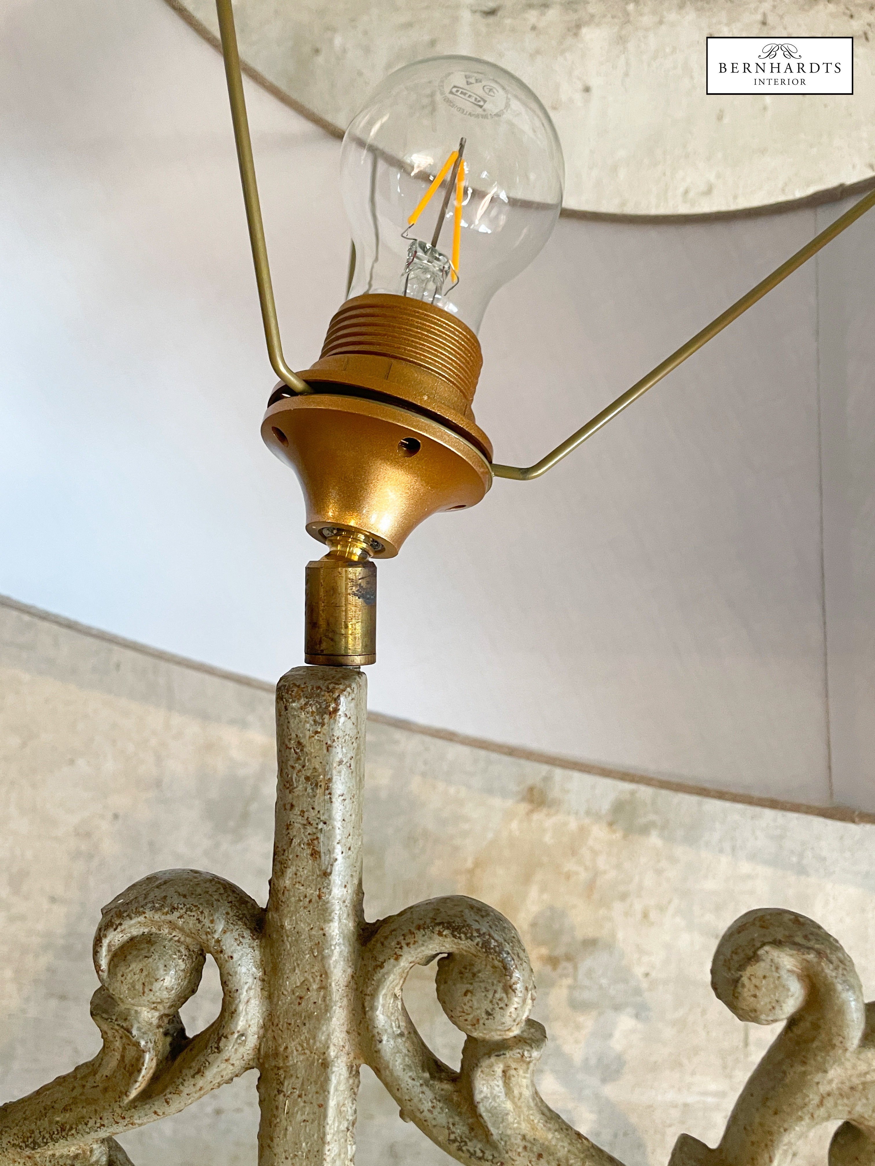 Grosse belgische Landhausleuchte mit Eisenfuss und Leinenschirm. Die Leuchte hat einen schwenkbaren Schirm mit Kippgelenk. Die hochwertige Leuchte ist sowohl für puristische und moderne als auch für tradtionelle Einrichtungsstile geeignet und in jedem Fall ein absoluter Blickfang. Sie schafft ein sehr wohnliches Ambiente. Es sind mehrere vorhanden und können auch nachbestellt werden solange der Vorrat reicht. Auch mit anderem Schirm erhältlich.