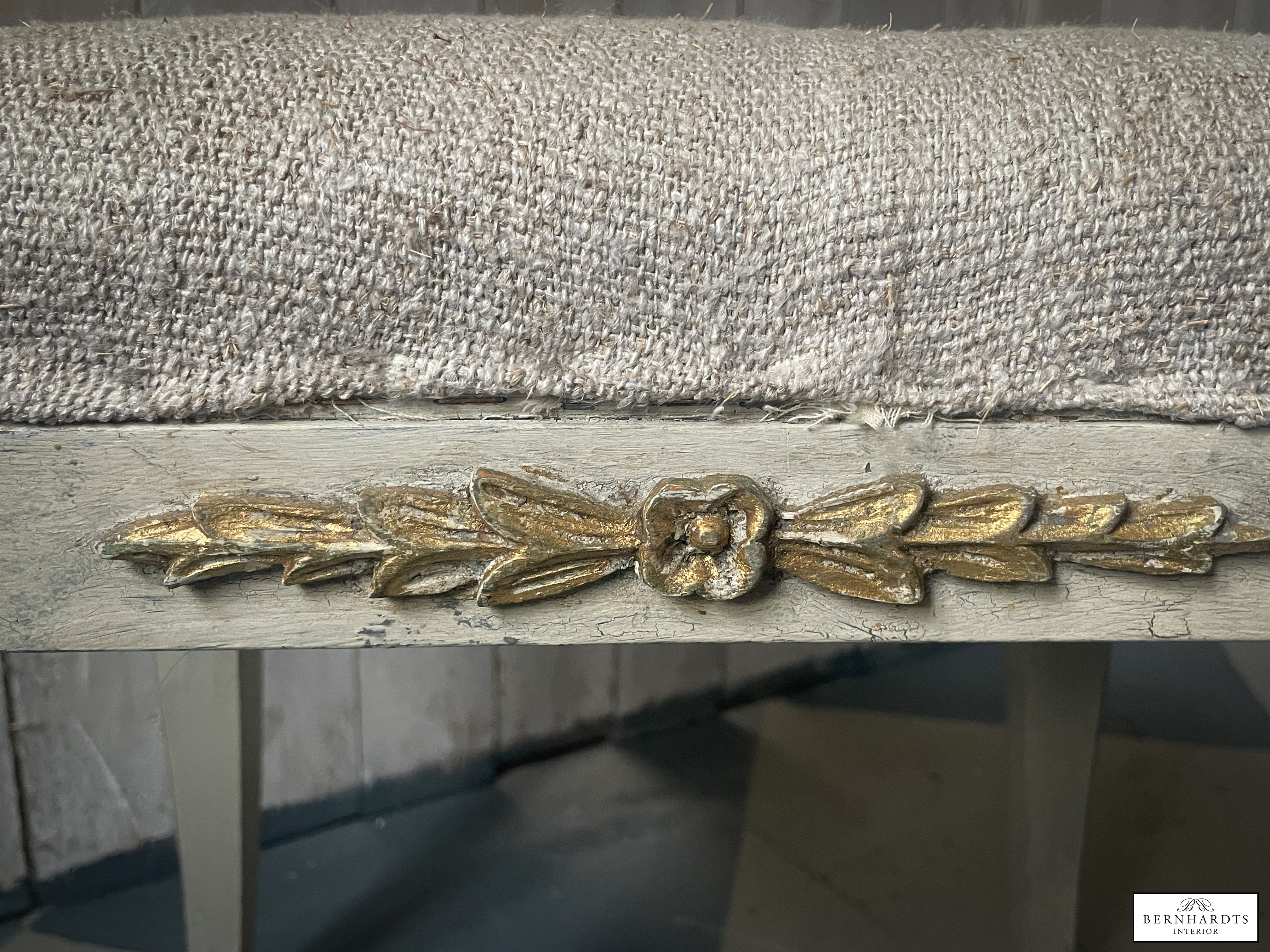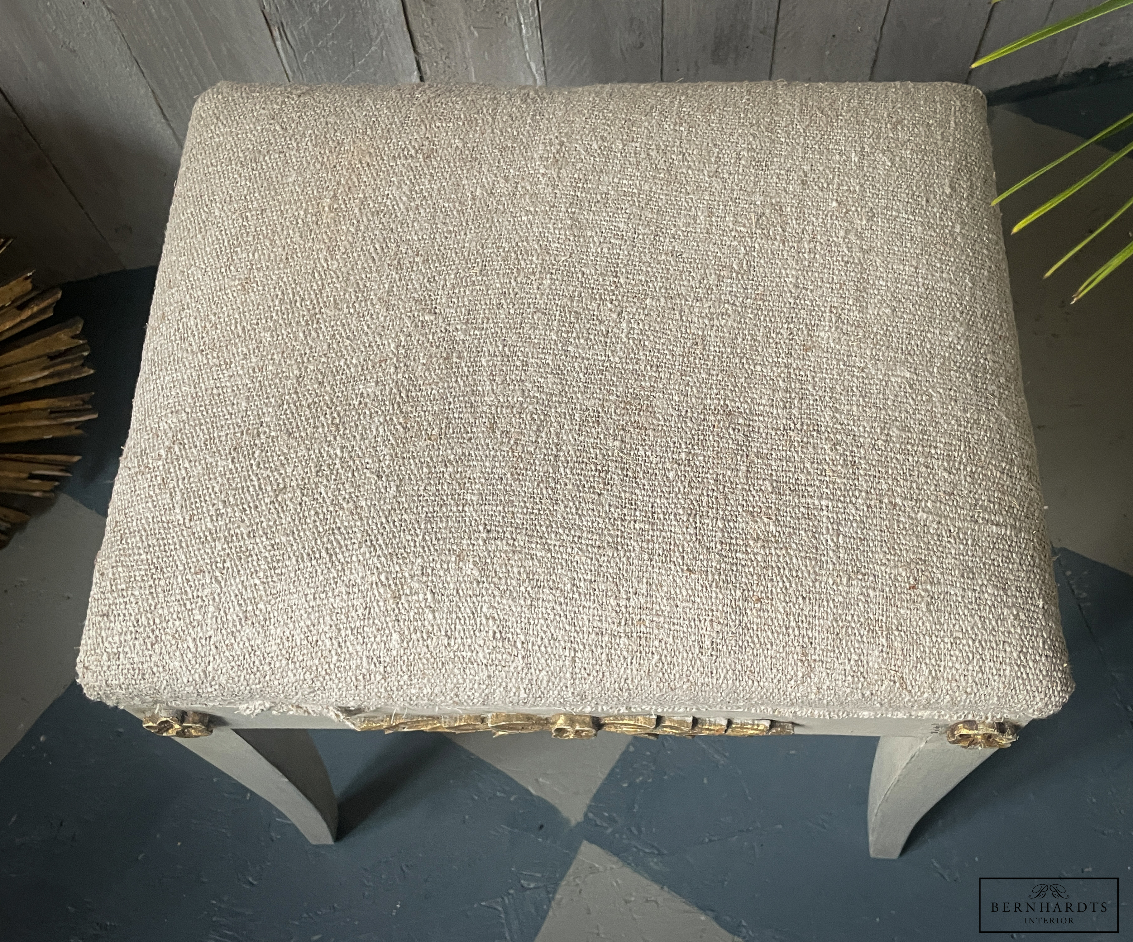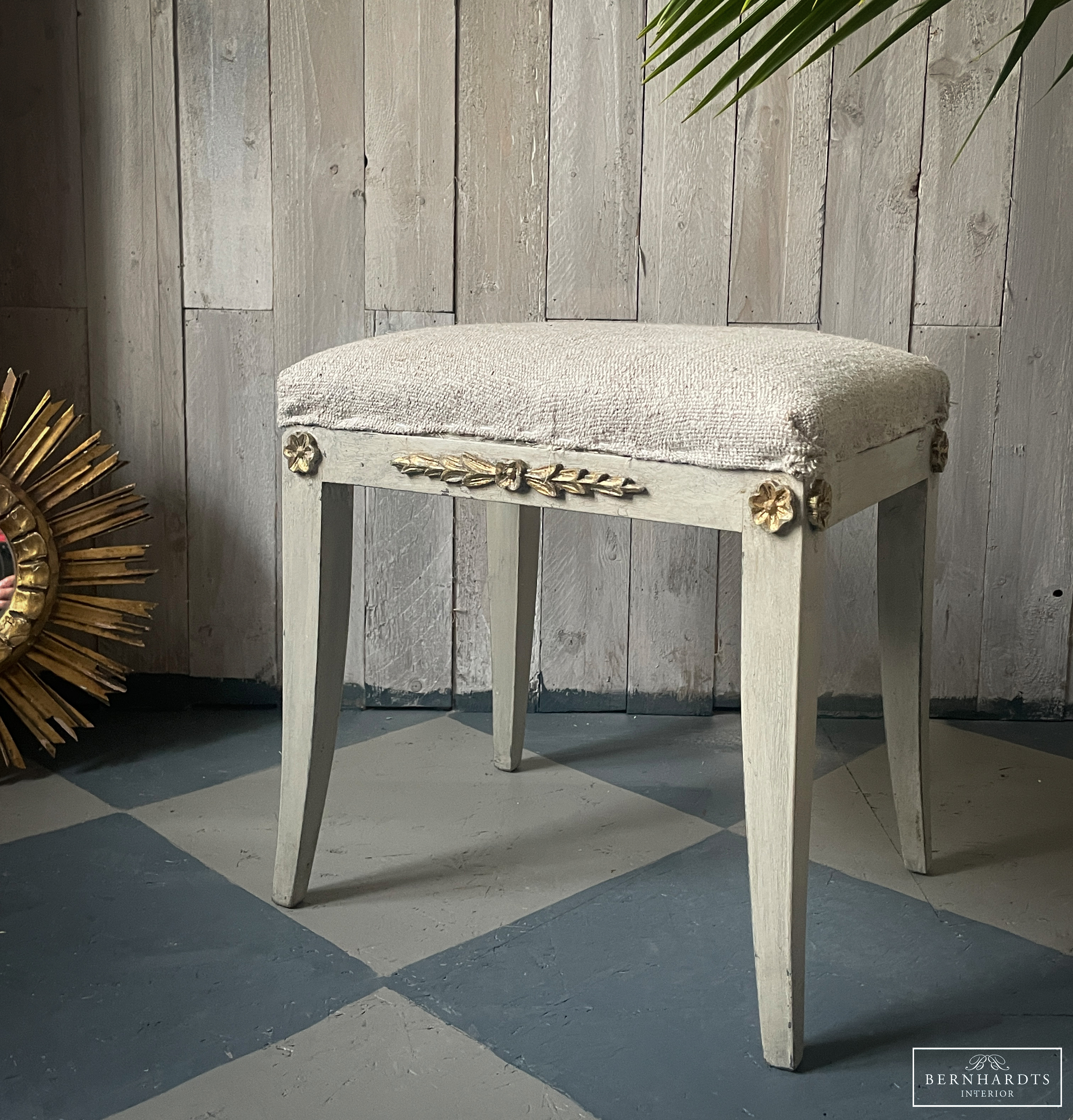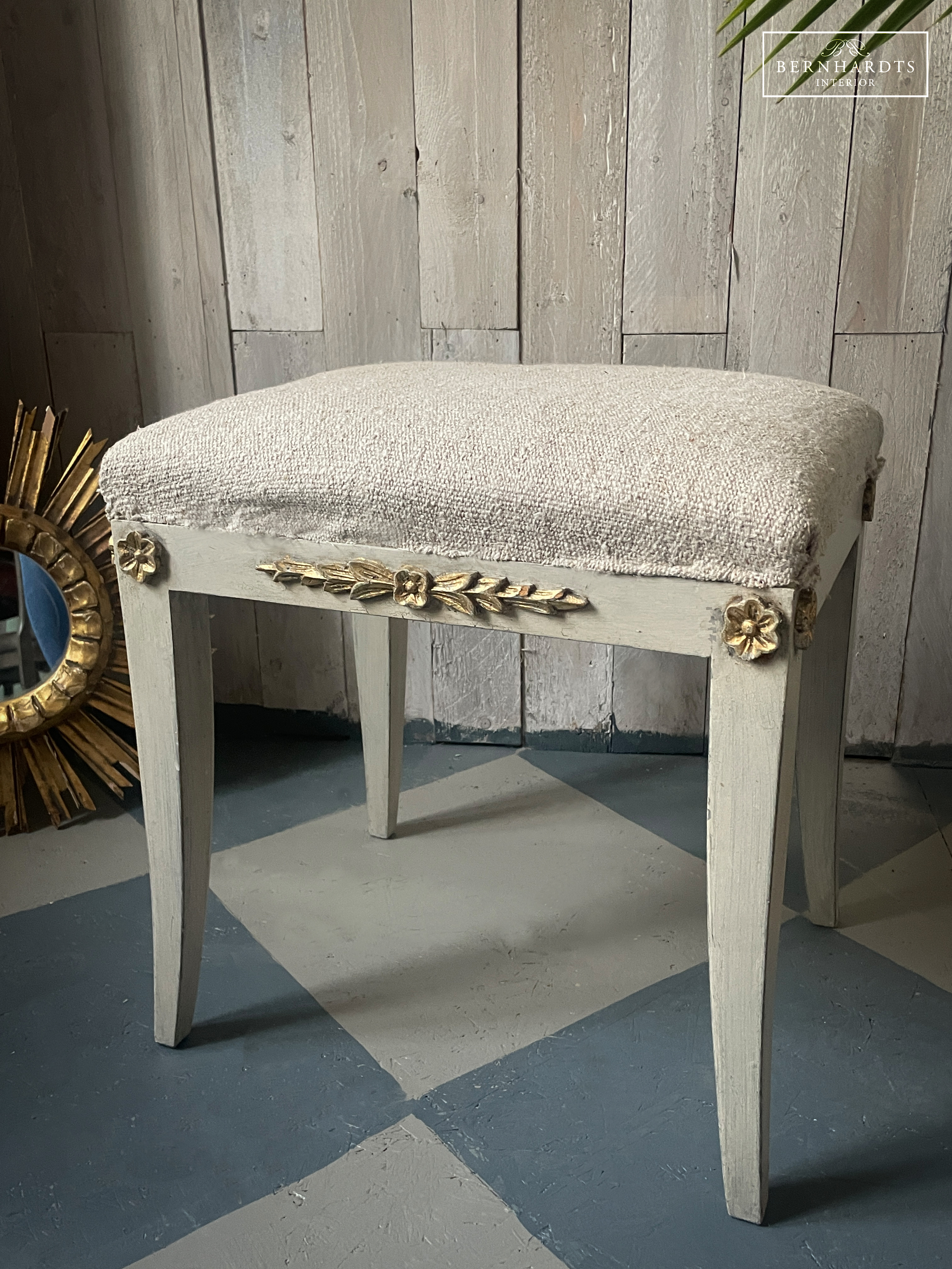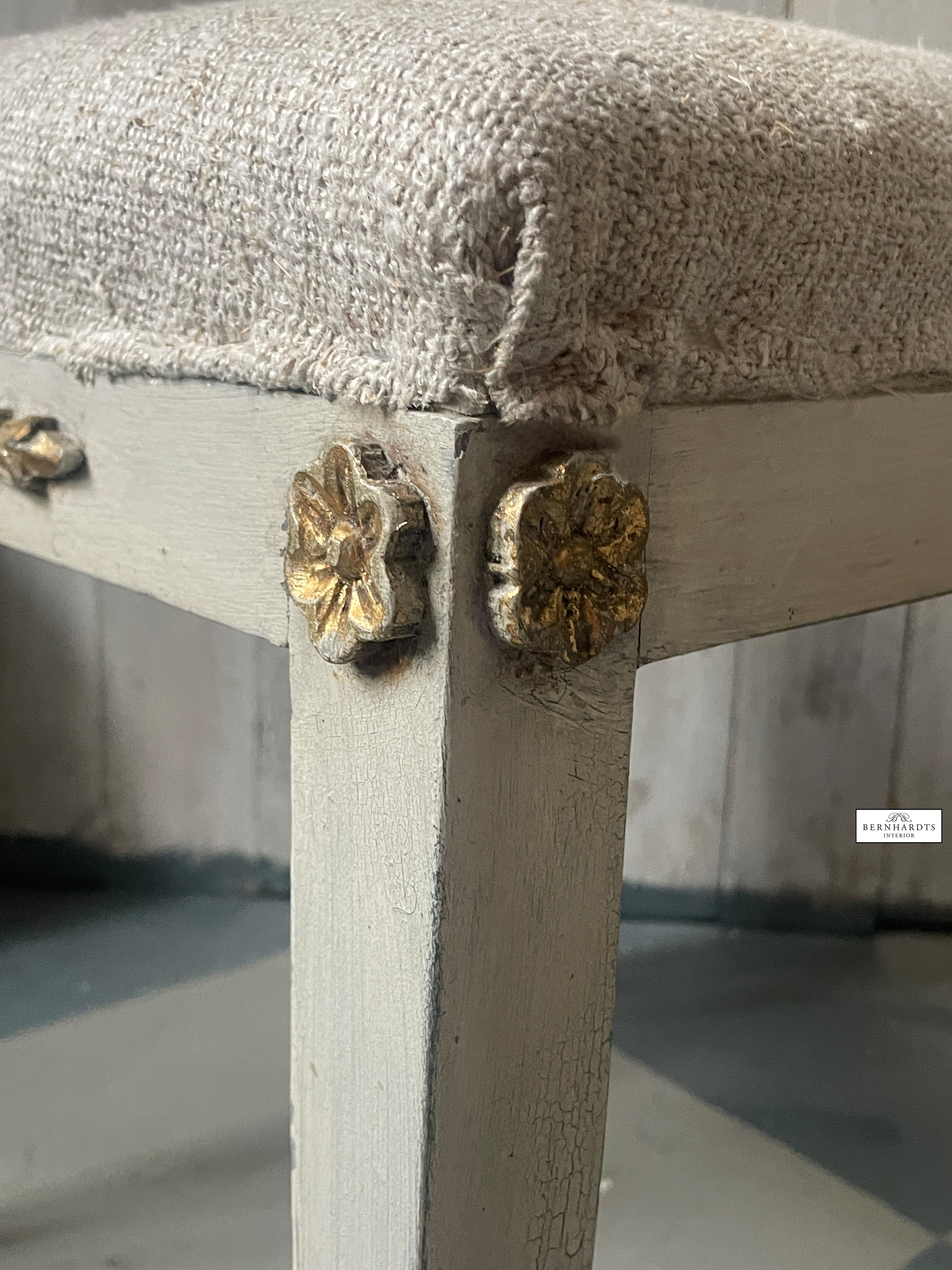 Kleiner Gustavianischer Hocker, Schweden um 1860. Der Hocker hat noch die Originalfassung, gustavianisch grau und Teilvergoldung an den Verzierungen. Das Polster ist sehr bequem. Der Bezug wurde mit alten Bauernleinen erneuert. Ein schönes Möbel welches sich überall hinzufügen lässt. Für den täglichen Gebrauch geeignet. Optional ist ein zweiter vorhanden.Beine laufen konisch zu