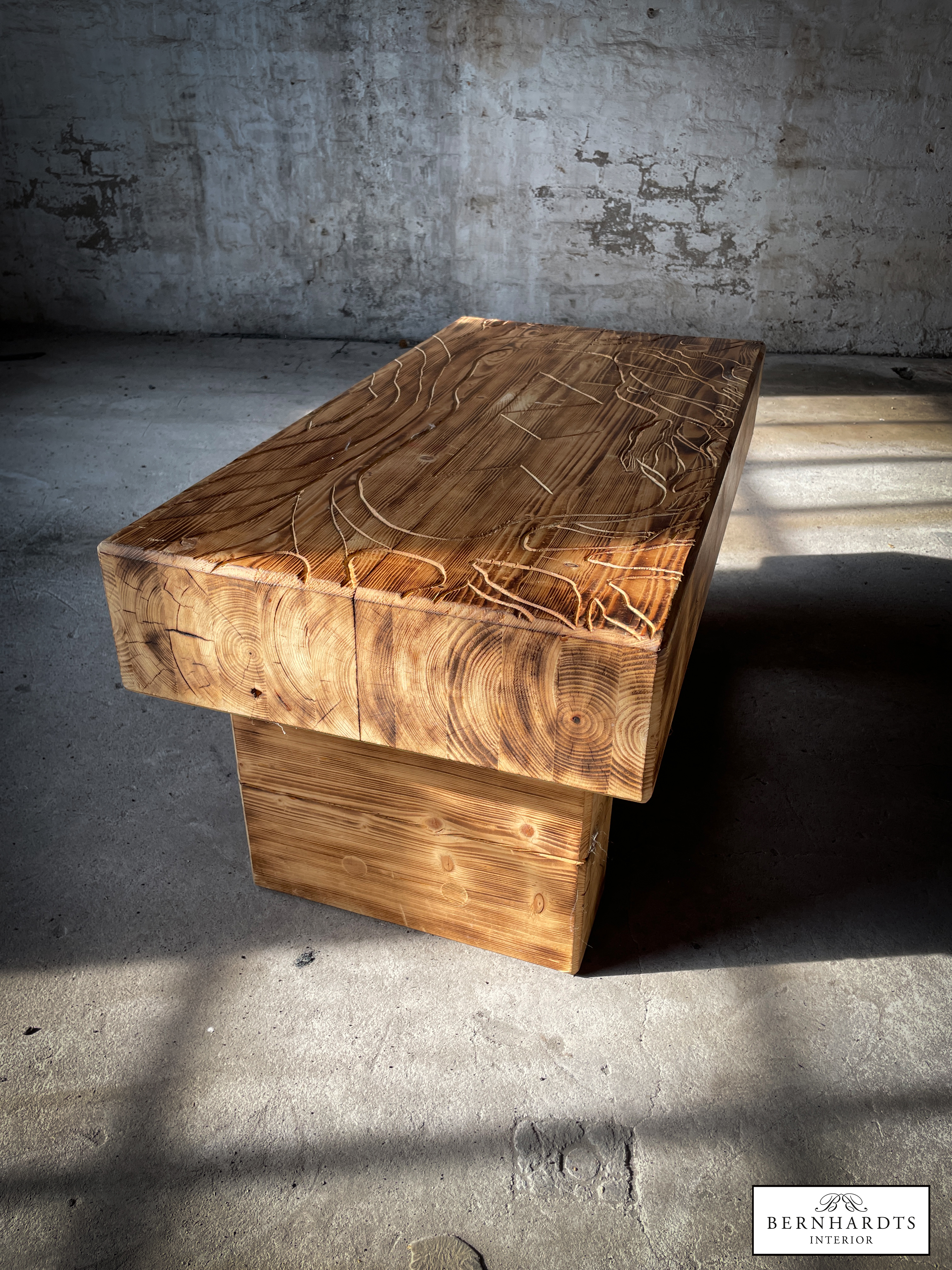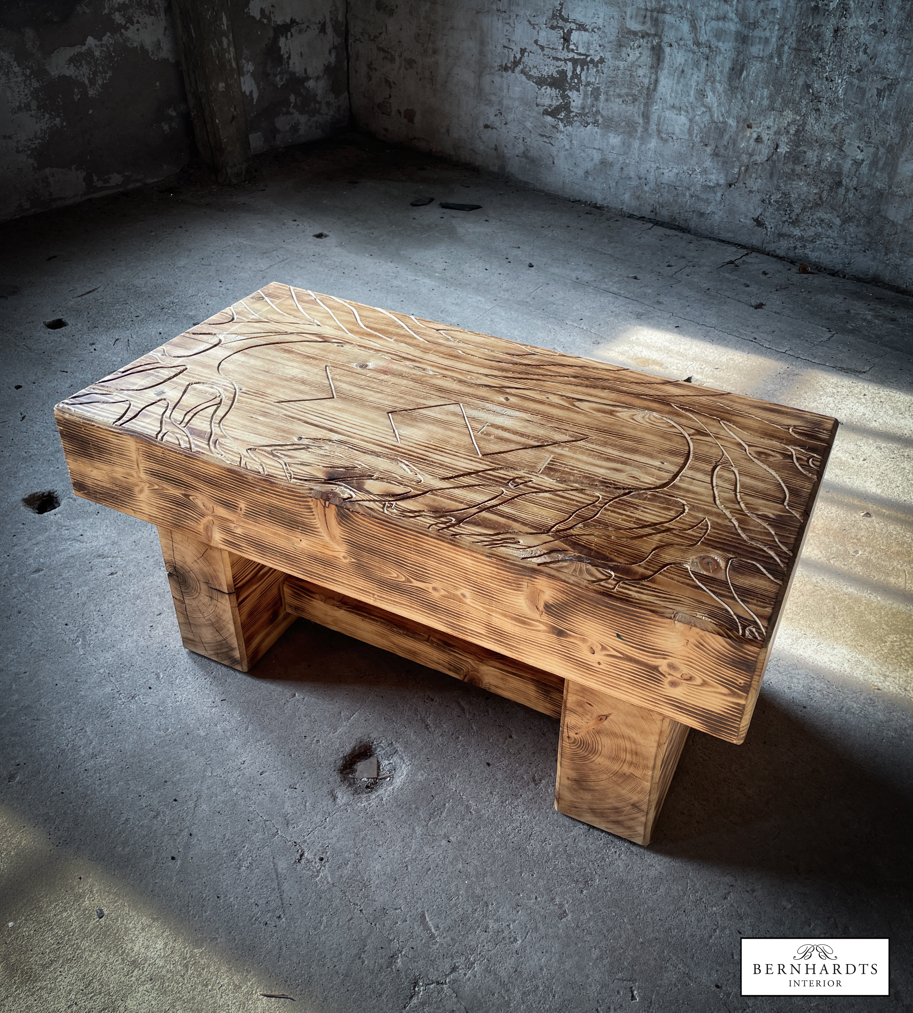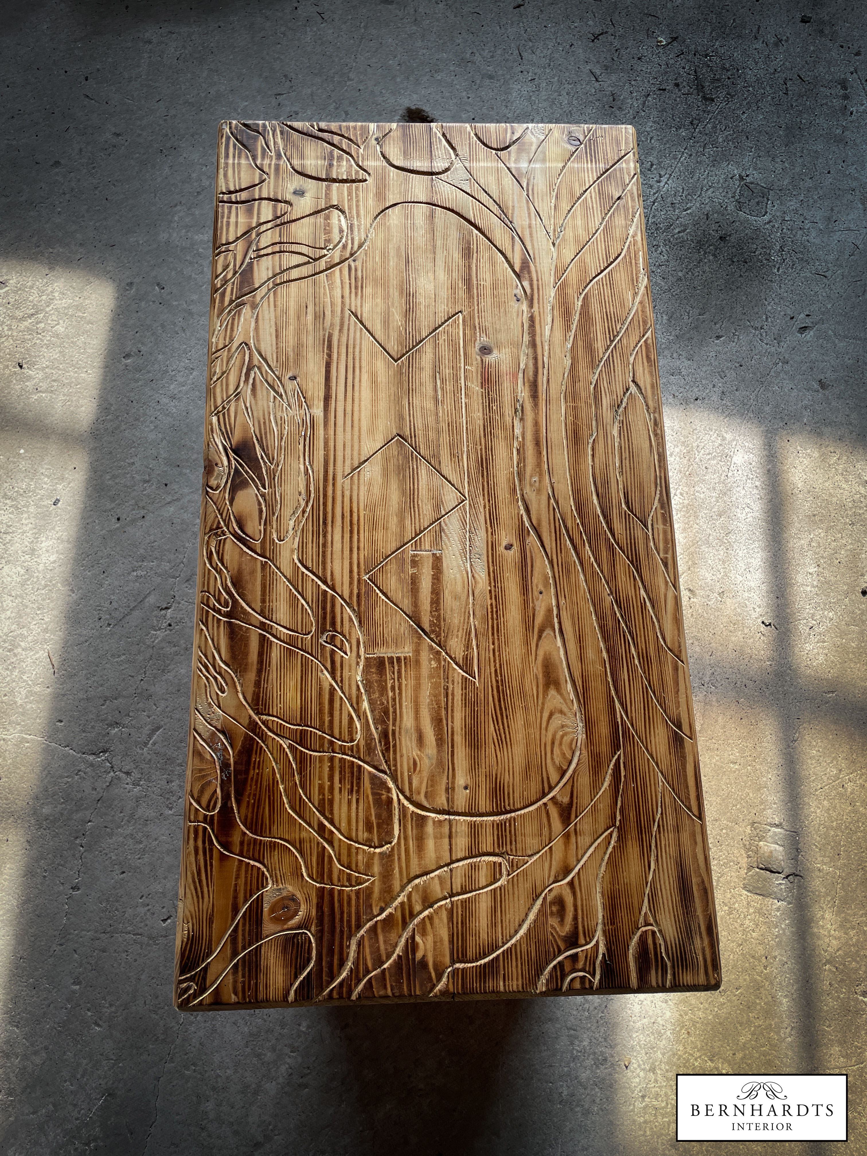 Handgefertigter, rustikaler Designer Tisch von Jan von Koss. Ein besonderer Tisch mit spirituellem Hintergrund und schöner Schnitzerei. Schamanismus und Runen sind in der nordischen Tradition eng miteinander verbunden, da Runen nicht nur Buchstaben, sondern auch magische Symbole sind, die in schamanischen Ritualen zur Weissagung, Heilung und zum Schutz eingesetzt werden. Der Lebensbaum, die Binderune Raidho, Pethro und Wunjo sind im Tisch verarbeitet. Der Tisch wurde aus Fichte gearbeitet und geflammt und erhält somit auch eine besondere Patina Optik, die in modernen oder Rustikalen Einrichtungsstilen besonders zur Geltung kommt. Positive Energie wird somit ins Haus eingeladen und schützt den Besitzer.