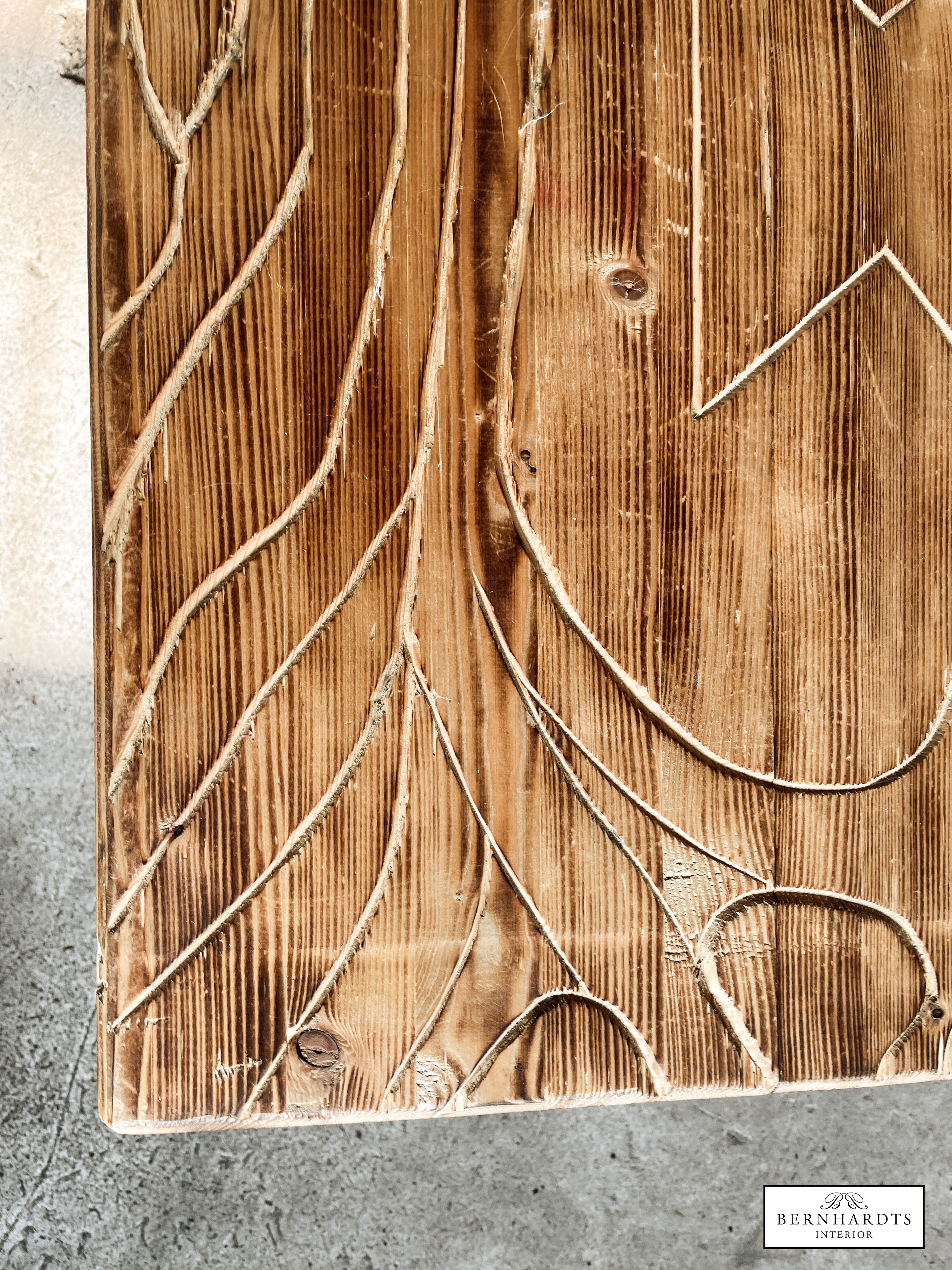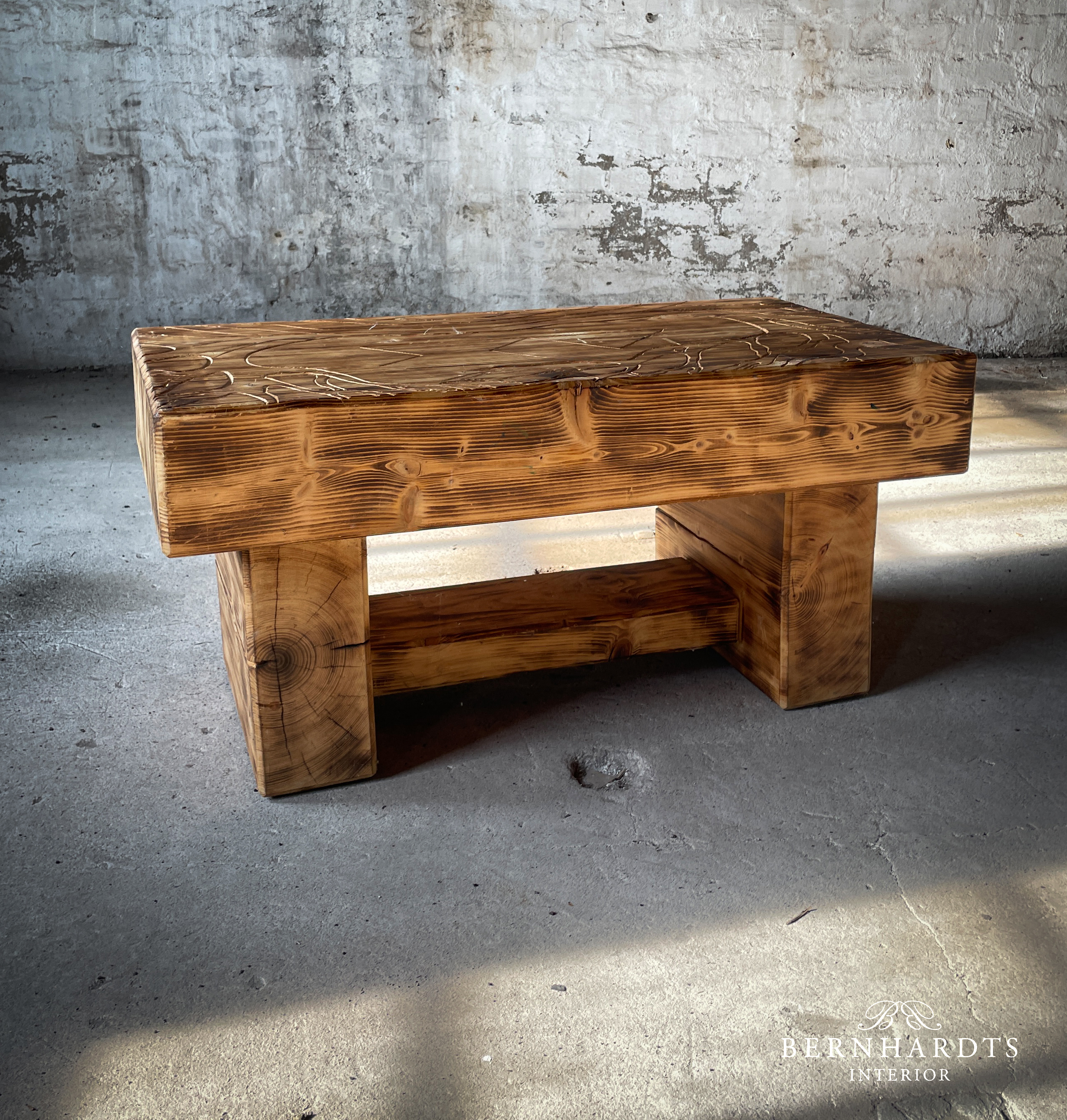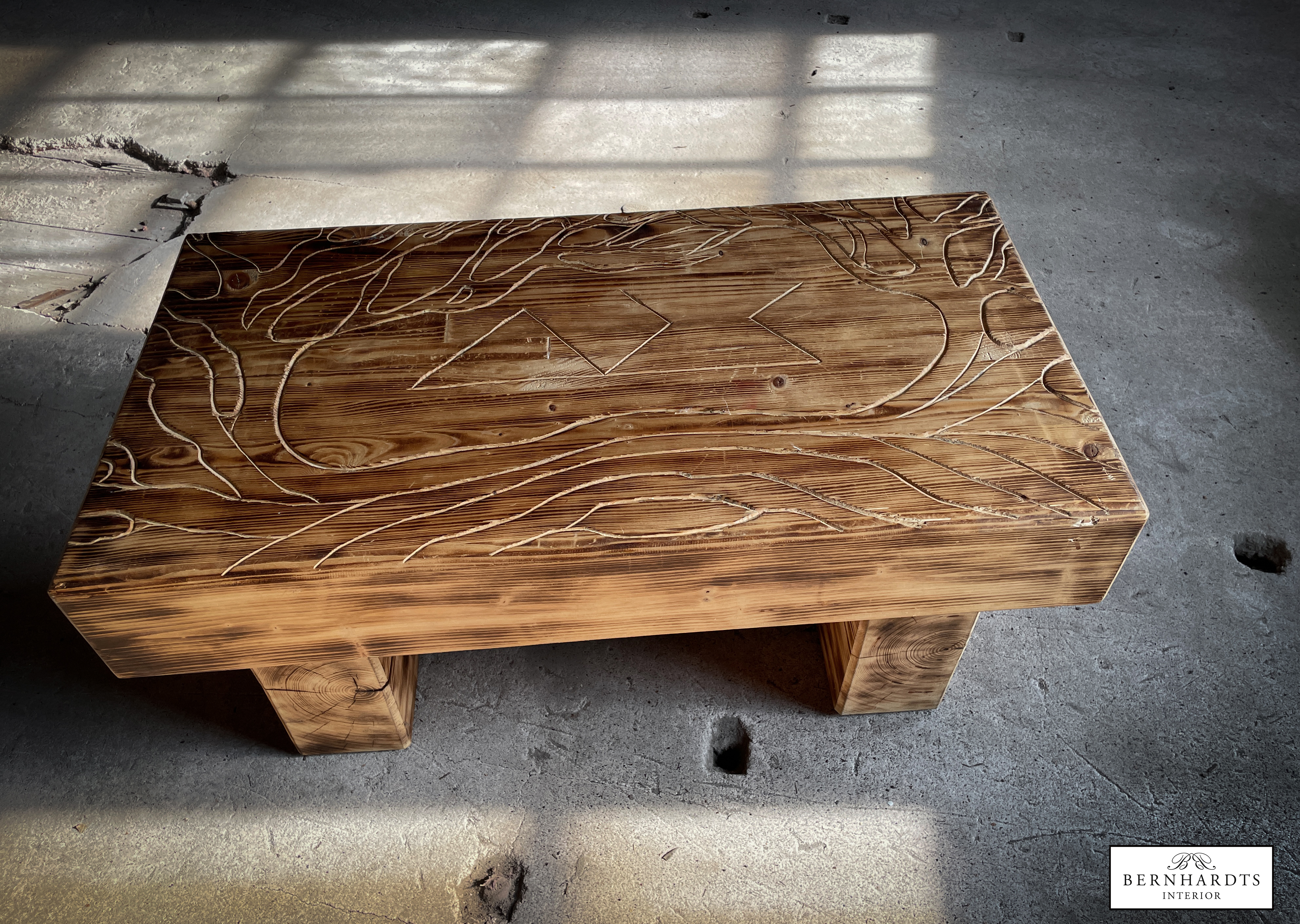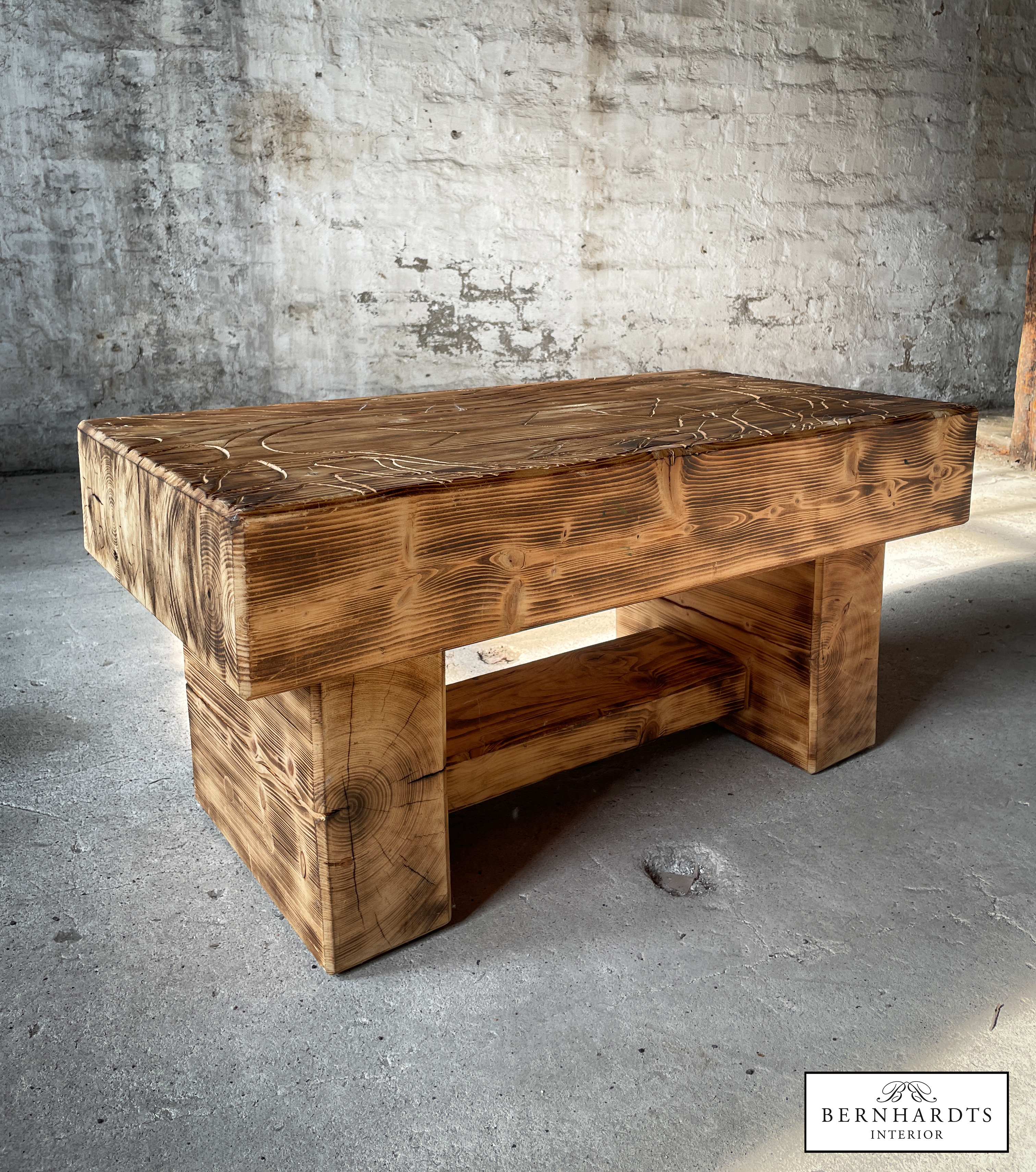 Handgefertigter, rustikaler Designer Tisch von Jan von Koss. Ein besonderer Tisch mit spirituellem Hintergrund und schöner Schnitzerei. Schamanismus und Runen sind in der nordischen Tradition eng miteinander verbunden, da Runen nicht nur Buchstaben, sondern auch magische Symbole sind, die in schamanischen Ritualen zur Weissagung, Heilung und zum Schutz eingesetzt werden. Der Lebensbaum, die Binderune Raidho, Pethro und Wunjo sind im Tisch verarbeitet. Der Tisch wurde aus Fichte gearbeitet und geflammt und erhält somit auch eine besondere Patina Optik, die in modernen oder Rustikalen Einrichtungsstilen besonders zur Geltung kommt. Positive Energie wird somit ins Haus eingeladen und schützt den Besitzer.