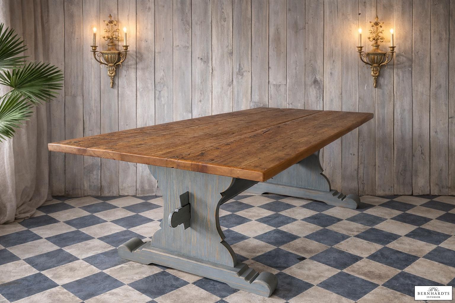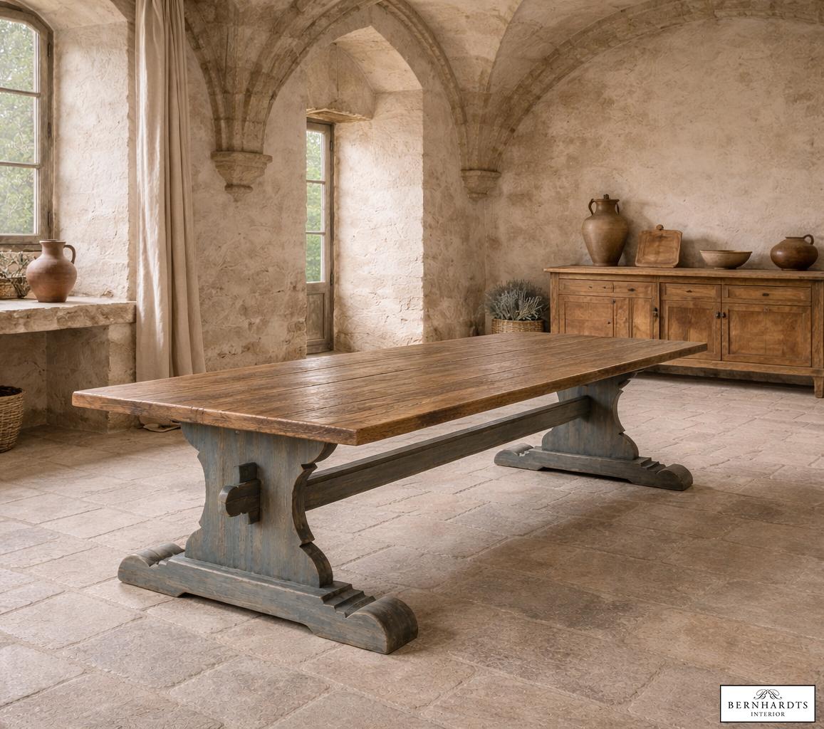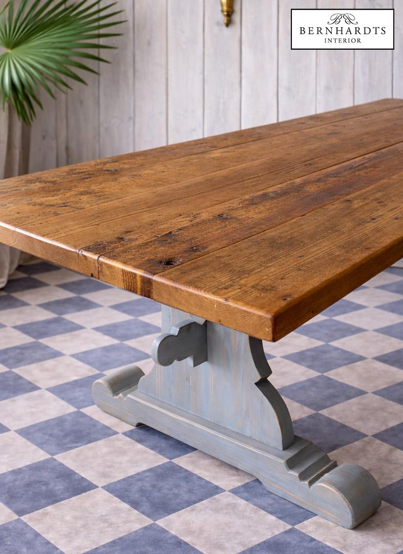 Dieser außergewöhnliche Wangentisch ist eine Hommage an die großen Refektoriumstische europäischer Klöster und Herrensitze. In der Traditions-Werkstatt von Siggi Günther entstand dieses Möbelstück in aufwendiger Handarbeit nach historischem Vorbild und verbindet traditionelle Tischlerkunst mit authentischer Materialgeschichte.