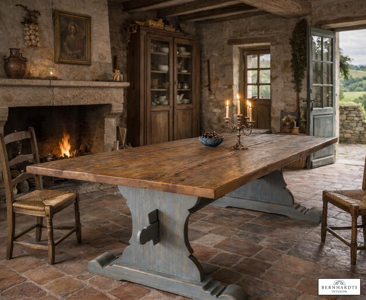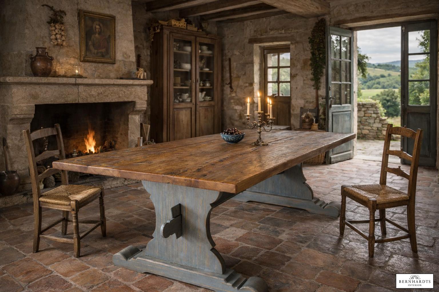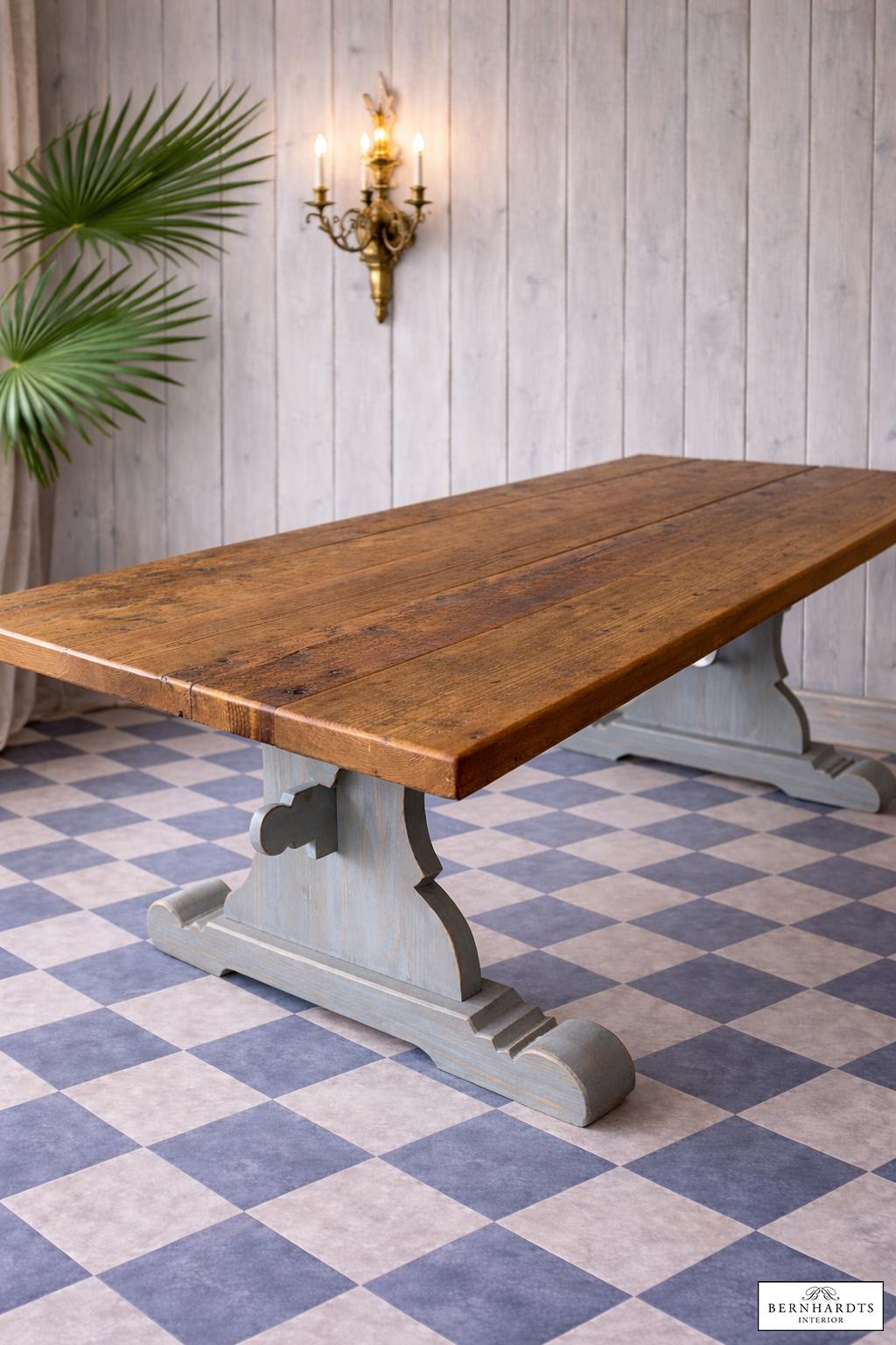 Dieser außergewöhnliche Wangentisch ist eine Hommage an die großen Refektoriumstische europäischer Klöster und Herrensitze. In der Traditions-Werkstatt von Siggi Günther entstand dieses Möbelstück in aufwendiger Handarbeit nach historischem Vorbild und verbindet traditionelle Tischlerkunst mit authentischer Materialgeschichte.