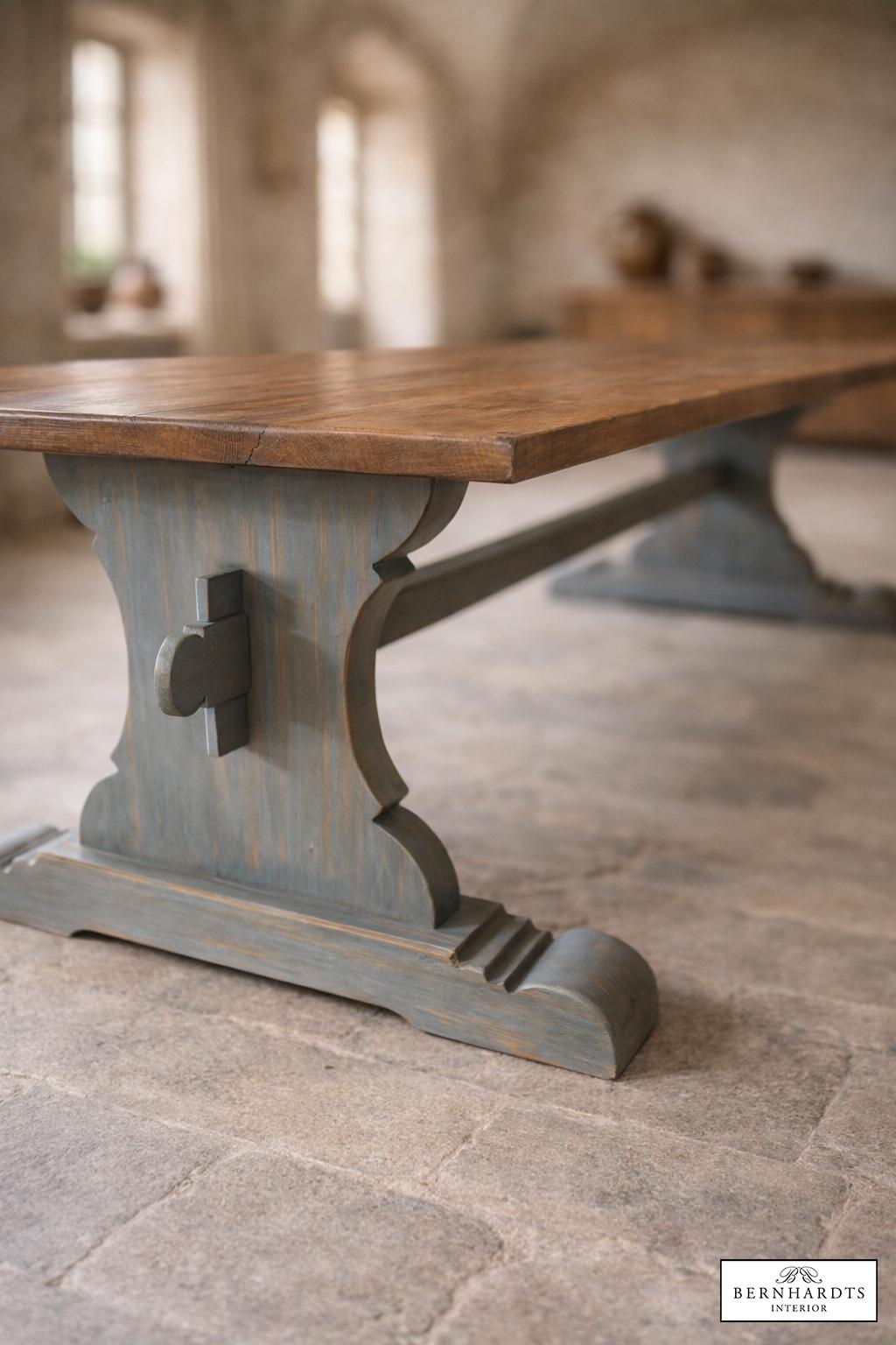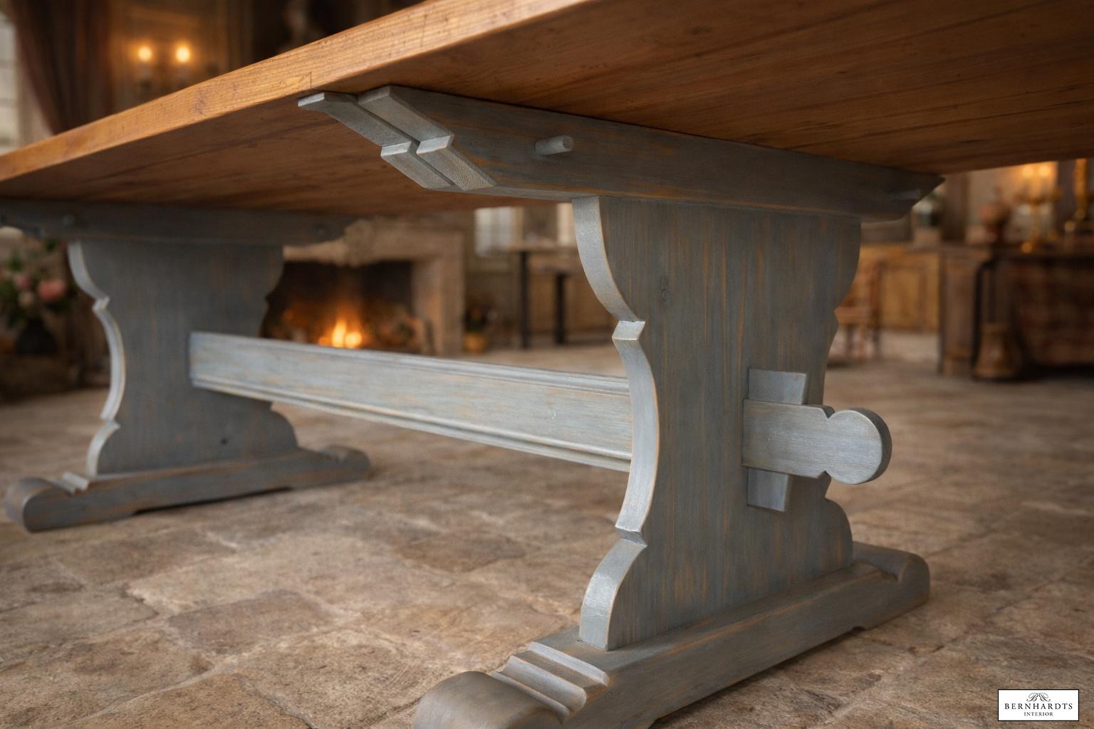 Der kraftvolle Wangenfuß folgt der klassischen Form historischer Refektoriumstische. Seine Oberfläche wurde in traditioneller Fassmalerarbeit von uns gestalte. In seinen Proportionen vereint der Tisch architektonische Klarheit, handwerkliche Präzision und die ruhige Würde historischer Möbel. Seine Präsenz macht ihn zum Mittelpunkt eines Raumes – sei es als großer Esstisch, als repräsentativer Tisch in einer Galerie oder als charaktervolles Einzelstück in einem anspruchsvollen Interieur.