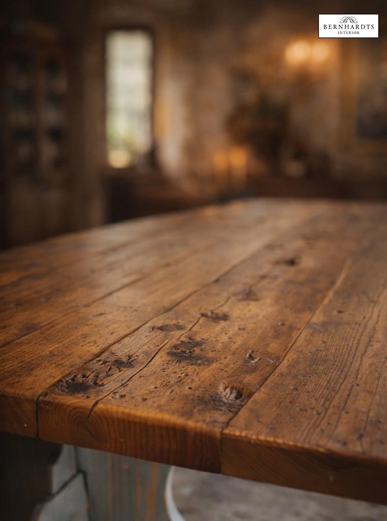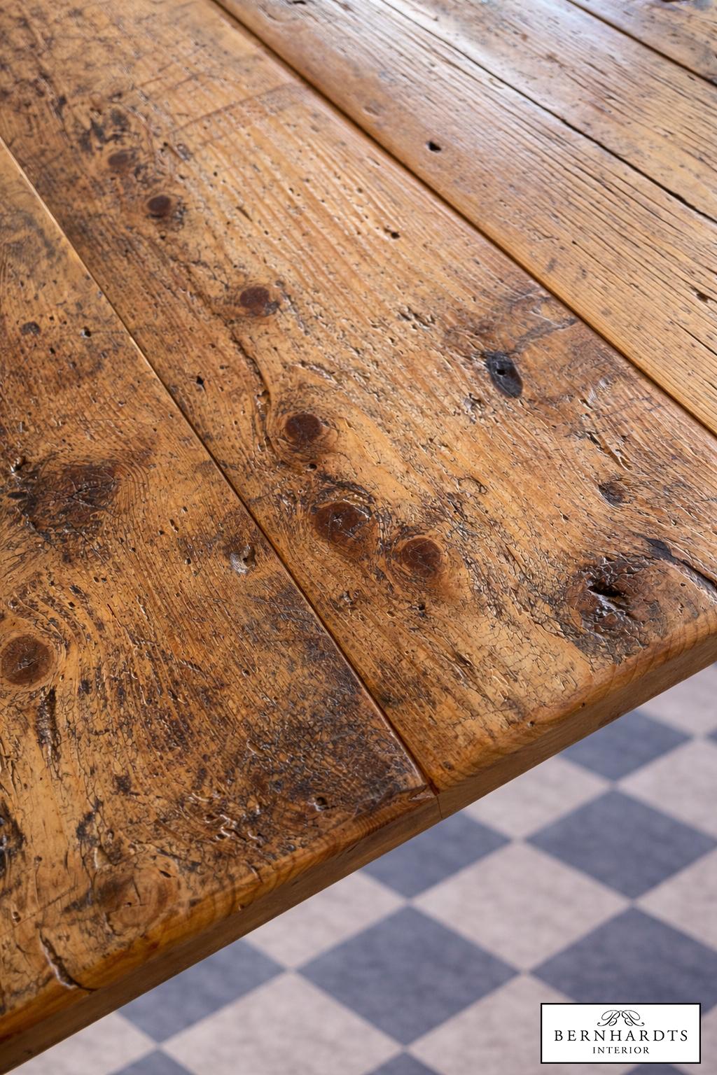 Die großzügige Tischplatte wurde aus über 100 Jahre alter Fichte gefertigt. Das Holz stammt aus historischen Beständen und bewahrt seine gewachsene Struktur mit charaktervollen Astbildern, Spuren früherer Nutzung und einer warmen, tiefen Patina. Jede Bohle erzählt ihre eigene Geschichte – kein Detail wirkt inszeniert, sondern ist das Ergebnis natürlicher Alterung und sorgfältiger Auswahl.