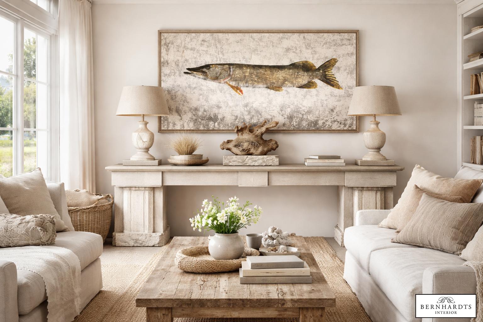 Ein Interieur, das die stille Raffinesse der Nordsee einfängt: lichtdurchflutet, ruhig und von natürlicher Noblesse geprägt. Im Mittelpunkt steht das großformatige Fischmotiv – eine Hommage an die maritime Kultur Sylts, interpretiert in einer modernen, kunstvollen Ästhetik.