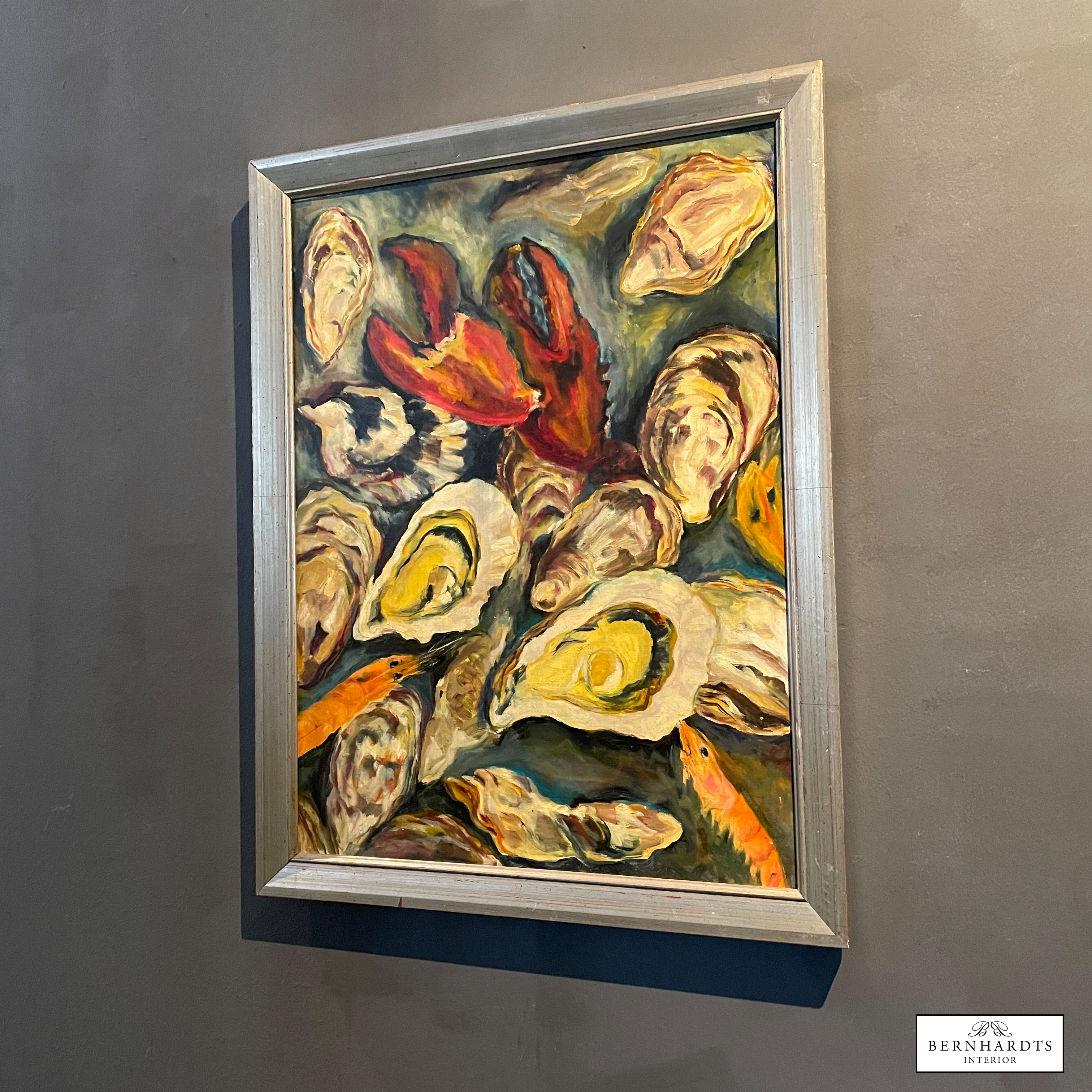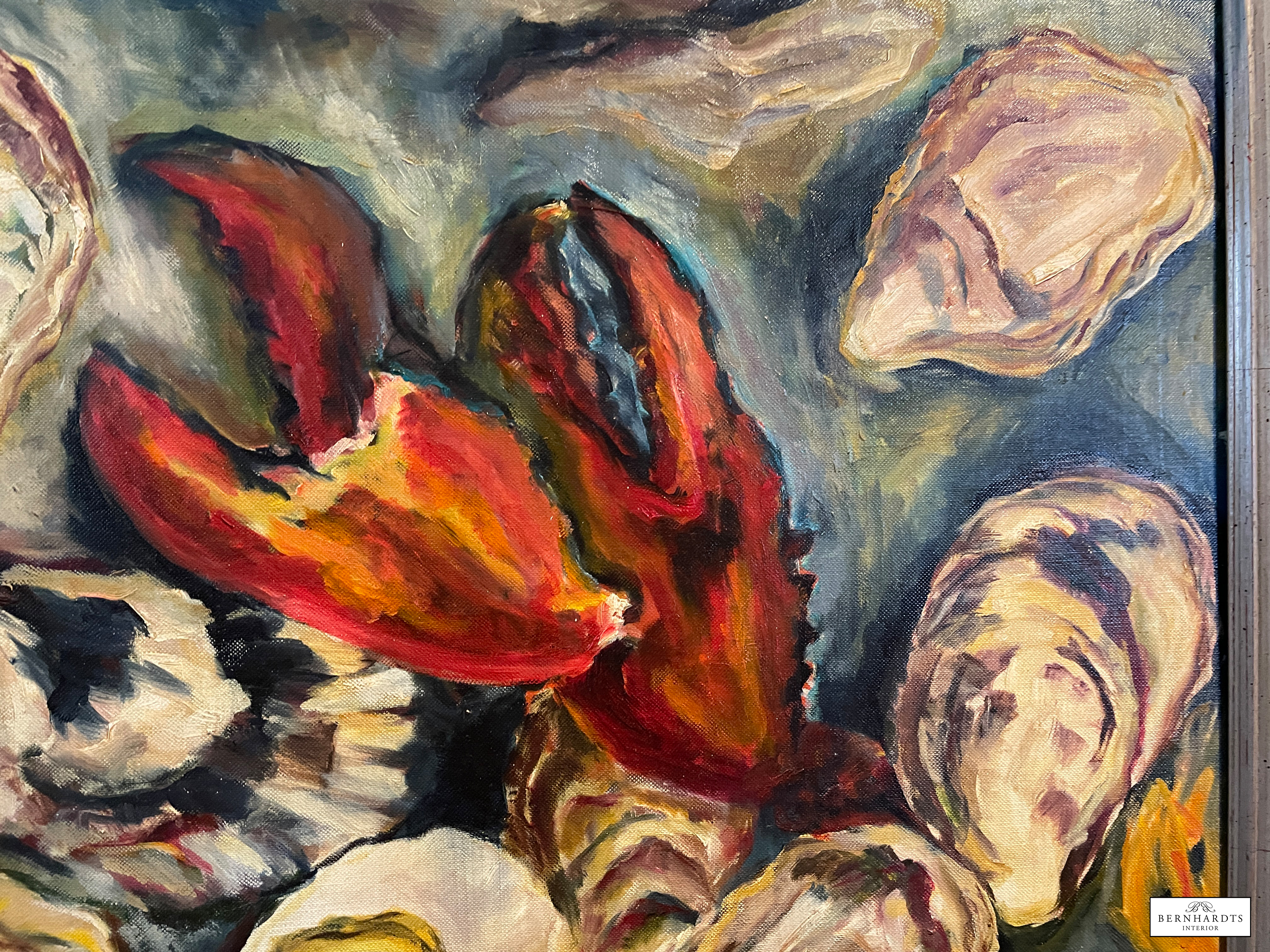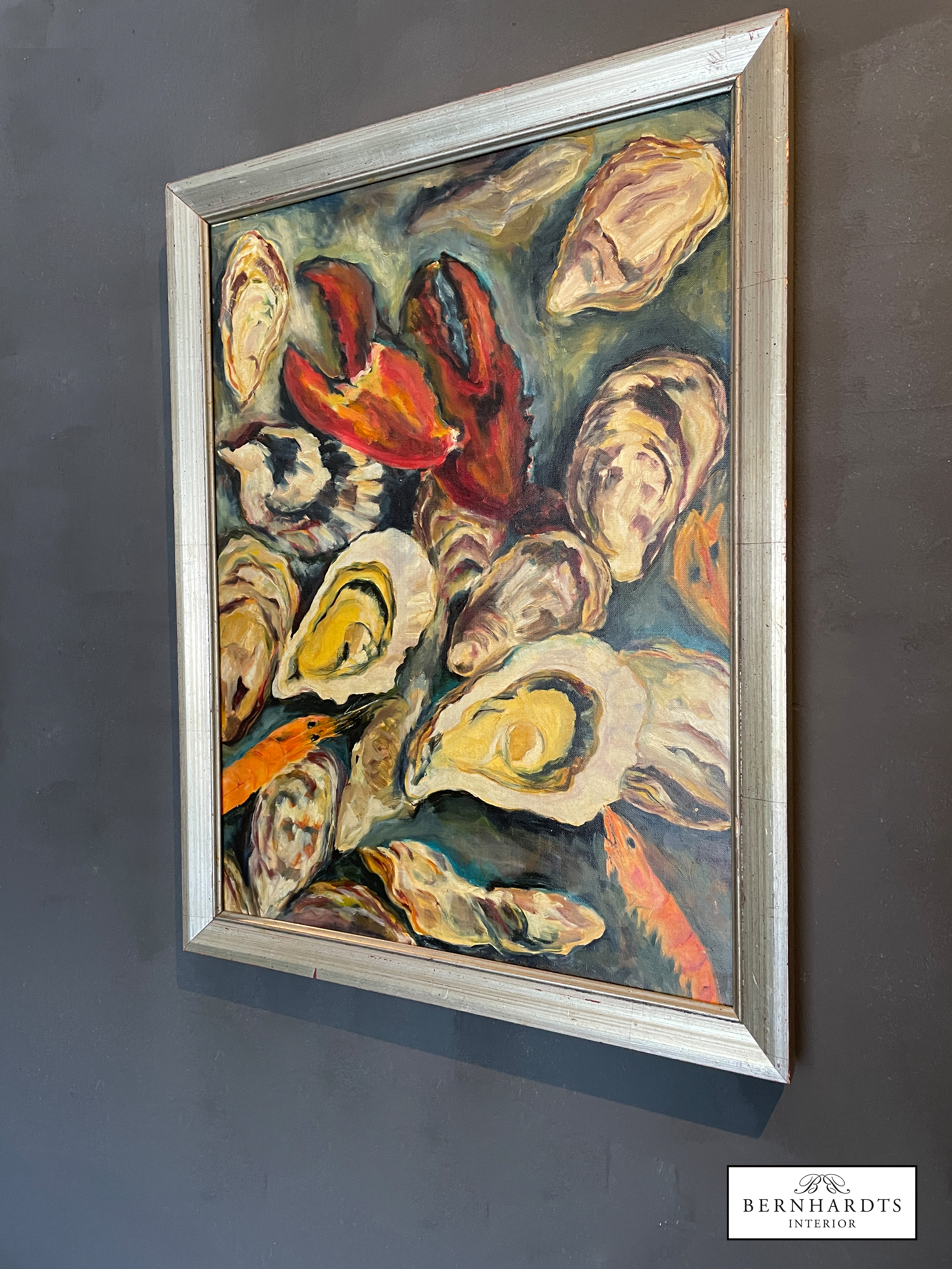 Antikes, meisterhaft gemaltes Ölbild auf Karton mit farbenfrohen Meeresdelikatessen. Der Künstler ist unbekannt und das Bild ist nicht signiert. Die Farbenpracht spricht für sich.
