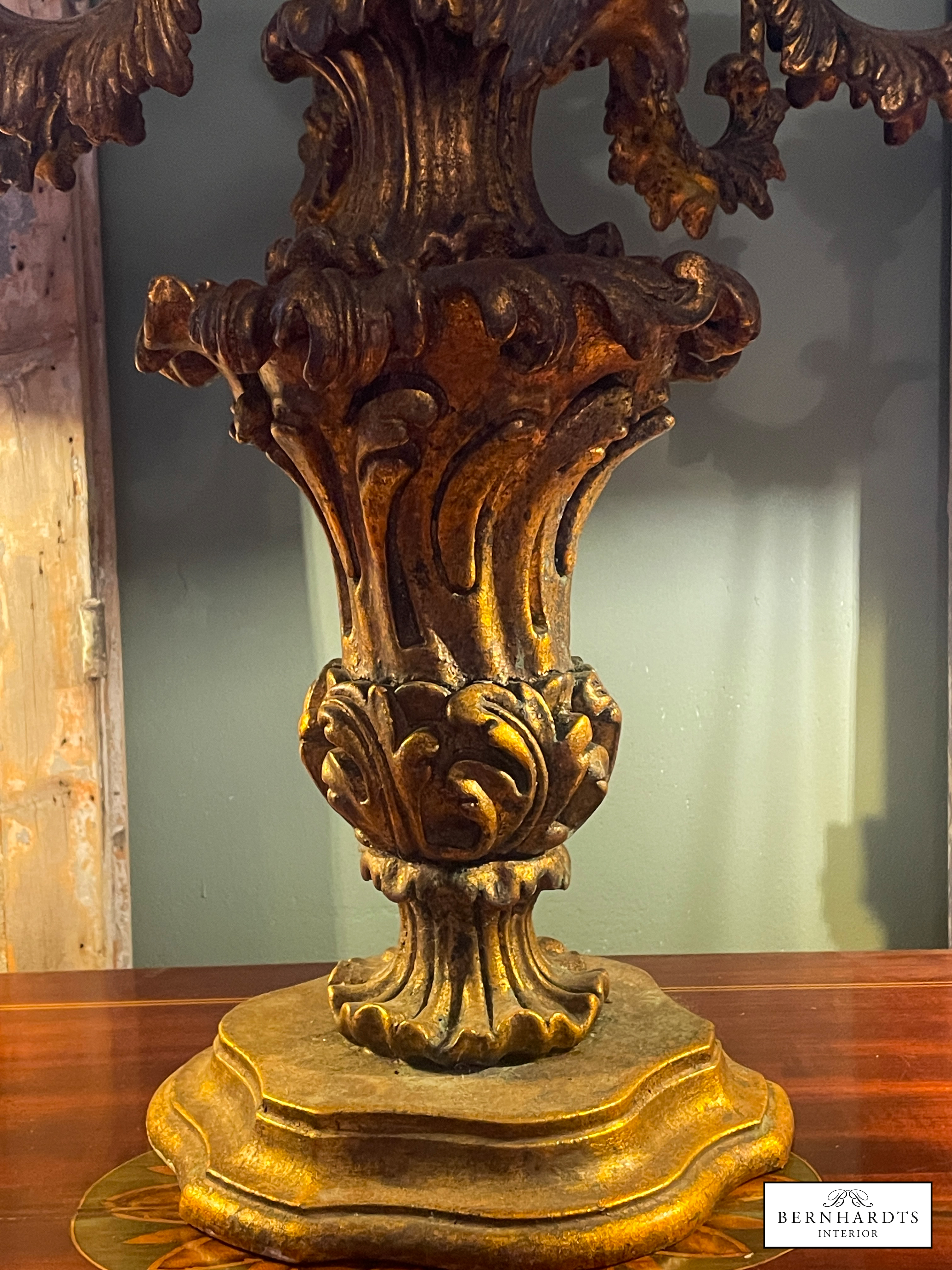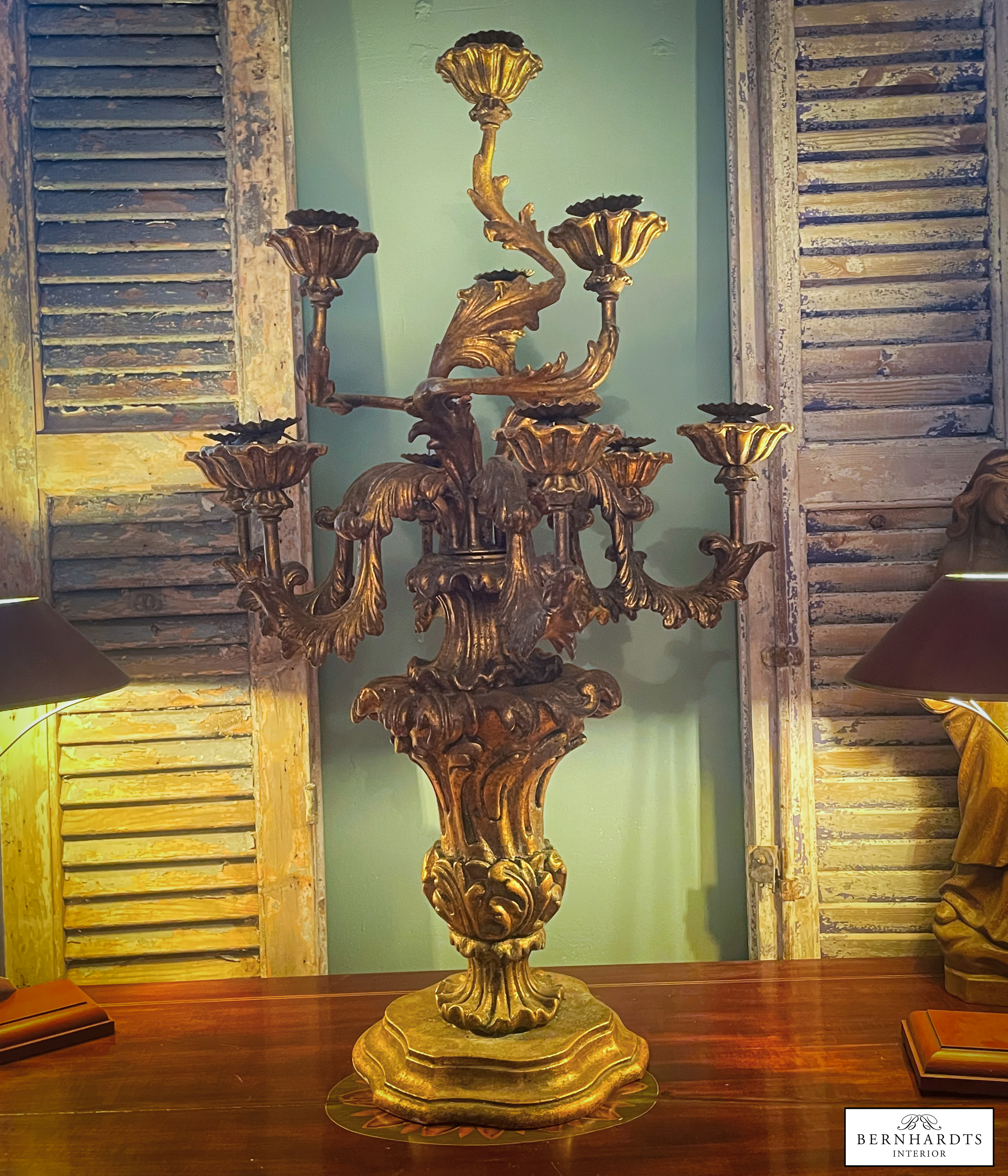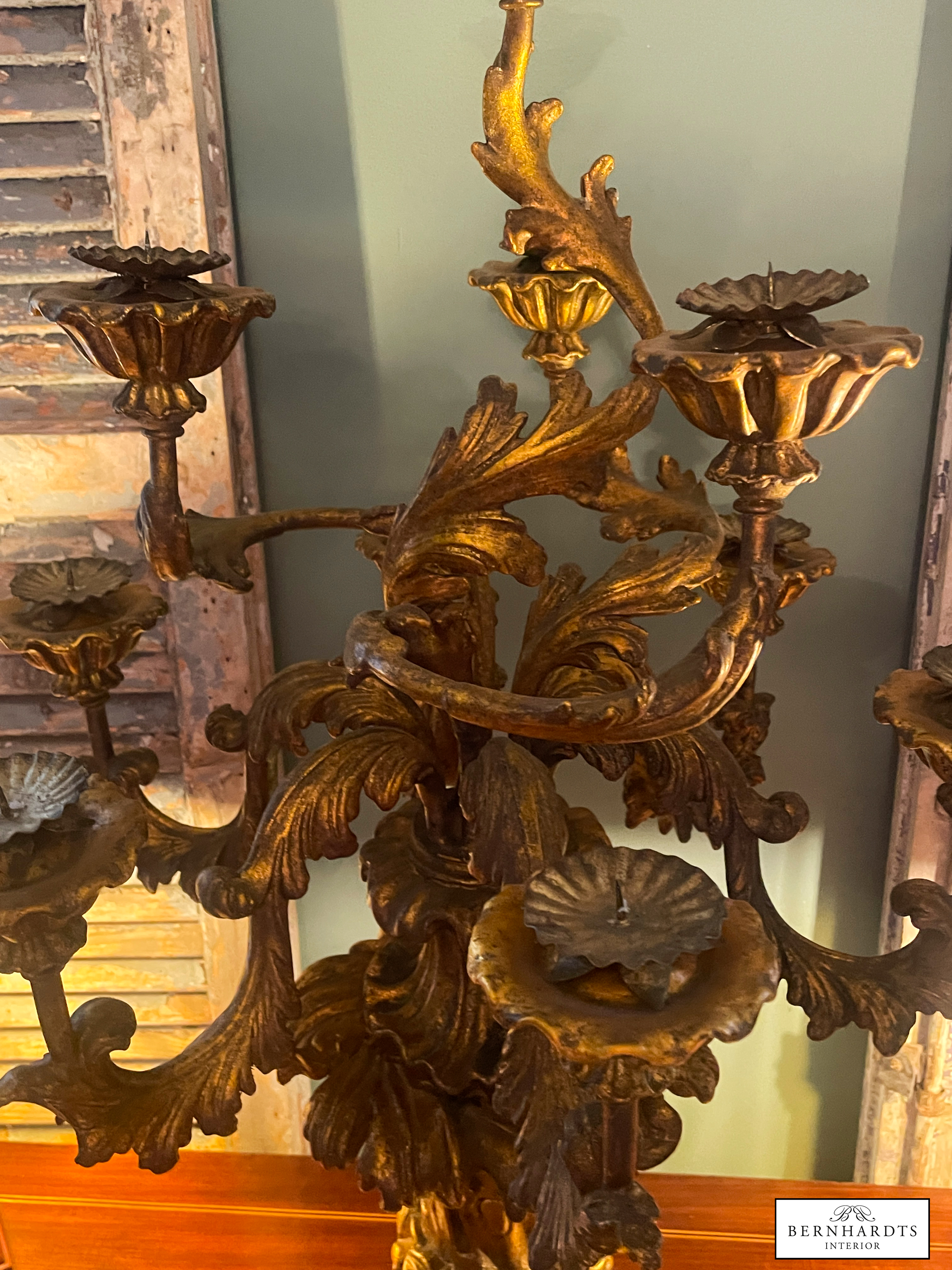 Ein Original Barocker, Handgeschnitzter Sakraler Kerzenleuchter. um 1790. Die Kombination aus echter Blattvergoldung, handgeschnitztem Lindenholz und der Patina, spricht für diese antike Original, denn es ist typischerweise etwas nachgedunkelt. Reich geschwungener Balusterfuss, Akantusblatt-Dekor, siebenarmiger Aufbau mit floralen Kerzentüllen.Er ist im kirchlichen Kontaxt gefertigt als Altar Kerzenständer im Raum Norditalien. Es handelt sich um ein Einzelstück. Am Fuss findet sich eine Verschraubung. Häufig hat man alte barocke Kirchenleuchter beim Übergang in den Privatbesitz von unten verschraubt um sie auf Sockeln zu fixieren. Der Fuss wurde später stabilisierend verschraubt. Solche Eingriffe sind rein technisch und kunsthistorisch nicht relevant. Die Bodenplatte zeigt unregelmässige Oxidationsflecken, die typisch sind. Dieser Leuchter hat einen Sammlerwert.
