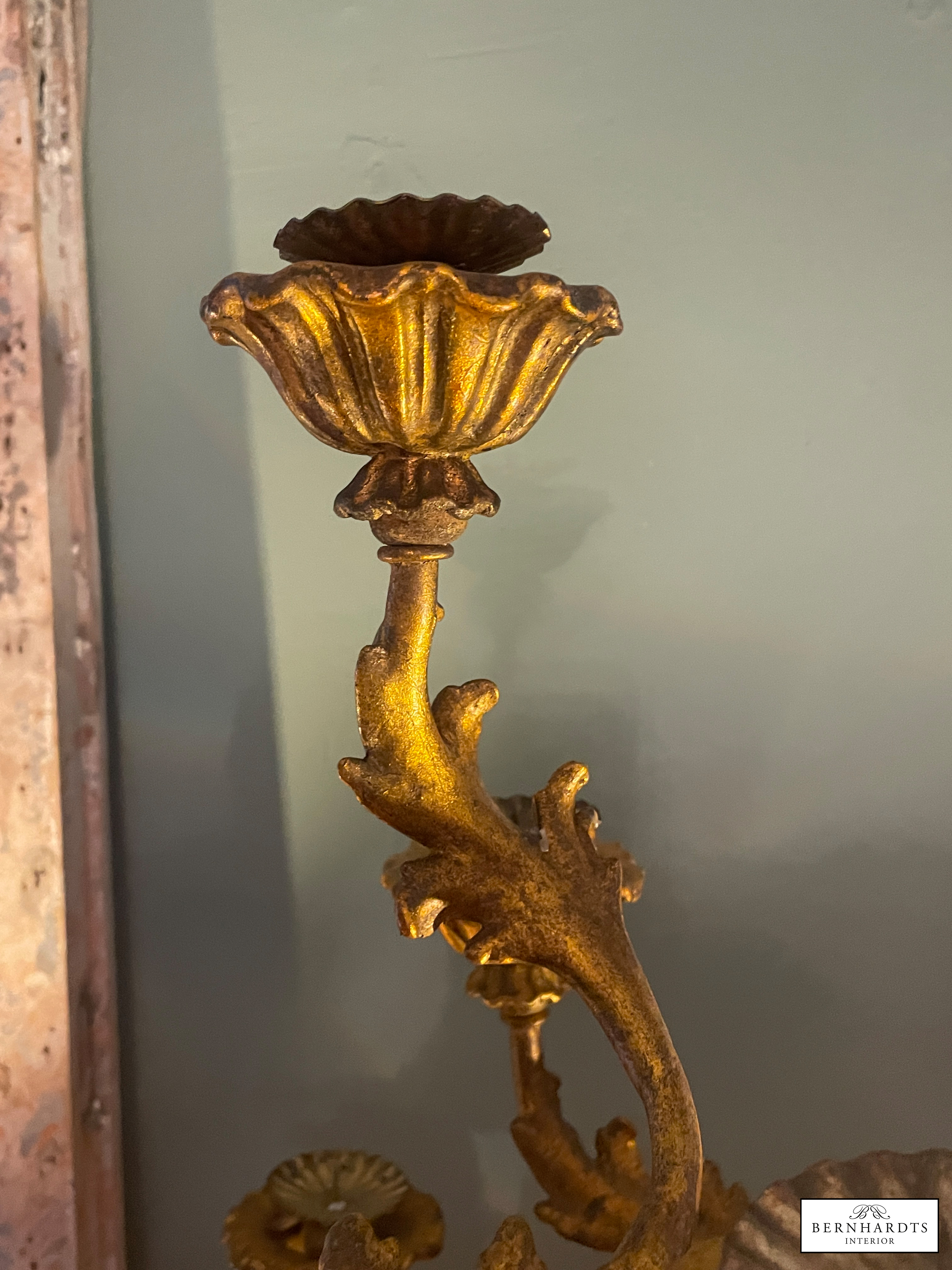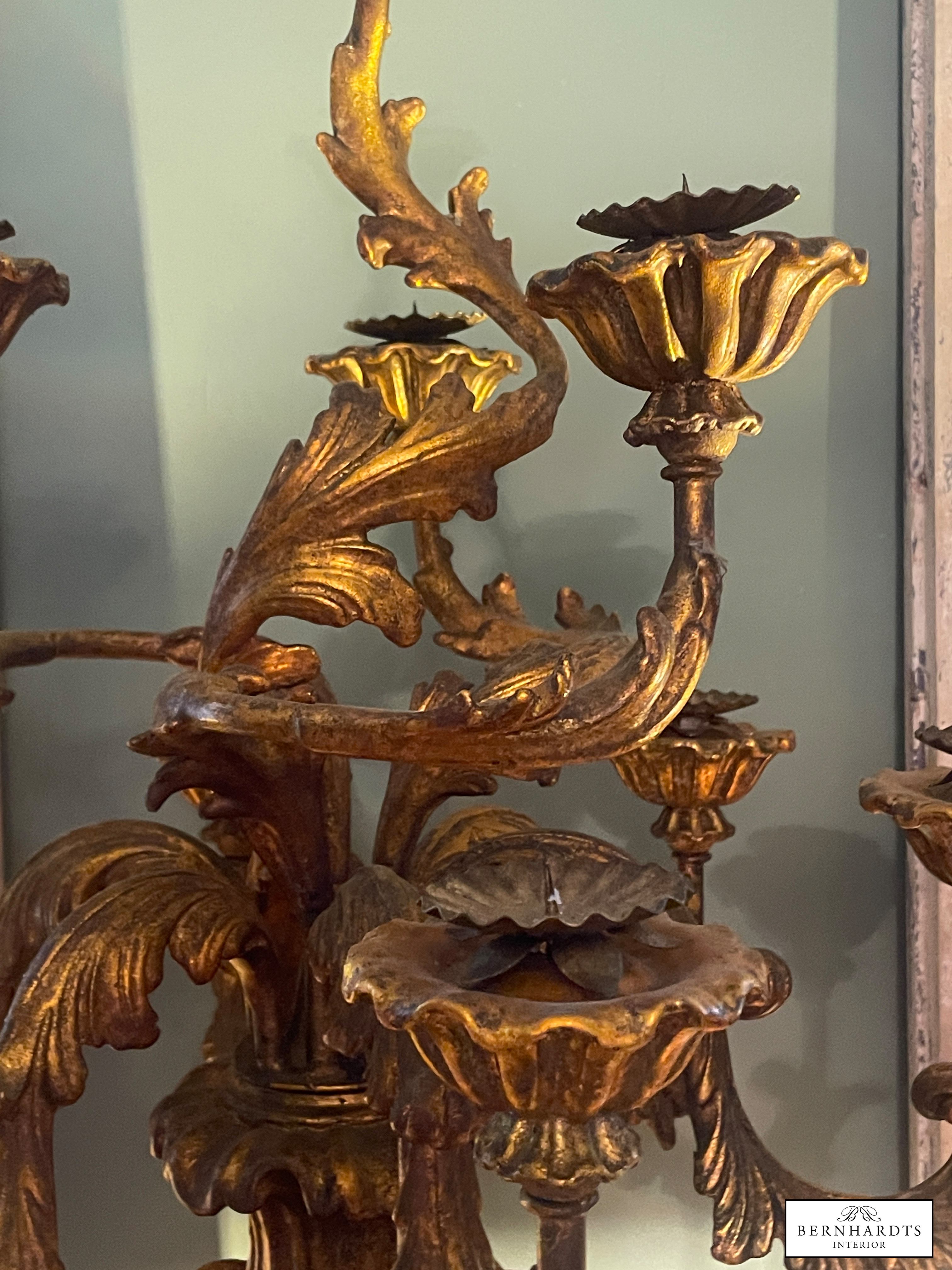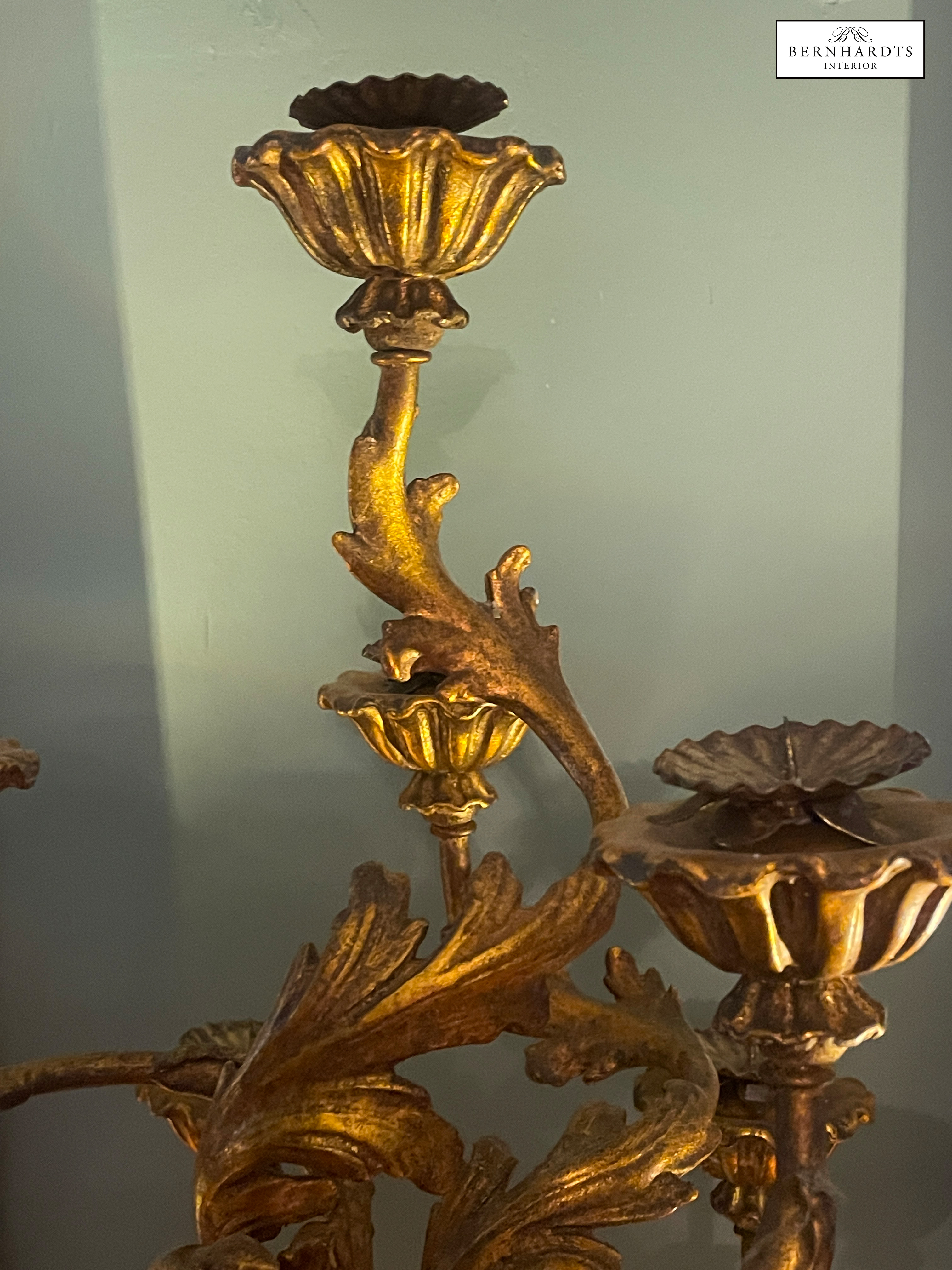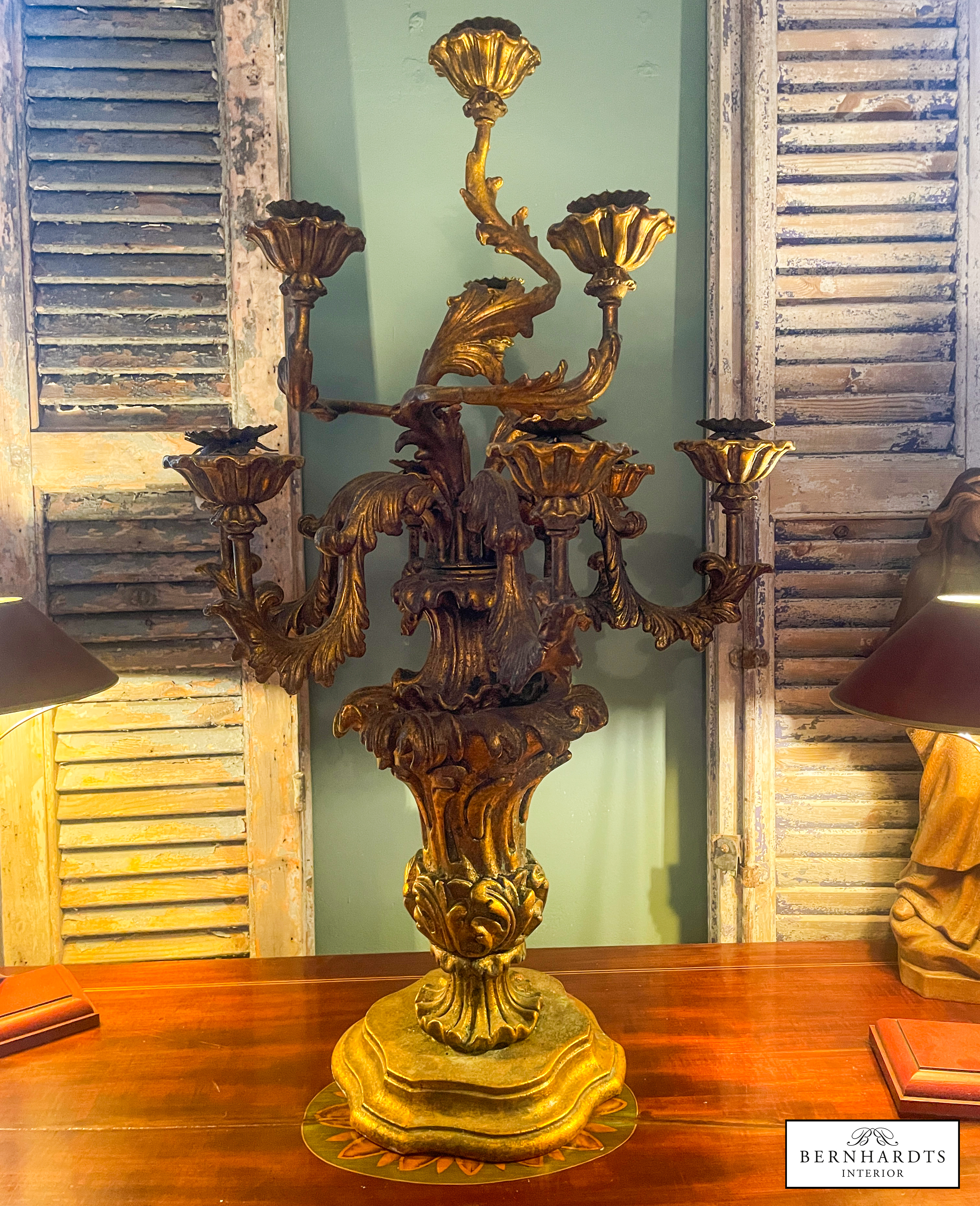 Ein Original Barocker, Handgeschnitzter Sakraler Kerzenleuchter. um 1790. Die Kombination aus echter Blattvergoldung, handgeschnitztem Lindenholz und der Patina, spricht für diese antike Original, denn es ist typischerweise etwas nachgedunkelt. Reich geschwungener Balusterfuss, Akantusblatt-Dekor, siebenarmiger Aufbau mit floralen Kerzentüllen.Er ist im kirchlichen Kontaxt gefertigt als Altar Kerzenständer im Raum Norditalien. Es handelt sich um ein Einzelstück. Am Fuss findet sich eine Verschraubung. Häufig hat man alte barocke Kirchenleuchter beim Übergang in den Privatbesitz von unten verschraubt um sie auf Sockeln zu fixieren. Der Fuss wurde später stabilisierend verschraubt. Solche Eingriffe sind rein technisch und kunsthistorisch nicht relevant. Die Bodenplatte zeigt unregelmässige Oxidationsflecken, die typisch sind. Dieser Leuchter hat einen Sammlerwert.