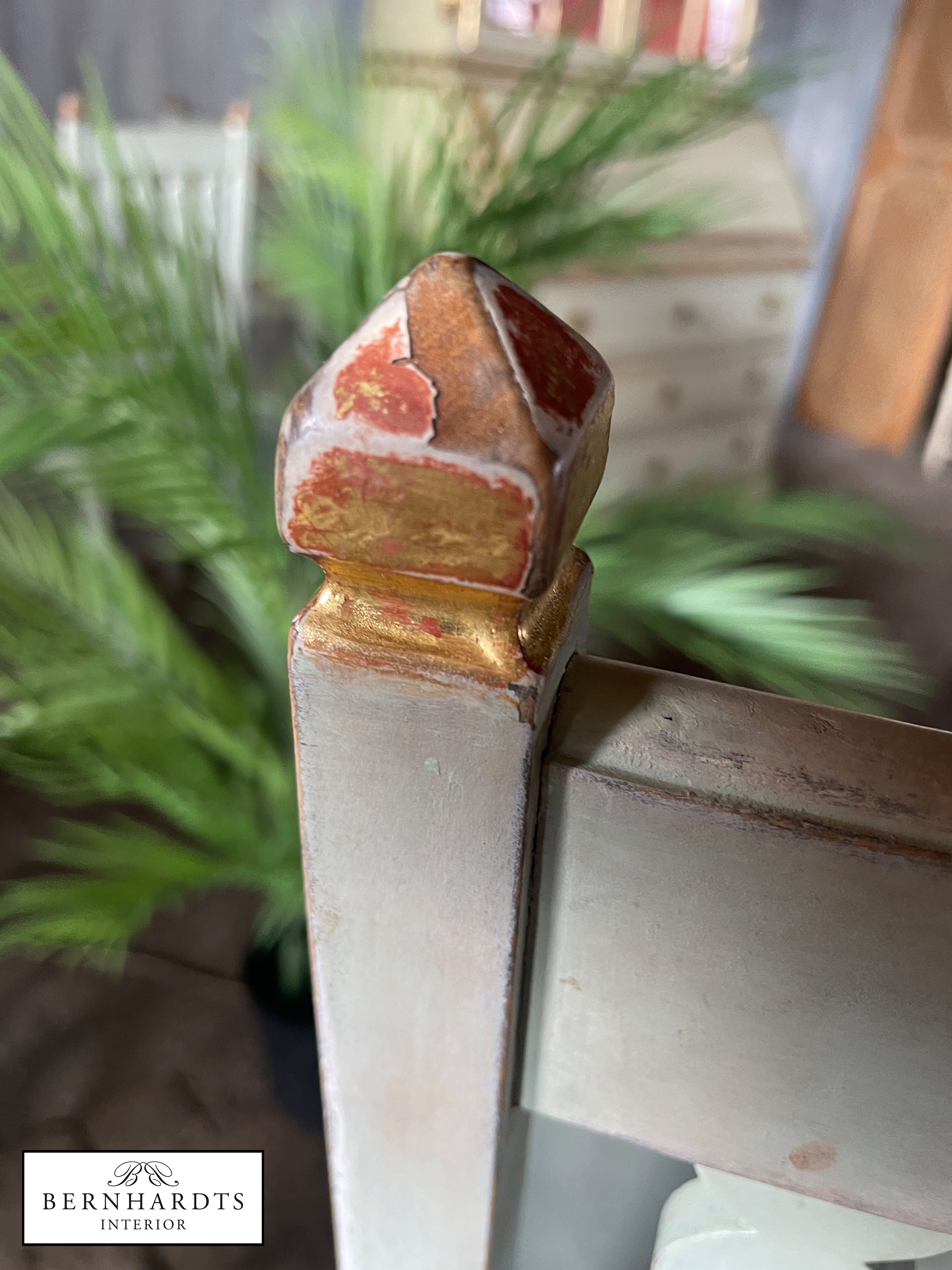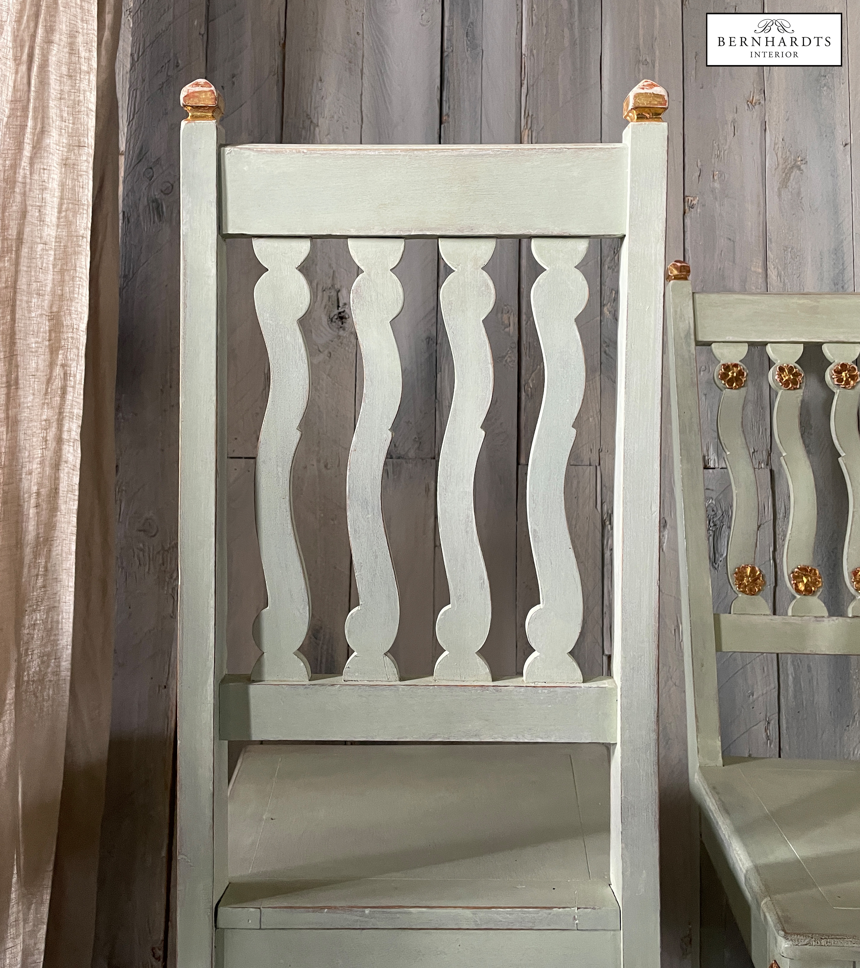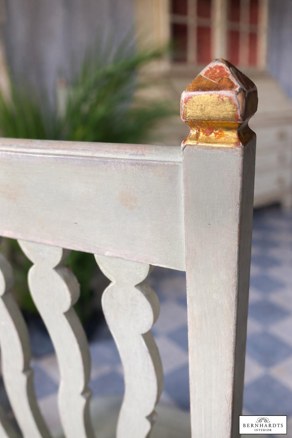 Die schlanken Proportionen und geschwungenen Streben zitieren die klare Formensprache des Gustavianischen Klassizismus, während fein ausgearbeitete Rosetten und Abschlüsse durch traditionelle Vergoldung mit sichtbarem Bolus-Untergrund akzentuiert wurden. Die sanfte Patina lässt die Möbel wie über Jahrzehnte gewachsen erscheinen und verleiht ihnen jene stille Noblesse, die den schwedischen Landhausstil international so begehrt macht.