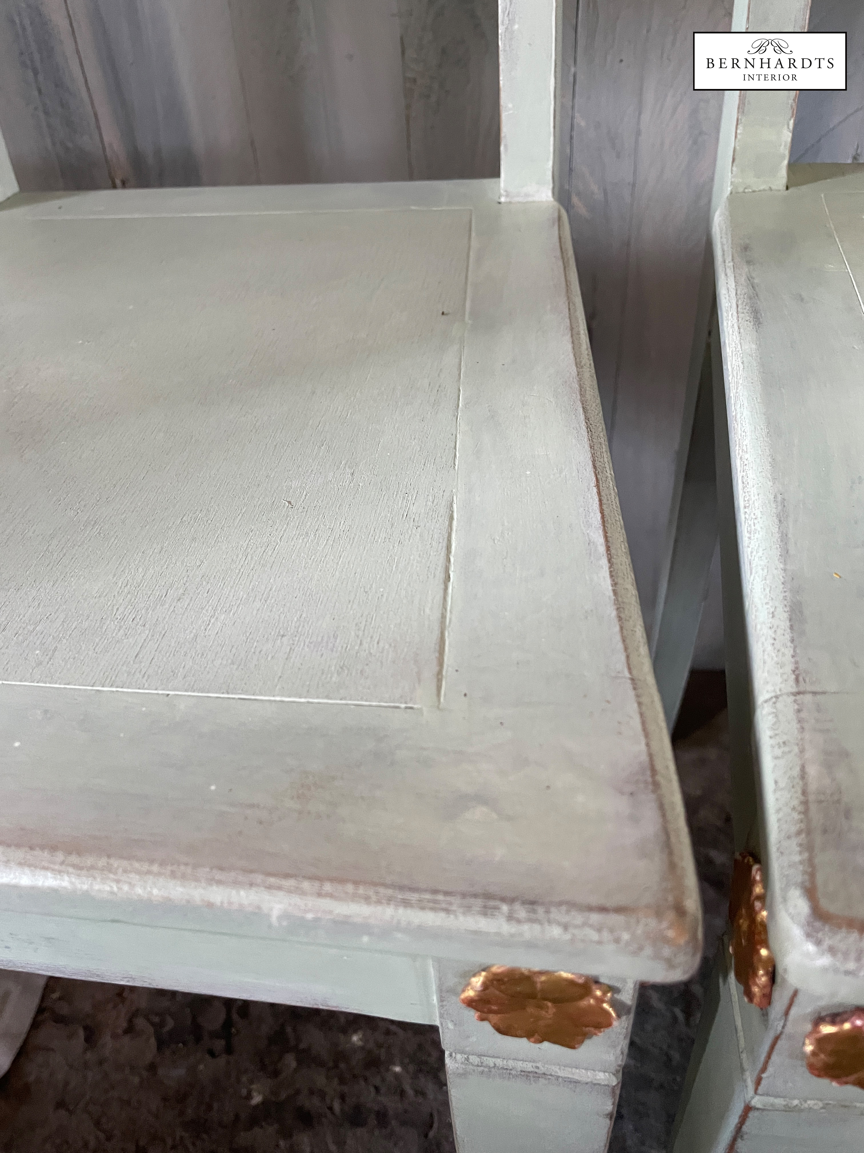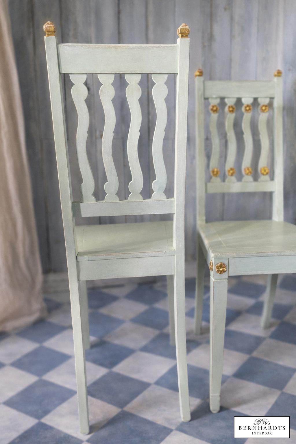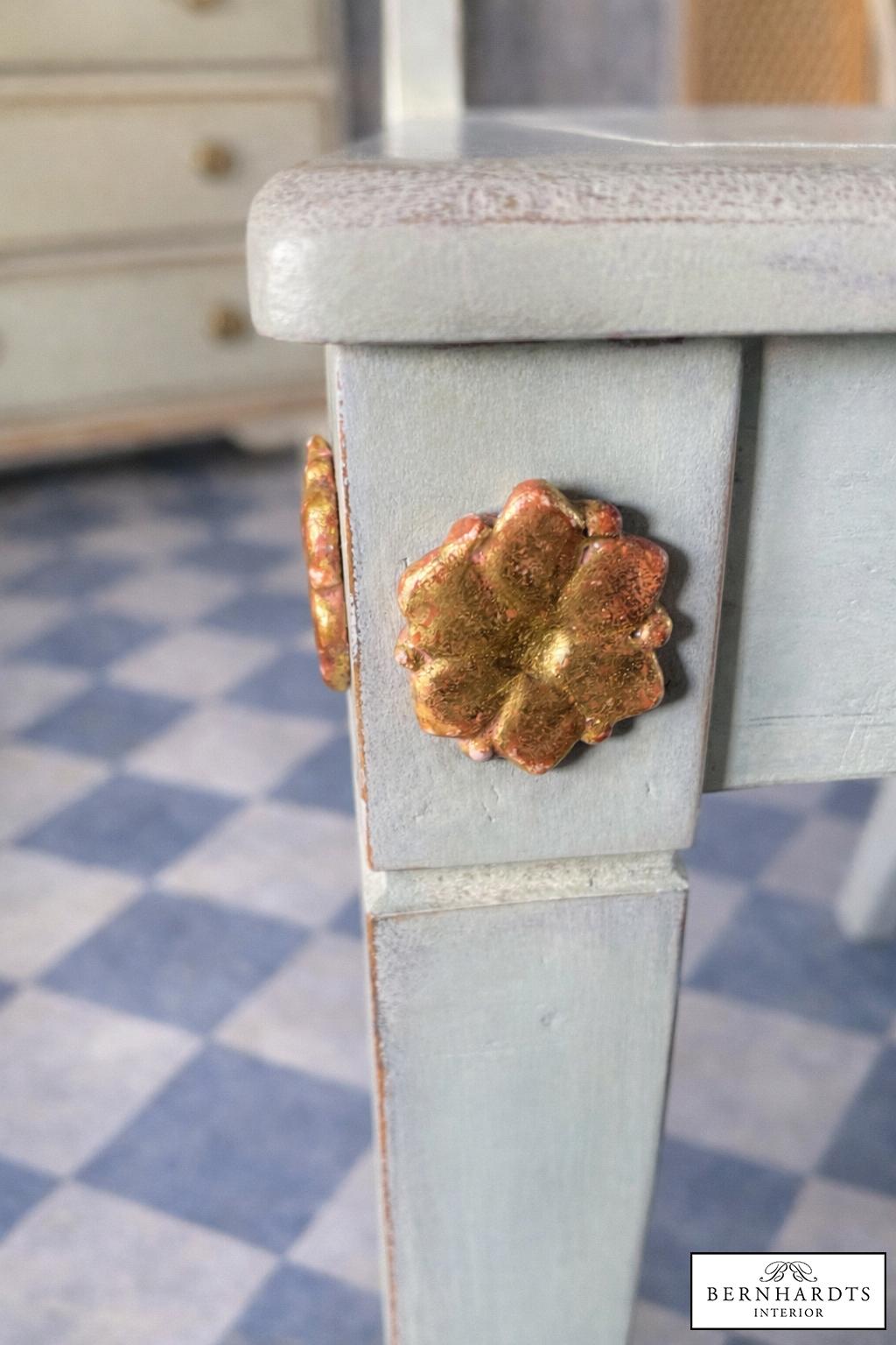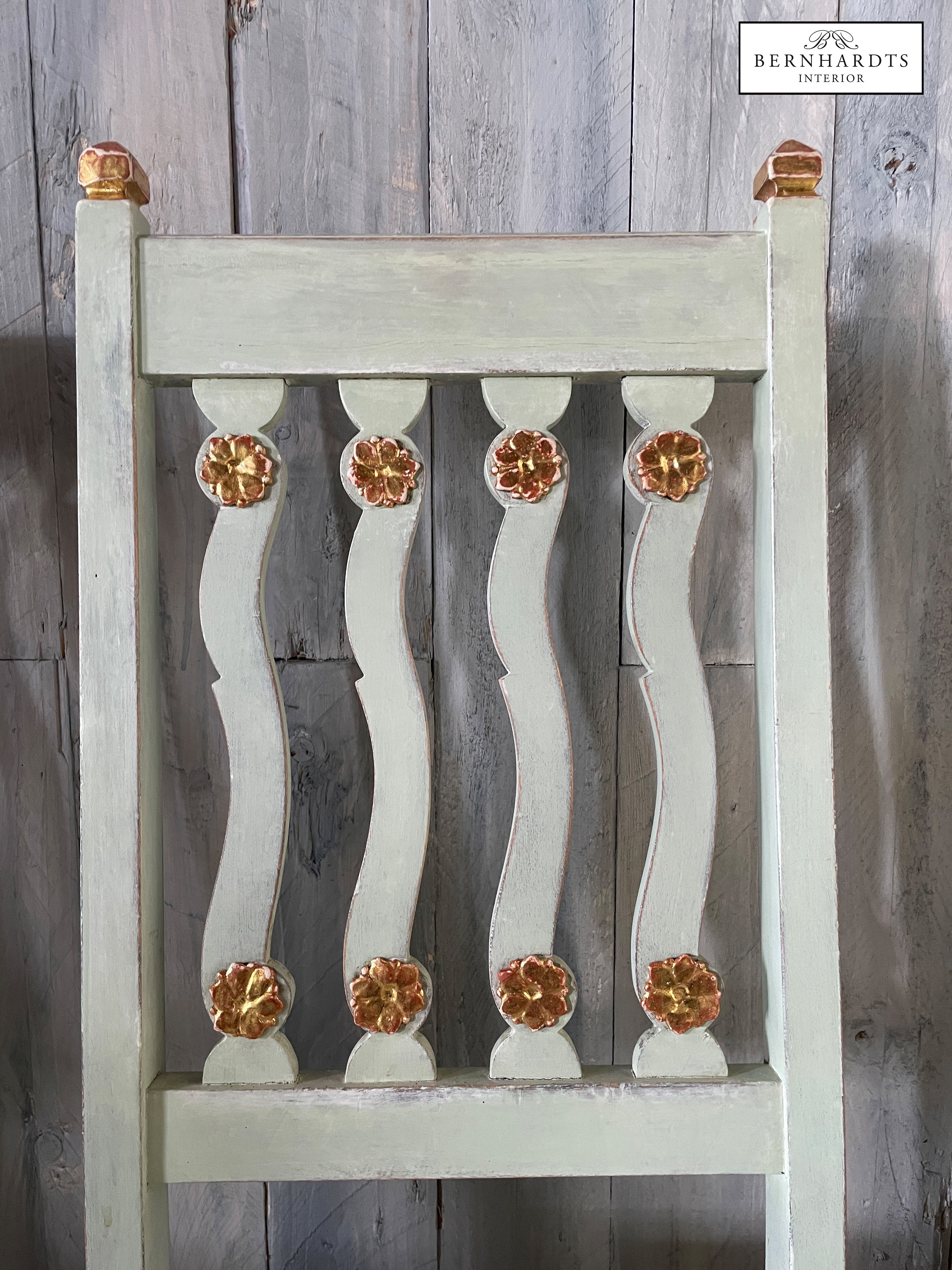 Die schlanken Proportionen und geschwungenen Streben zitieren die klare Formensprache des Gustavianischen Klassizismus, während fein ausgearbeitete Rosetten und Abschlüsse durch traditionelle Vergoldung mit sichtbarem Bolus-Untergrund akzentuiert wurden. Die sanfte Patina lässt die Möbel wie über Jahrzehnte gewachsen erscheinen und verleiht ihnen jene stille Noblesse, die den schwedischen Landhausstil international so begehrt macht.