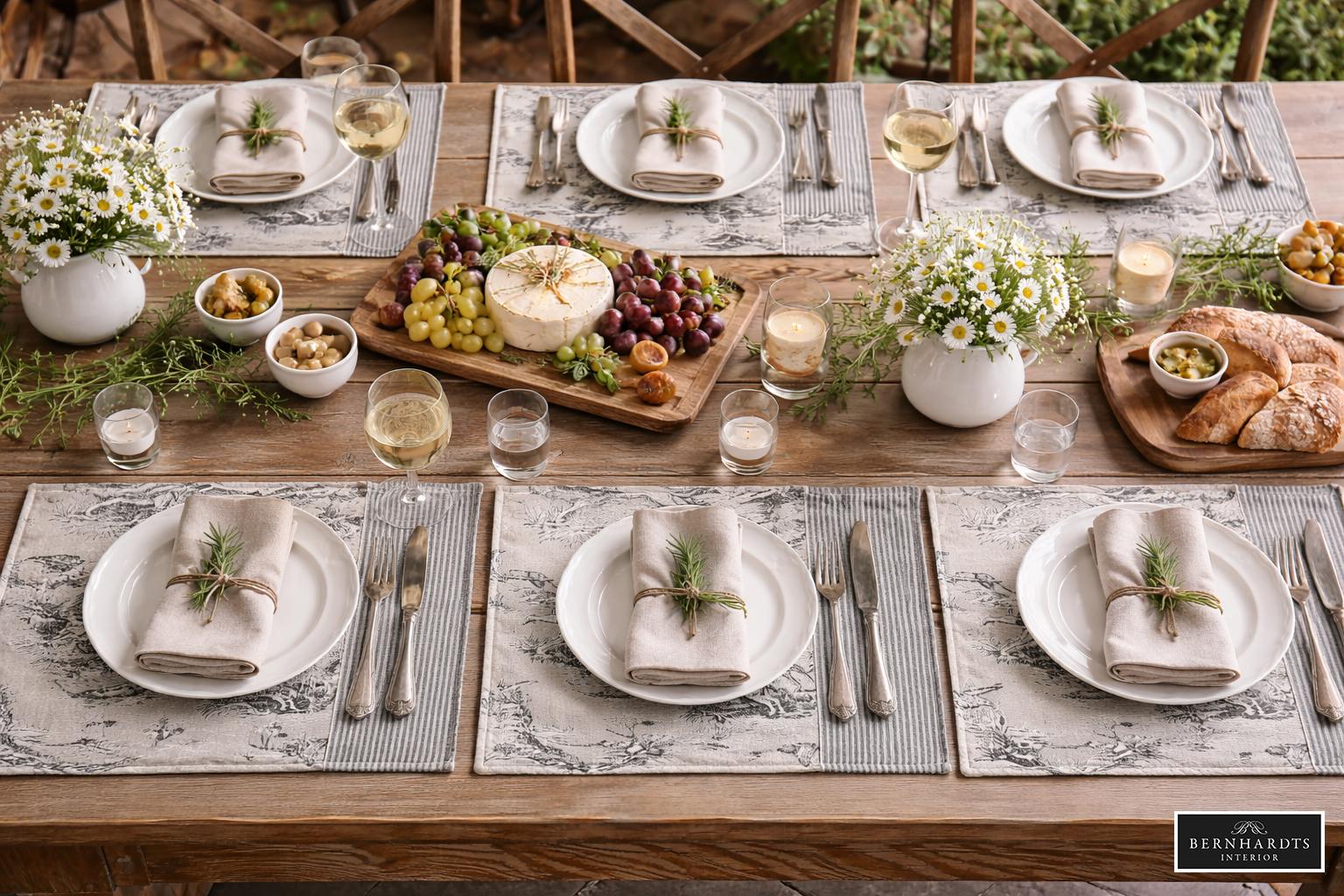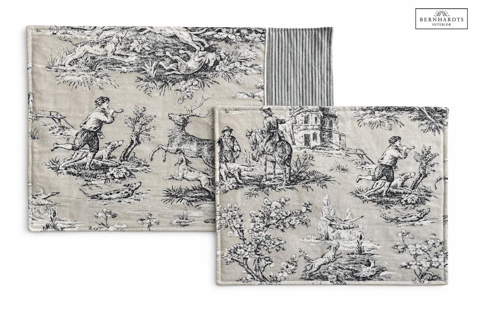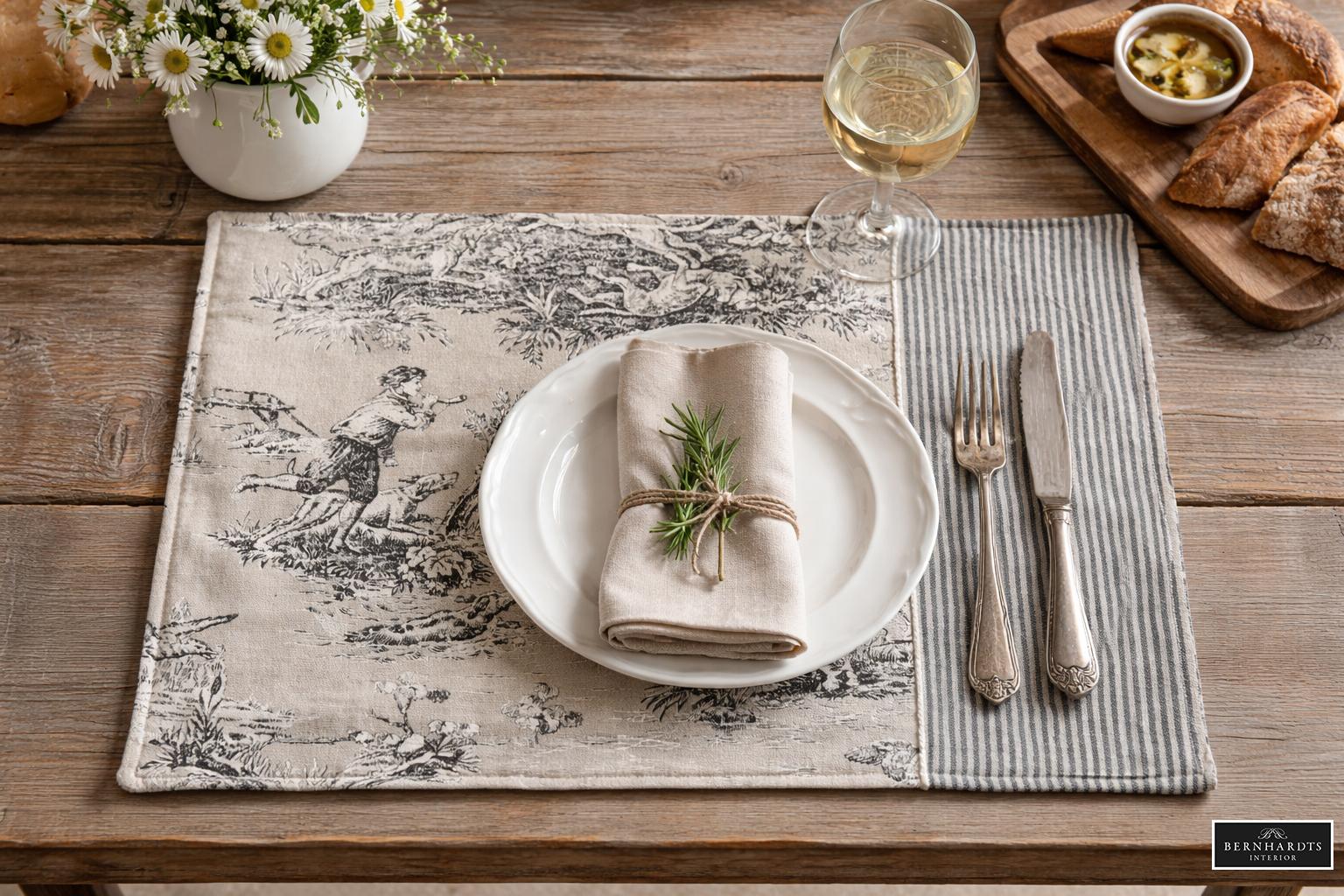 Die Rückseite zeigt ein klassisches französisches Toile-de-Jouy-Motiv mit detailreichen Jagdszenen und idyllischen Landschaften – inspiriert vom traditionellen Landhausstil Frankreichs. Die Vorderseite ist dezent gestreift und ermöglicht eine zweite, ruhigere Optik. So lassen sich die Sets je nach Tischdekoration oder Anlass flexibel einsetzen.